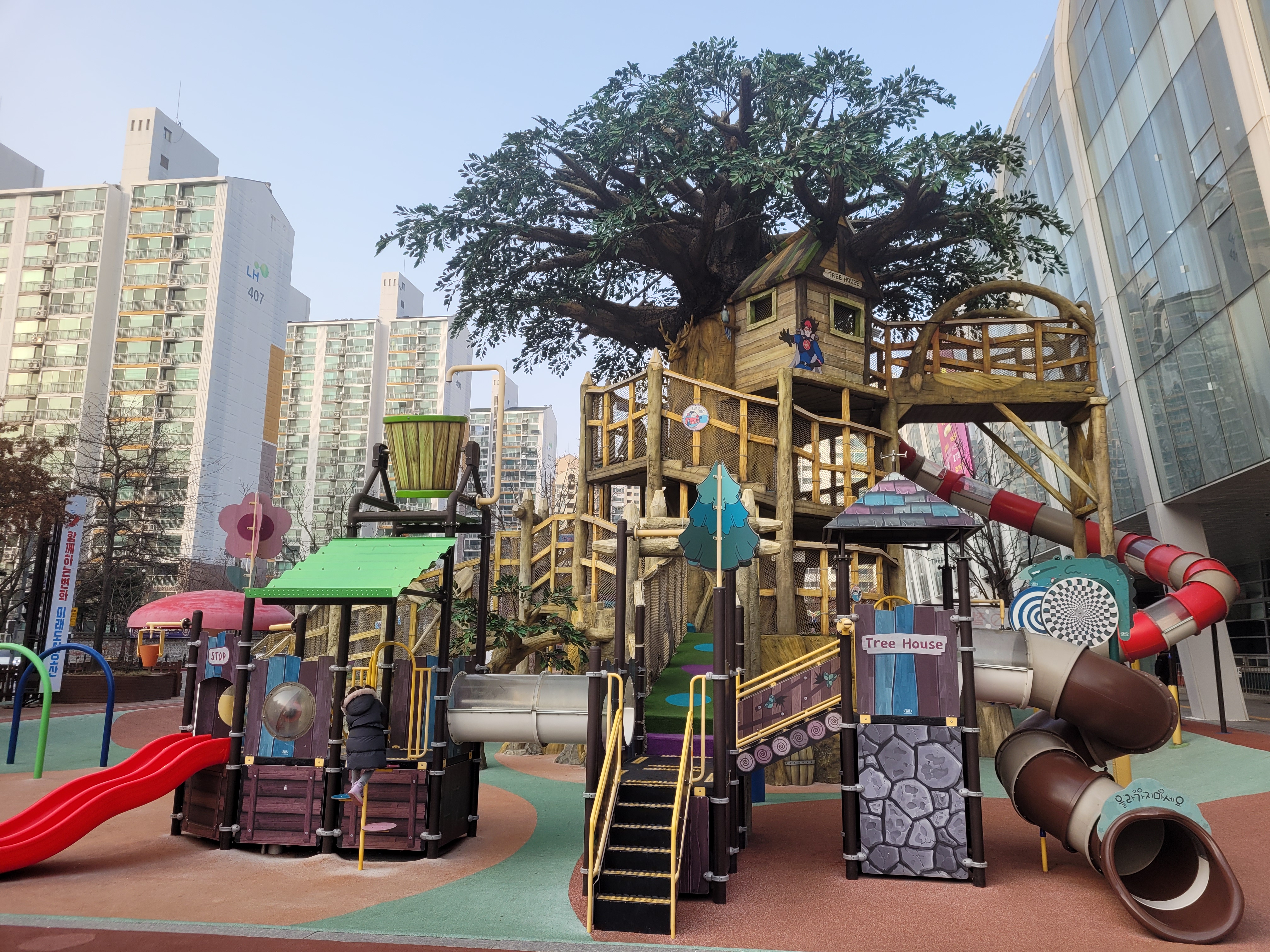 건물밖에는 아주~~ 큰 나무집 미끄럼틀이 있는 놀이터가 있어요.