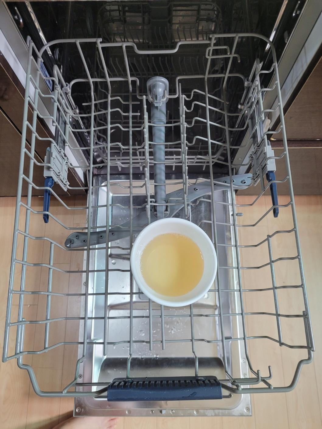 식초를 사용하여 청소할 경우, 그릇이나 컵에 식초를 담아 상부바스켓에 놓고 세척하면 됩니다.