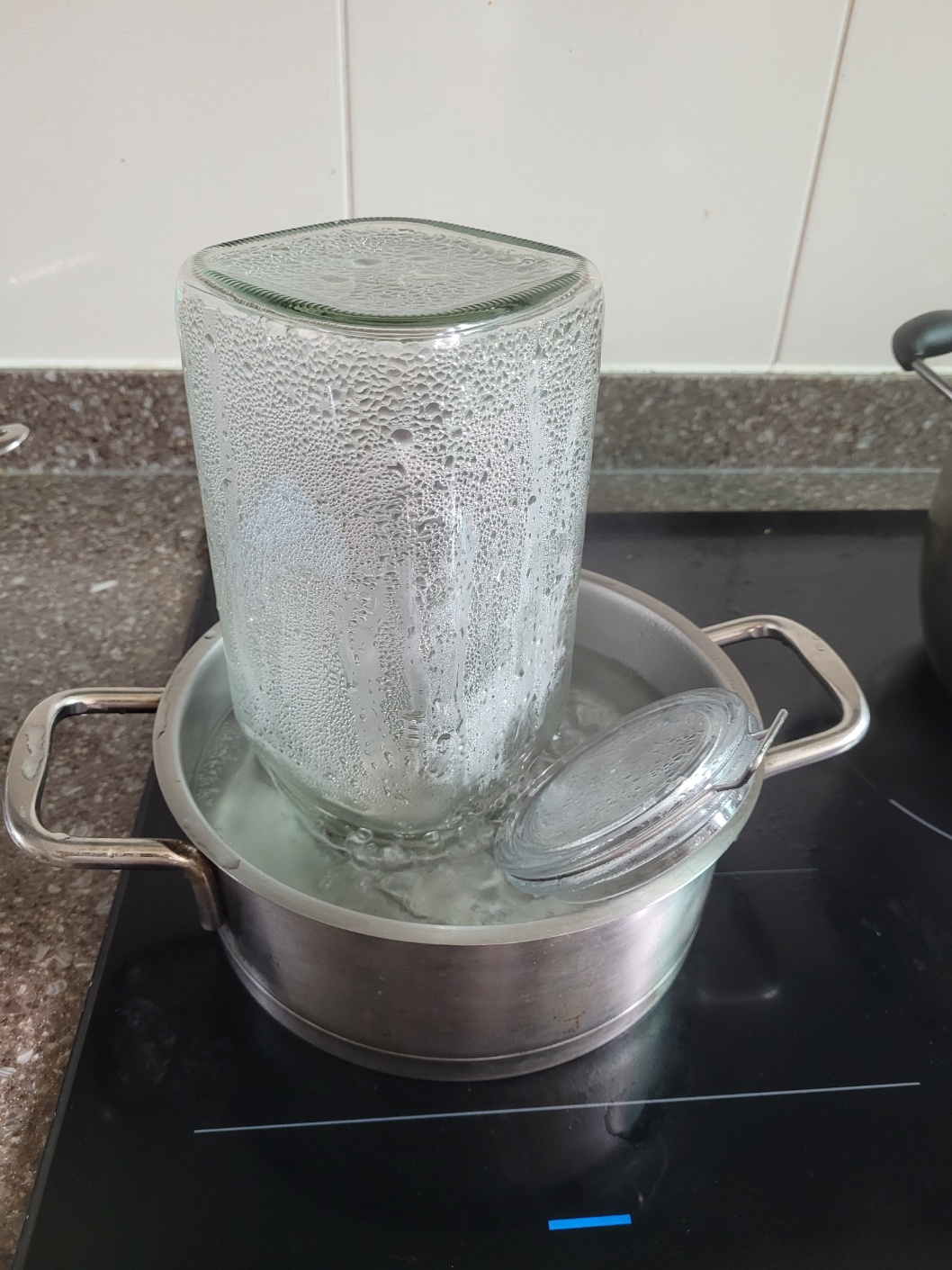 2. 꿀마늘을 보관할 유리병은 열탕소독해줍니다. 유리병 열탕소독하는 방법은 물을 끓일 때 처음부터 유리병을 같이 넣어주고, 끓기 시작하면 3분간 더 끓여주면 되요. 수증기의 열로 소독해 주는 것이기 때문에 유리병 전체가 물에 담길 필요는 없습니다. 열탕소독한 유리병은 물을 털어주고 물기를 말려줍니다.