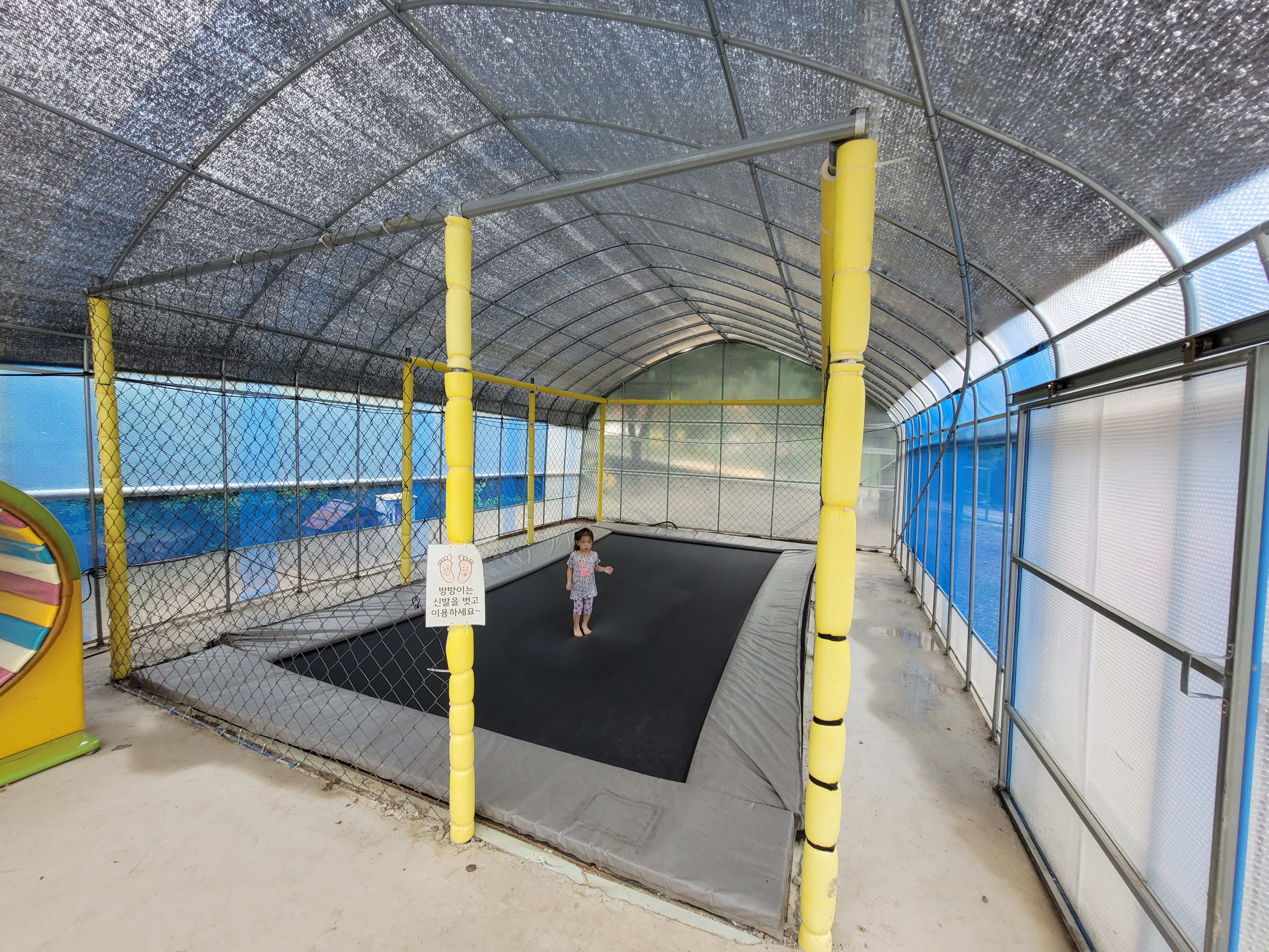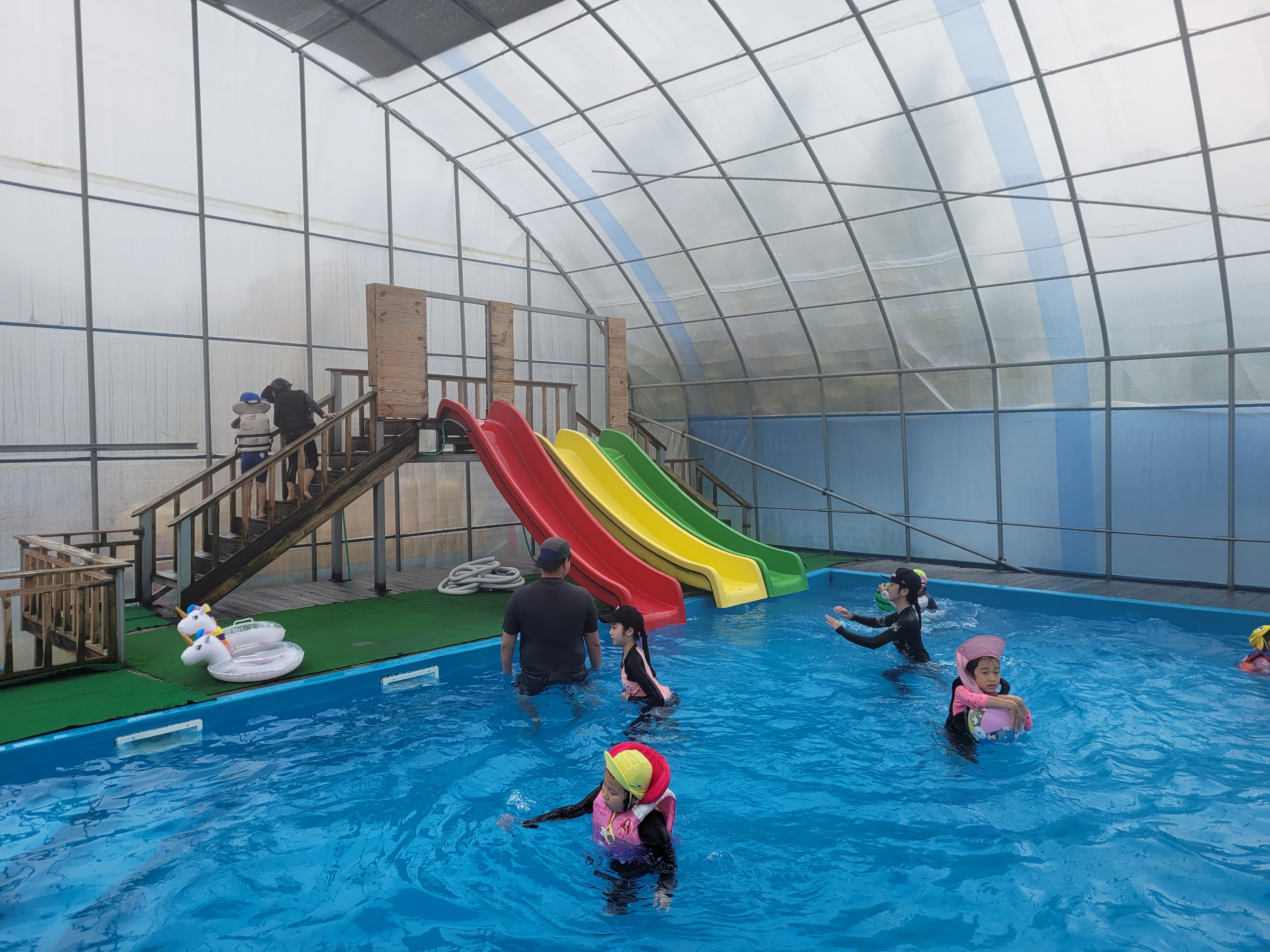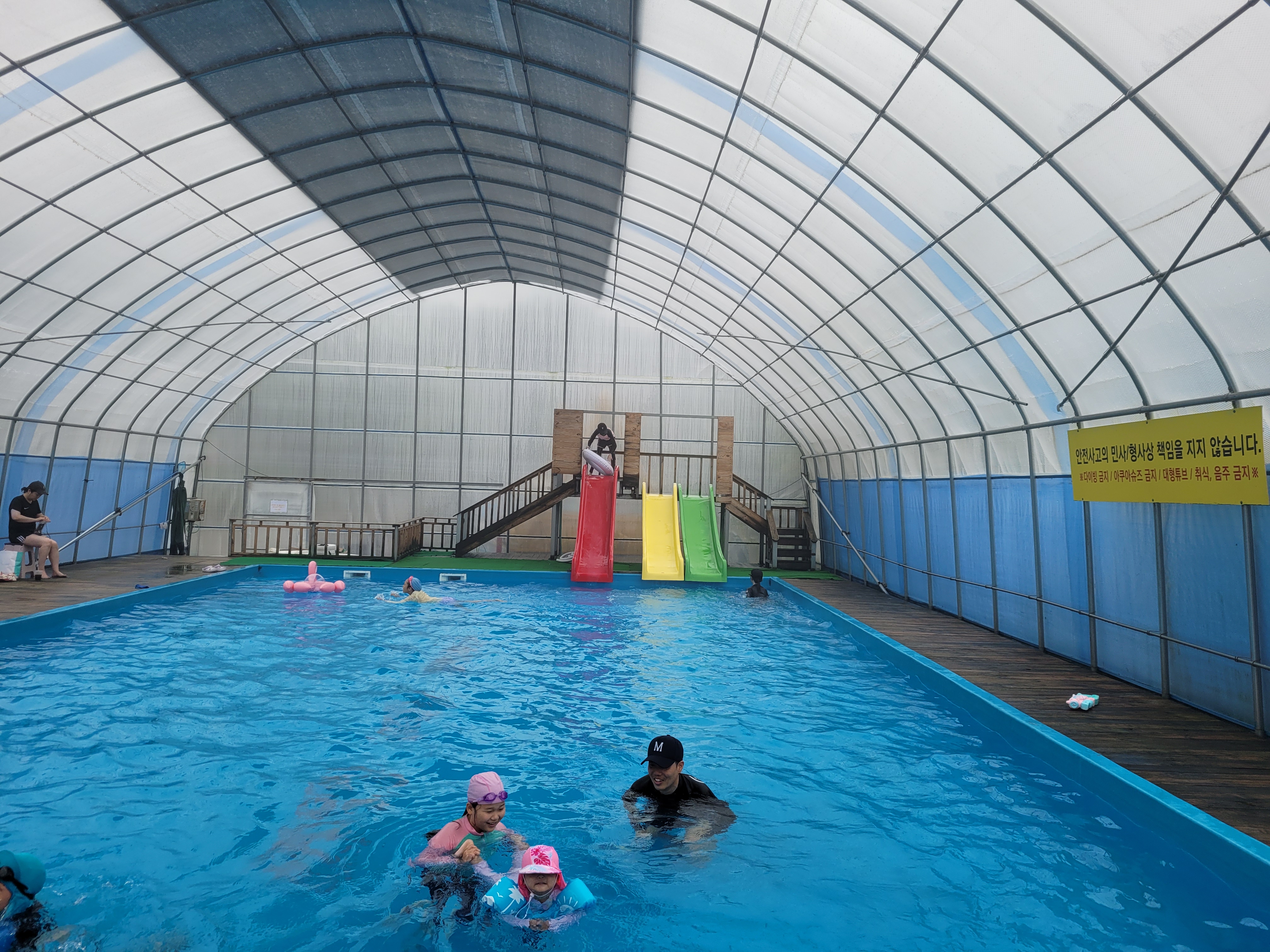 제가 갔던 일정에는 계속 비가 와서 실내수영장만 이용했어요. 온수수영장이라고 해서 물이 따뜻할 줄 알았는데 시원한 물이에요.(계곡물처럼 차지 않음) 온수수영장이 있는 비닐하우스 안은 더워요. 미끄럼틀 3개가 있습니다. 일요일 오전에는 사람이 거의 없어서 완전 전세내고 놀았어요. 제 기준에서는 미끄럼틀 탈만하고 재밌어서 애들이랑 섞여서 10번도 넘게 탔어요. 모자 필수 착용이고, 구명조끼는 매점에서 대여할 수도 있어요. 날씨 탓인지 야외수영장은 운영하지 않았어요.