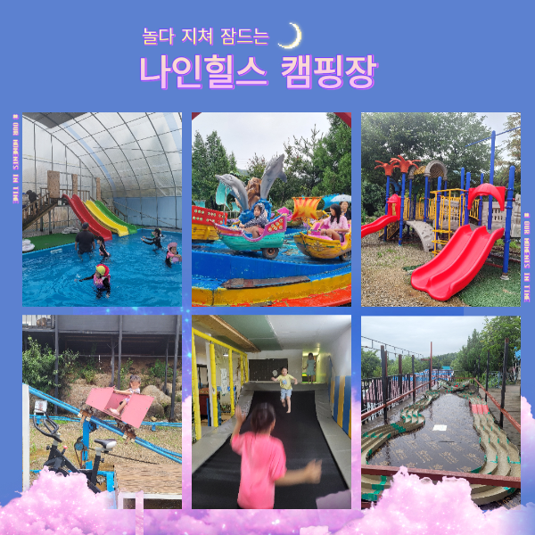 과연 아이들이 놀다지 치는 캠핑장답게 다양한 시설과 프로그램을 갖추고 있었어요. 아이들은 캠핑이 너무 좋다고 또 가자고 계속 얘기하고 있어요. (그래~이번주에도 갈 거야) 실내 수영장, 키즈카페, 방방장 등 시설이 꽤 있어서 우중 캠핑지로도 나쁘지 않은 것 같습니다. 아이들과 함께 즐거운 추억을 만들고 싶다면 나인힐스캠핑장 추천드려요.