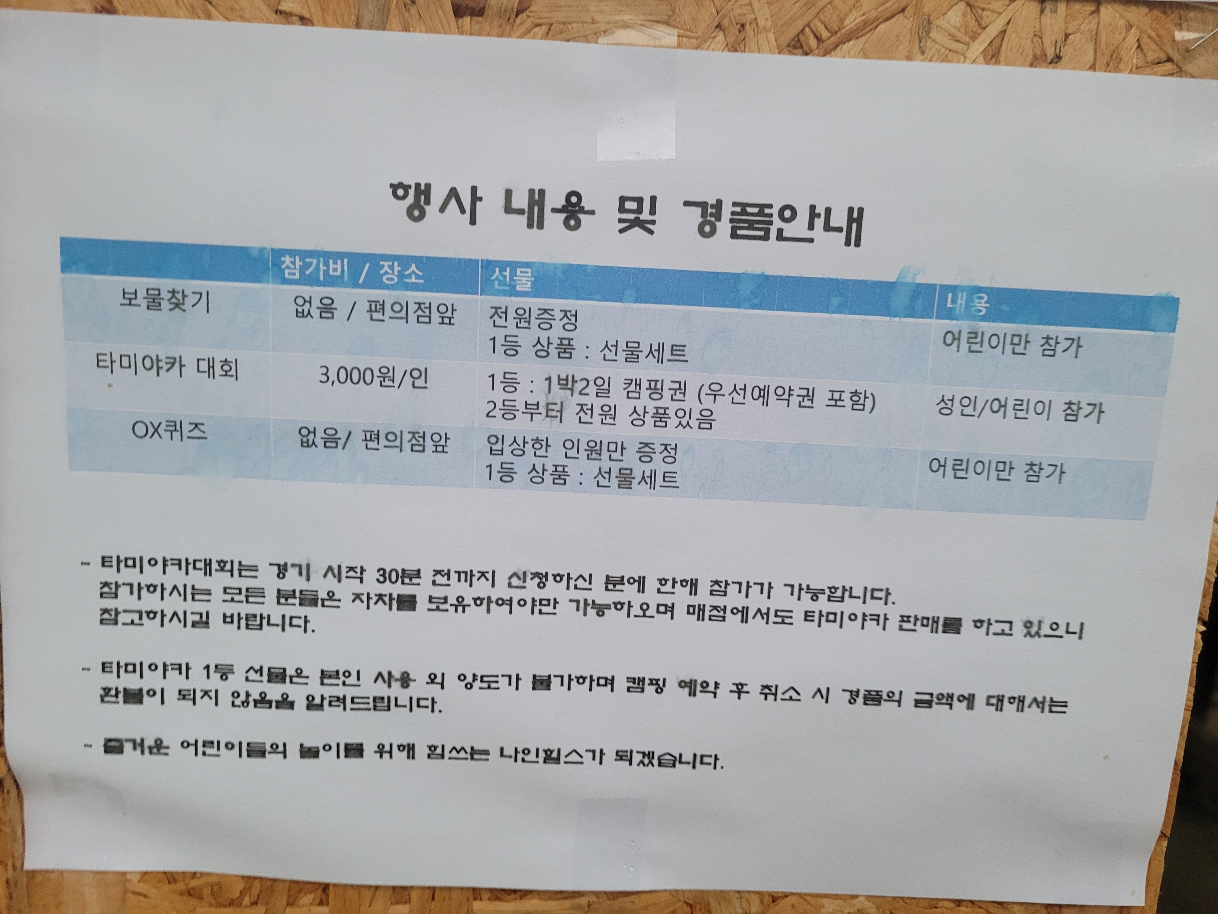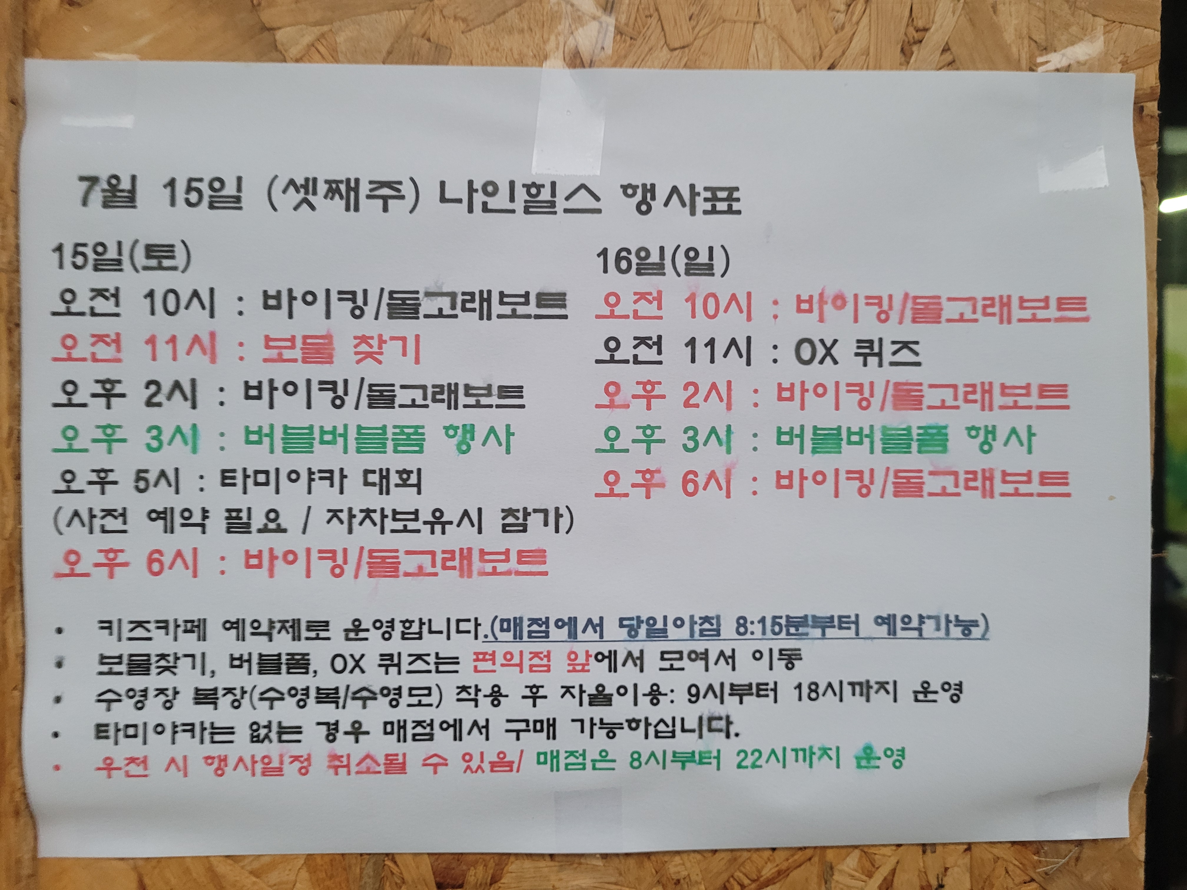 체크인하면 매점 앞에 행사 시간표가 있어요. 시간표를 확인하시고 참여할 프로그램 확인하고 계획 세우는 게 좋아요. 키즈카페는 11명 정원으로 1시간씩 예약제로 운영하는데 아침 8시쯤 키즈카페 예약하라고 방송합니다. 그때 매점 가서 원하는 시간대를 적으시면 됩니다. 1시간만 사용가능하지만 낮시간에 애들이 수영하거나 바이킹 운영할 때는 한 명도 없을 때도 있어서 그냥 이용할 수도 있어요.