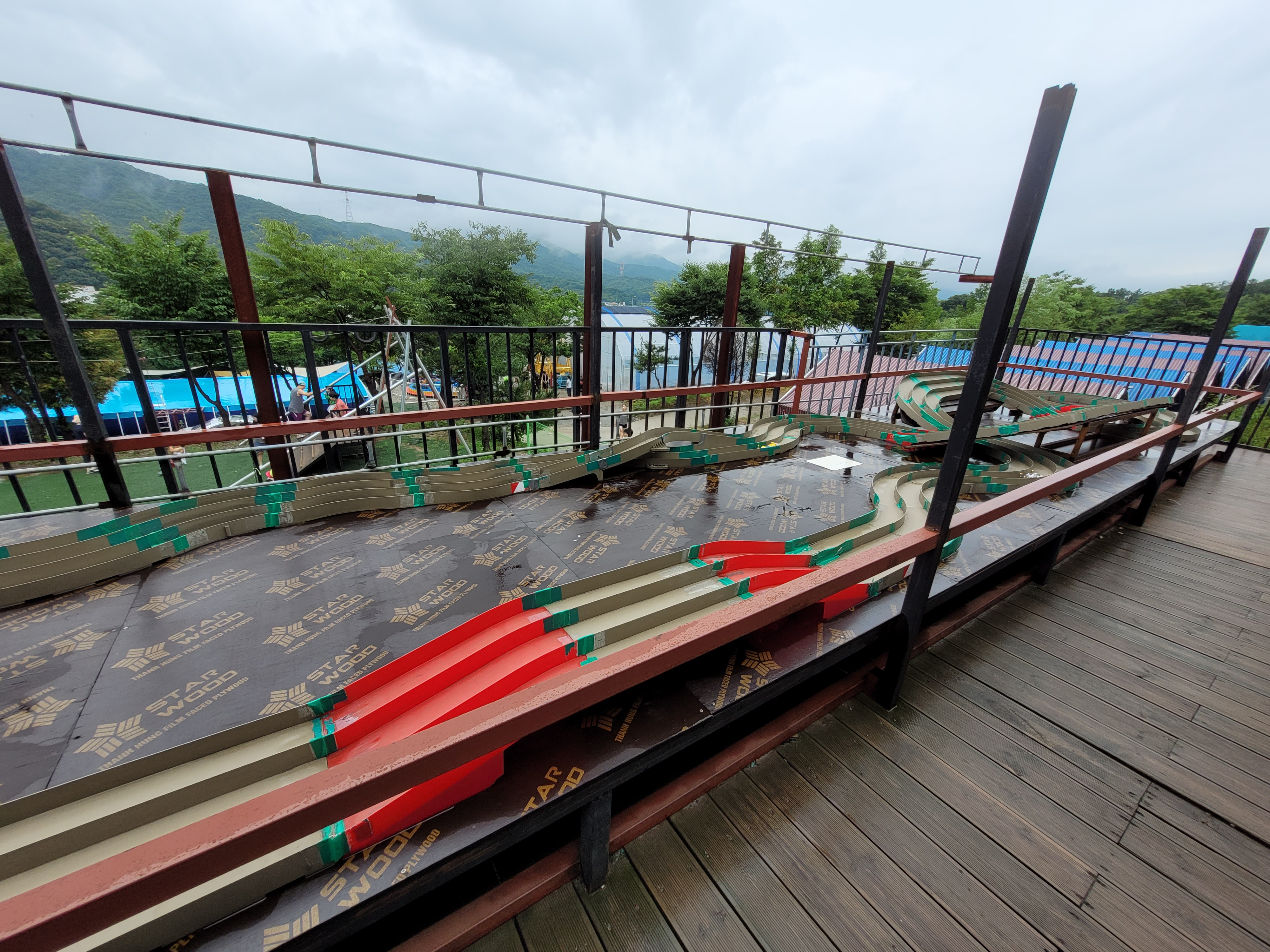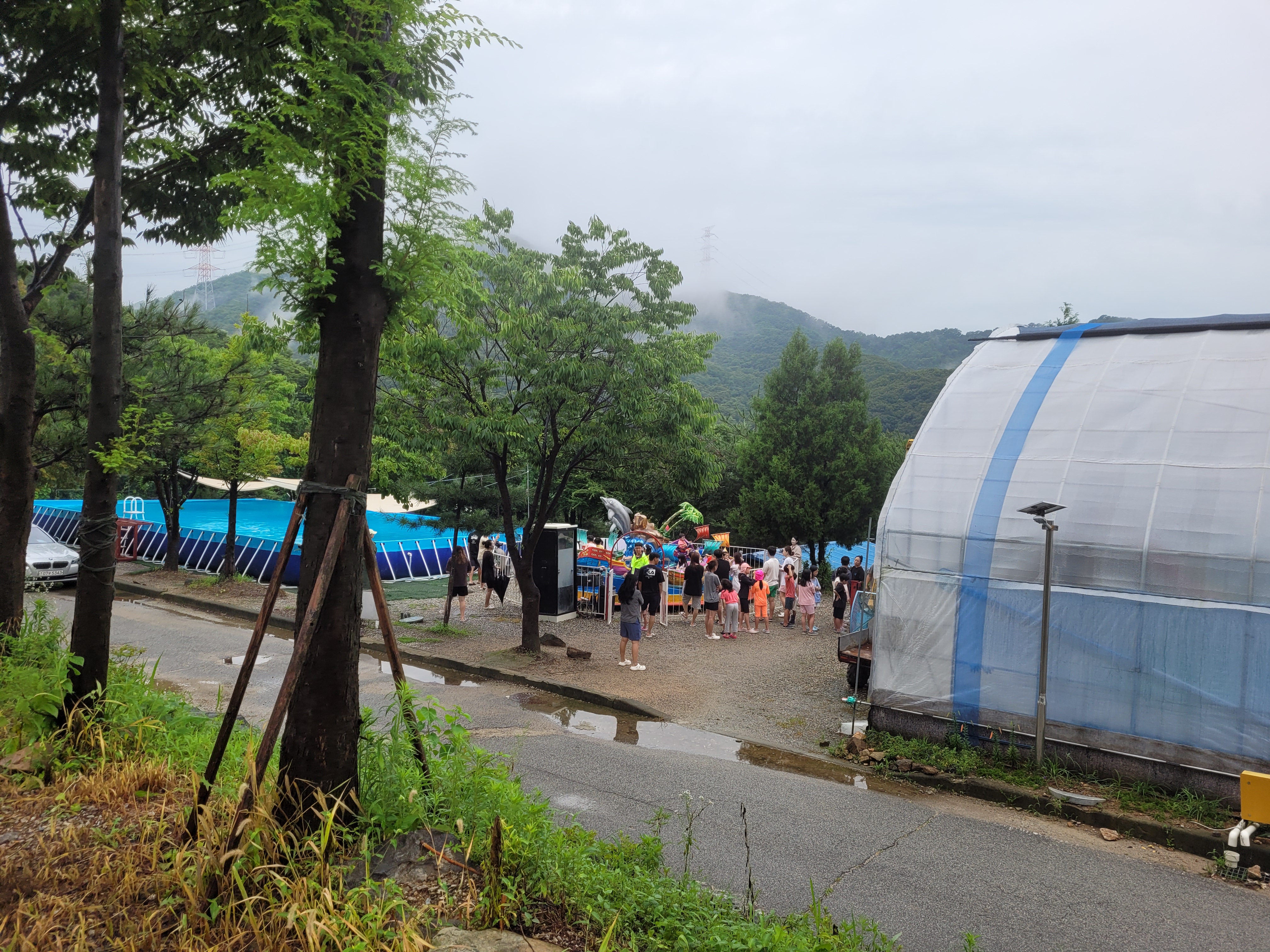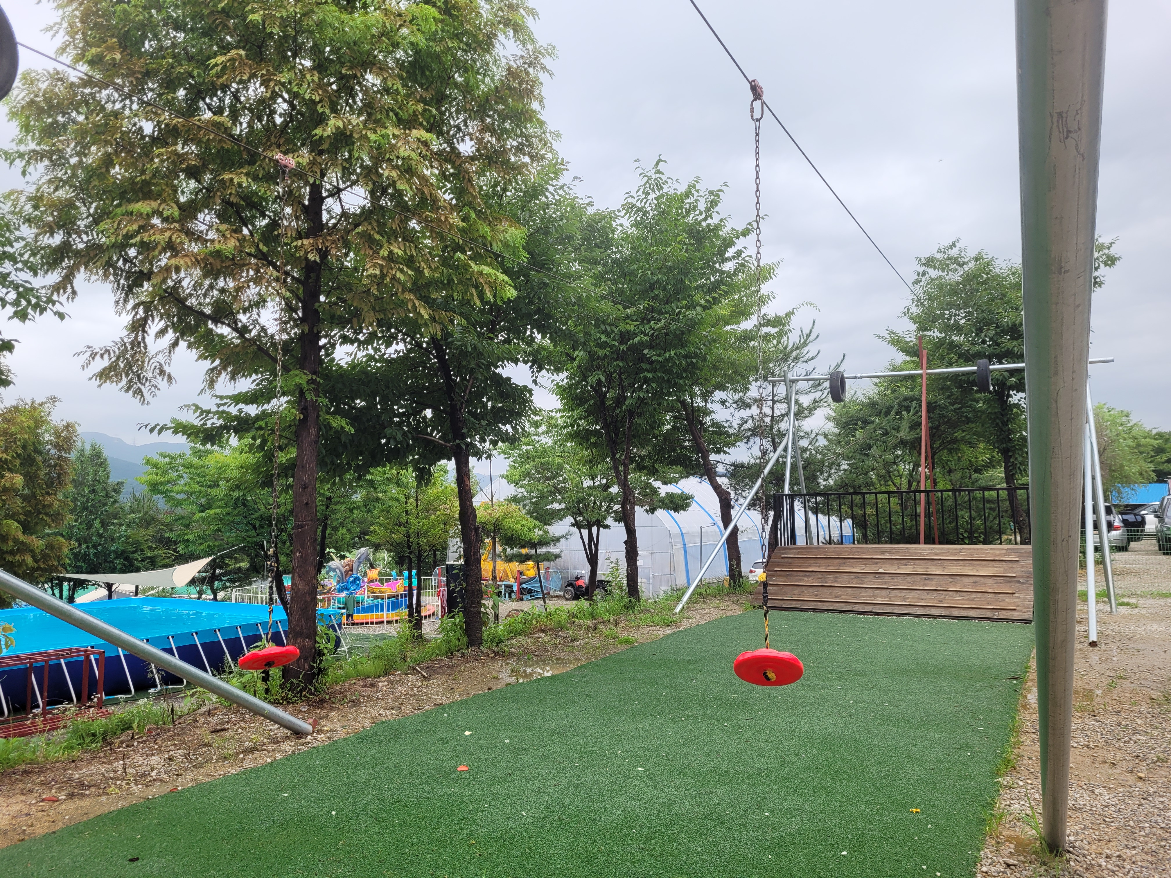 제가 갔던 일정에는 계속 비가 와서 실내수영장만 이용했어요. 온수수영장이라고 해서 물이 따뜻할 줄 알았는데 시원한 물이에요.(계곡물처럼 차지 않음) 온수수영장이 있는 비닐하우스 안은 더워요. 미끄럼틀 3개가 있습니다. 일요일 오전에는 사람이 거의 없어서 완전 전세내고 놀았어요. 제 기준에서는 미끄럼틀 탈만하고 재밌어서 애들이랑 섞여서 10번도 넘게 탔어요. 모자 필수 착용이고, 구명조끼는 매점에서 대여할 수도 있어요. 날씨 탓인지 야외수영장은 운영하지 않았어요.