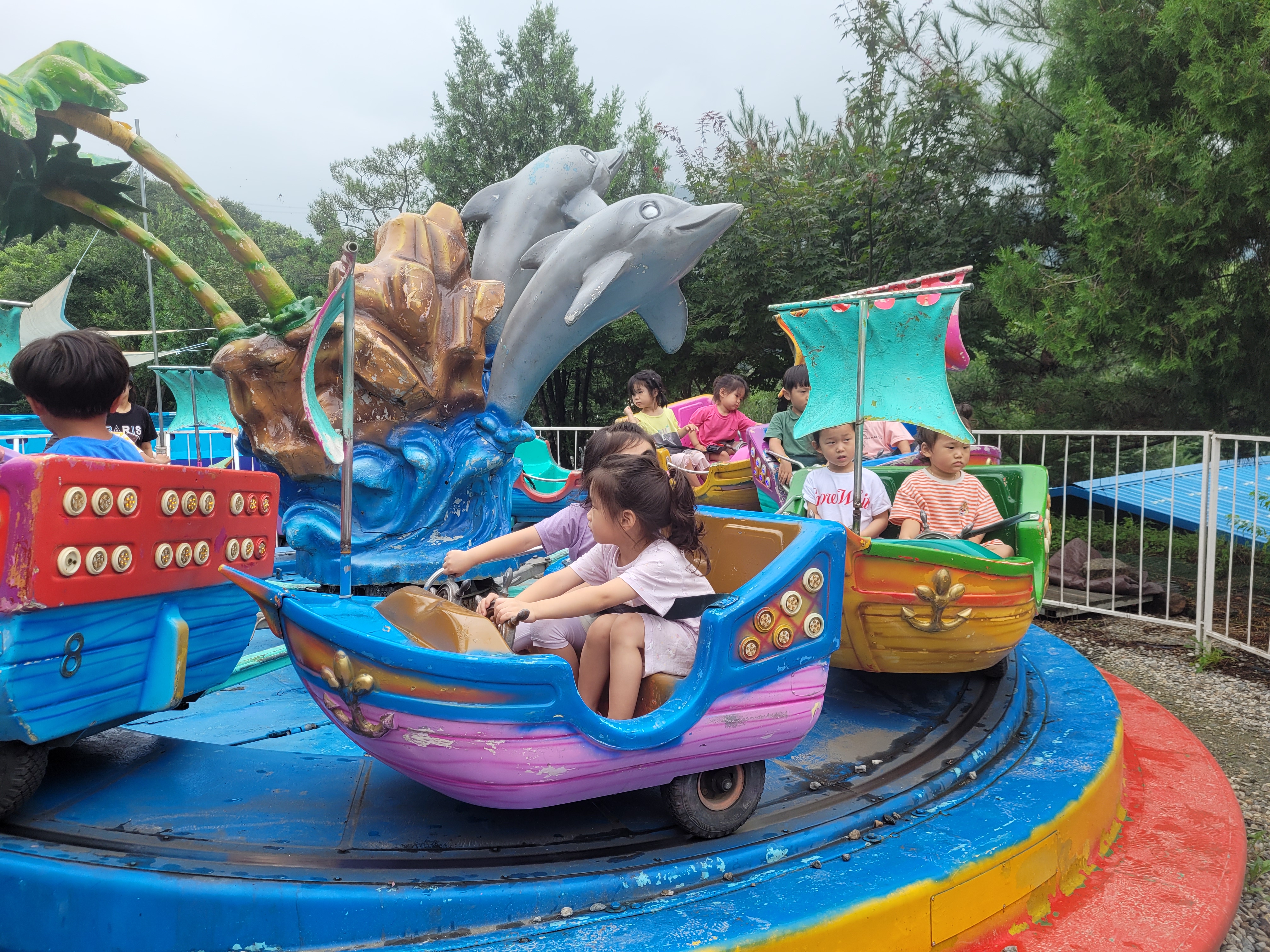 오전 10시, 오후 2시에 운영하는 놀이기구존입니다. 어린 친구들은 돌고래보트를 타고, 언니오빠들은 바이킹을 좋아해요. 바이킹 꽤 높이 올라가고 시간도 길게 태워줍니다. 바이킹은 기다리는 친구가 많아서 한 타임에 한 번만 타도록 했어요.