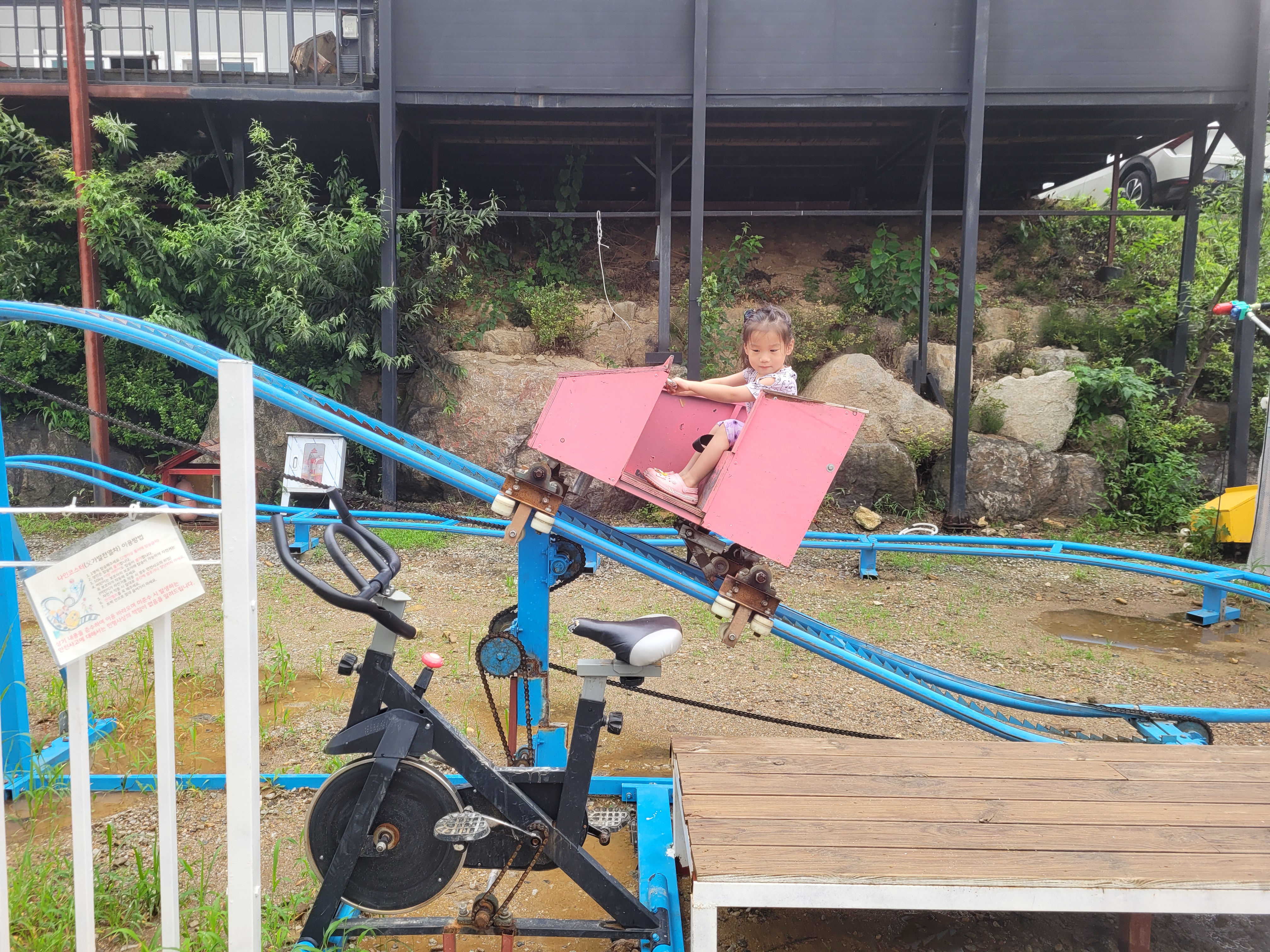 나인코스터라고 자전거로 돌리는 청룡열차가 있어요. 은근히 빨라서 5살인 둘째는 타고 울었어요... 큰 아이들이 계속 태워달라고 해서 운동 많이 했네요. 미끄럼틀과 실내 방방, 짚라인이 있어요. 사람이 많이 몰리지 않아서 짚라인도 원 없이 탔네요:)