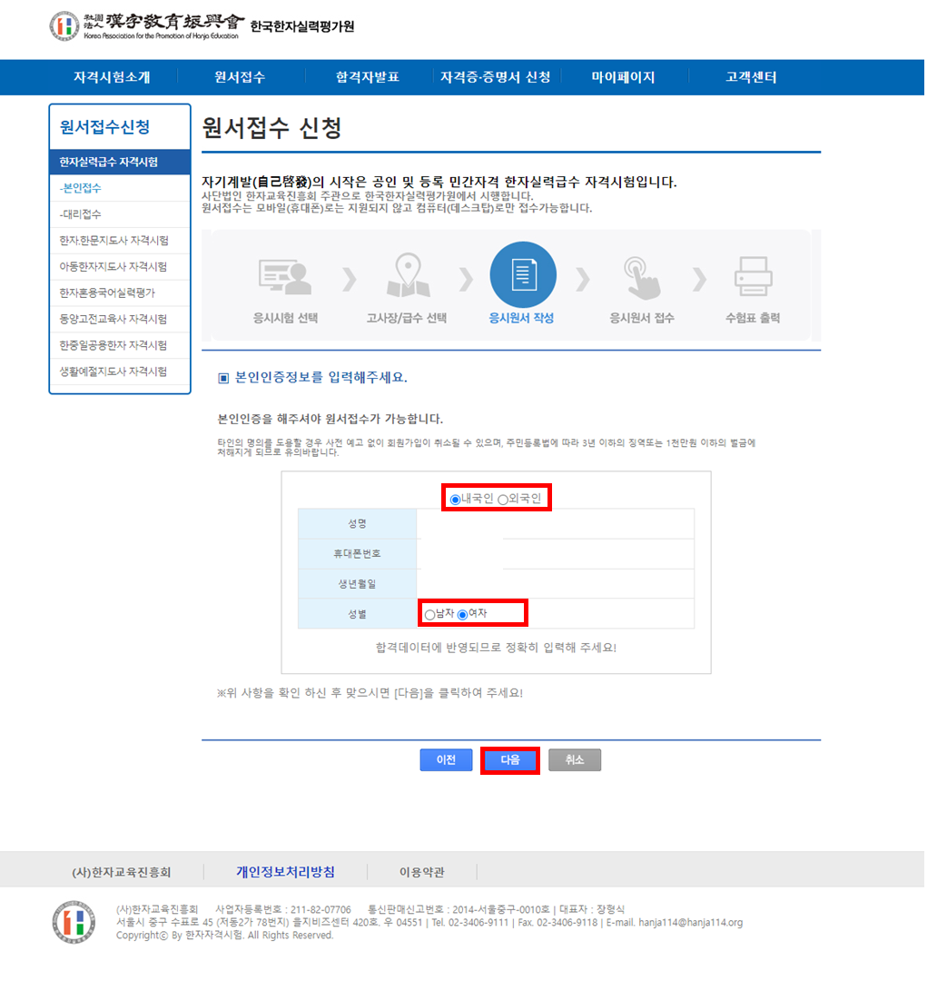 아이 명의로 회원가입을 했다면 원서접수 신청에서 본인접수하기를 클릭하고, 응시시험과 급수를 선택 후 다음을 눌러주세요.