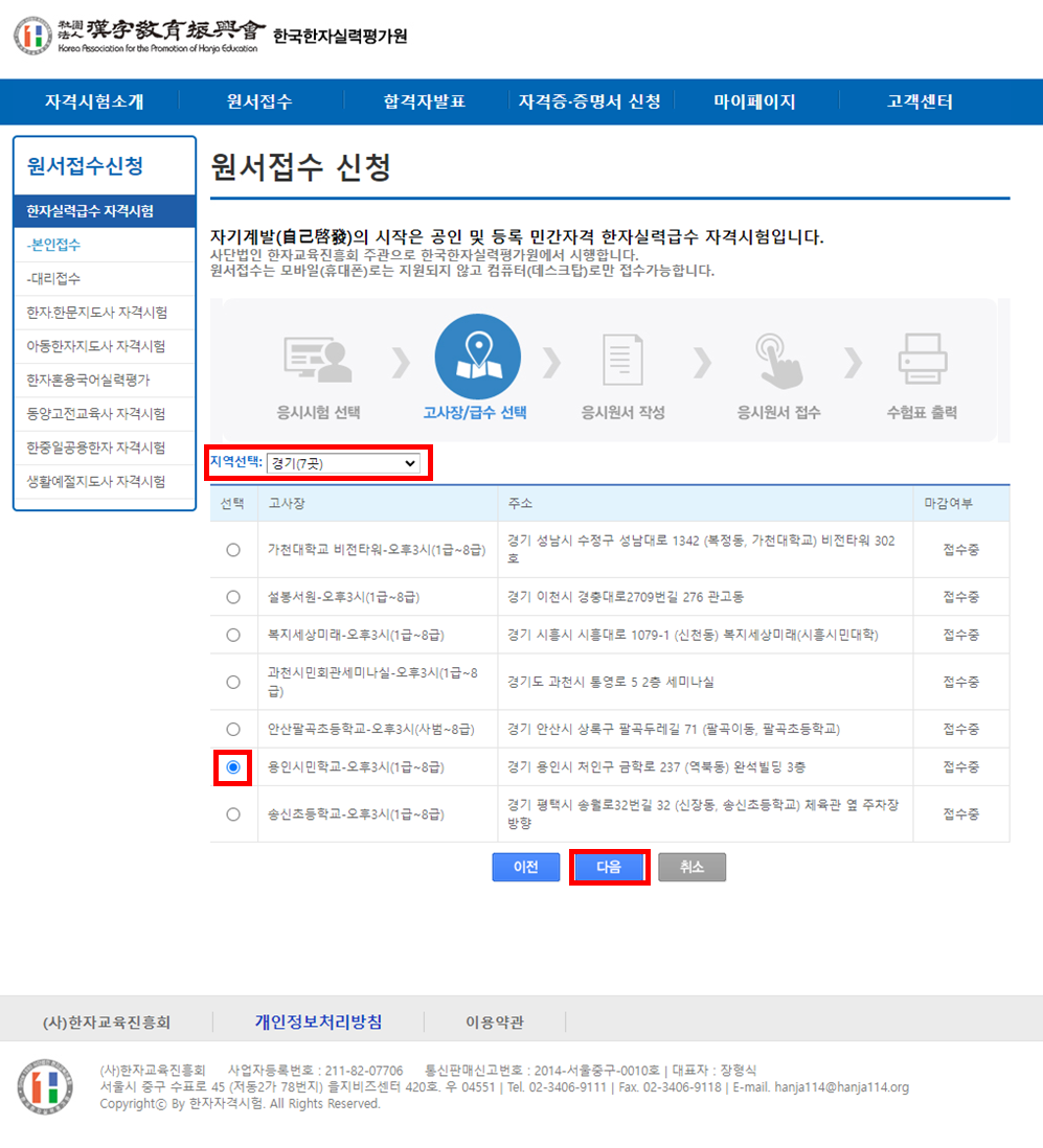 지역으로 고사장을 조회하여 원하는 고사장을 선택해 주세요. 경기도에서 시험 볼 수 있는 곳은 7곳 있네요. 다행히 집에서 멀지 않은 곳에 용인시민학교 고사장이 위치해 있어서 선택해 주었습니다.