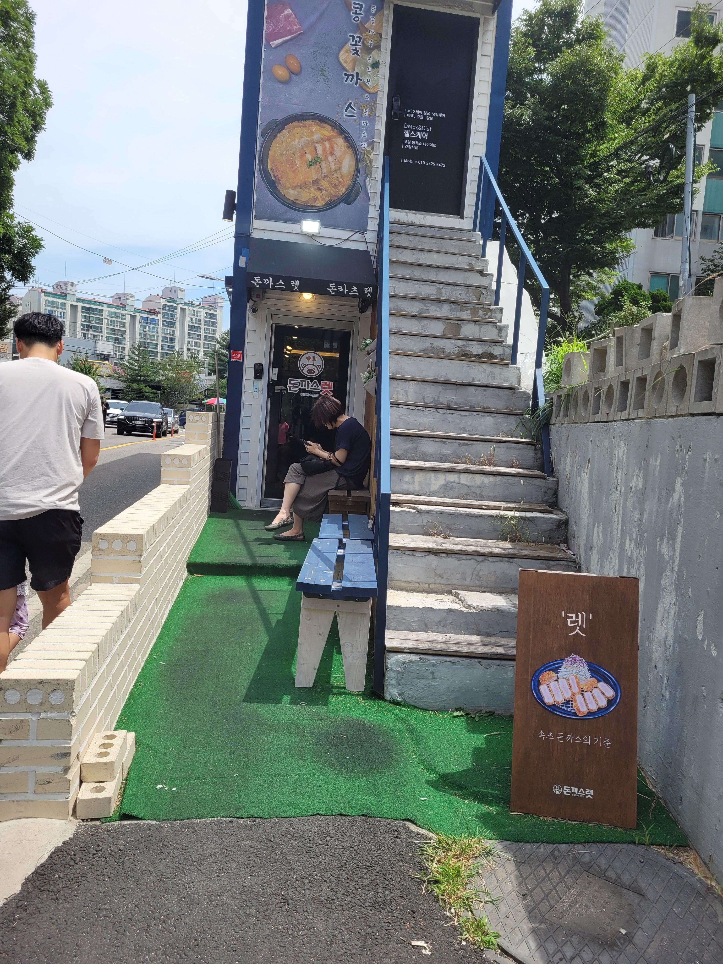 돈까스렛은 아파트단지 사이에 위치하고 있어요. 깔끔한 외부 모습입니다.