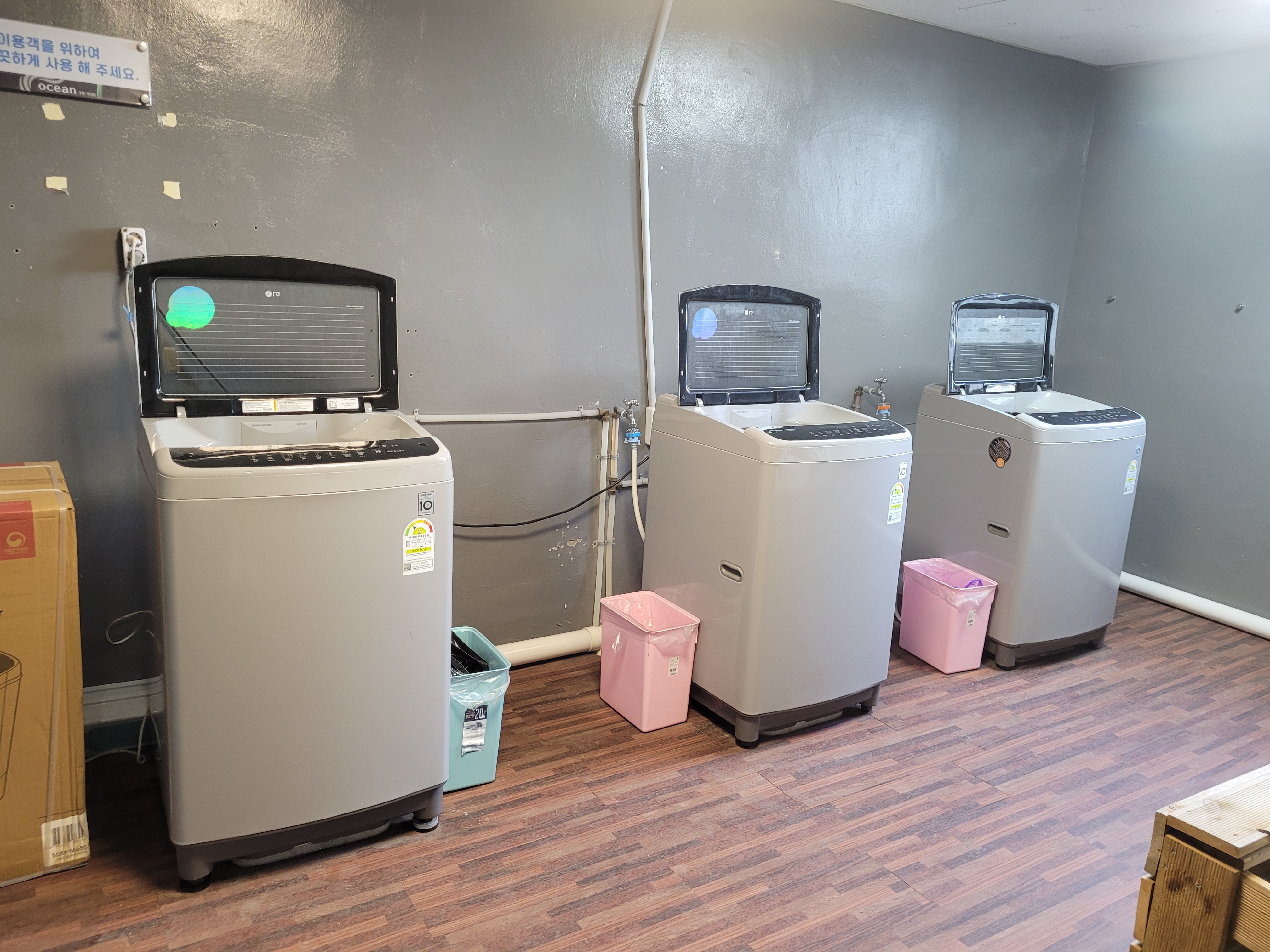 2층에 위치한 무료 탈수실입니다. 탈수기 3대와 세탁기 3대가 있어요. 매일 수영복과 비치타월 탈수해서 다음날 뽀송뽀송하게 사용할 수 있었어요. 세제 자판기도 있어서 세탁 시 용이합니다.