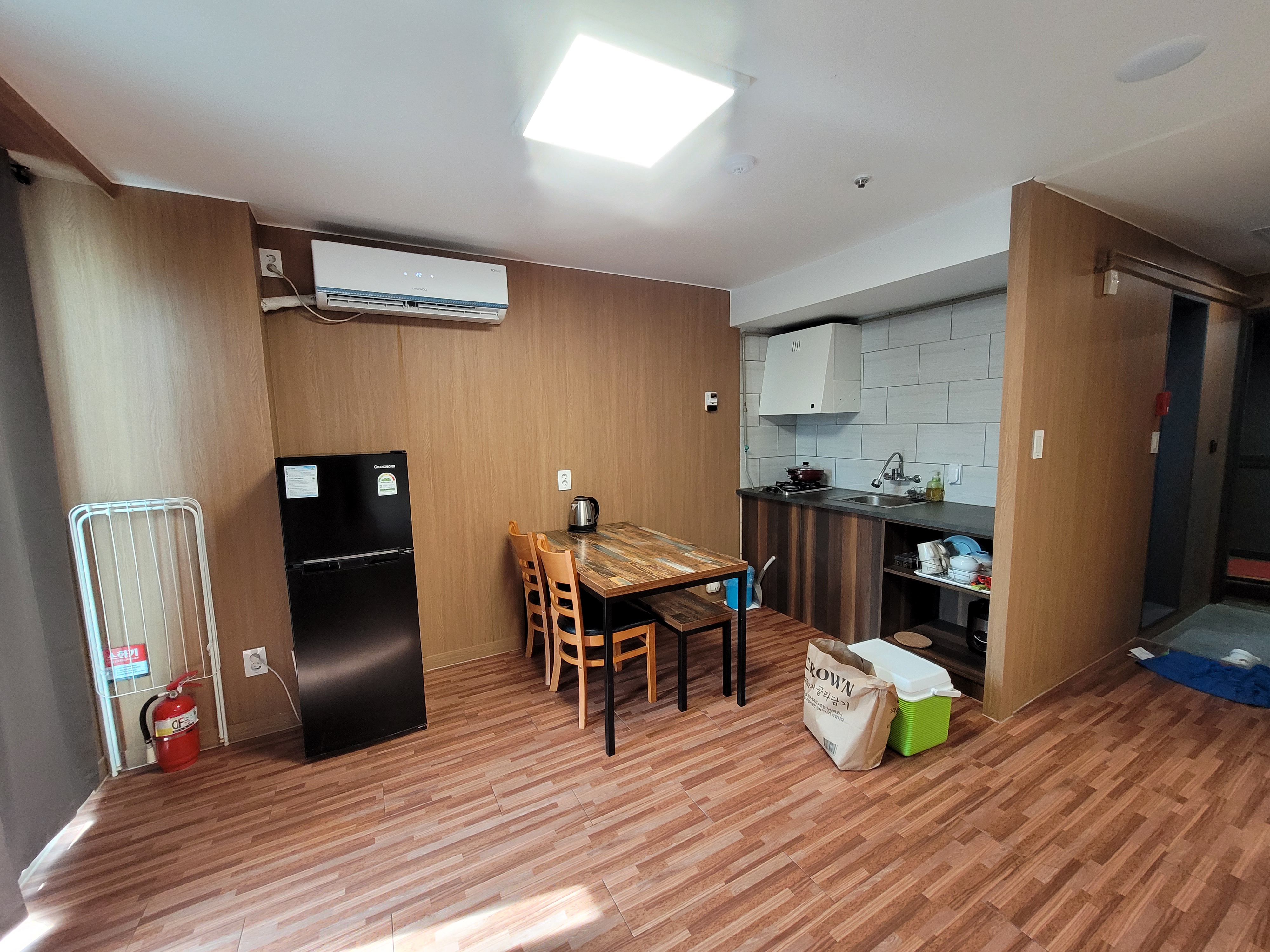 베란다가 있어서 빨래 건조대를 펼쳐서 물놀이용품 말리기 좋았어요. 바람이 많이 불어서 베란다에 말리는 것들은 무거운 구명조끼 등으로 버클 꼭 채워서 말리시고, 수영복은 내부에서 널어놓으세요. 저희 수영복 날아가서 다른 집 가서 찾아왔어요. 2층에 무료 탈수기를 이용하면 실내에서 말려도 충분하더라고요:)