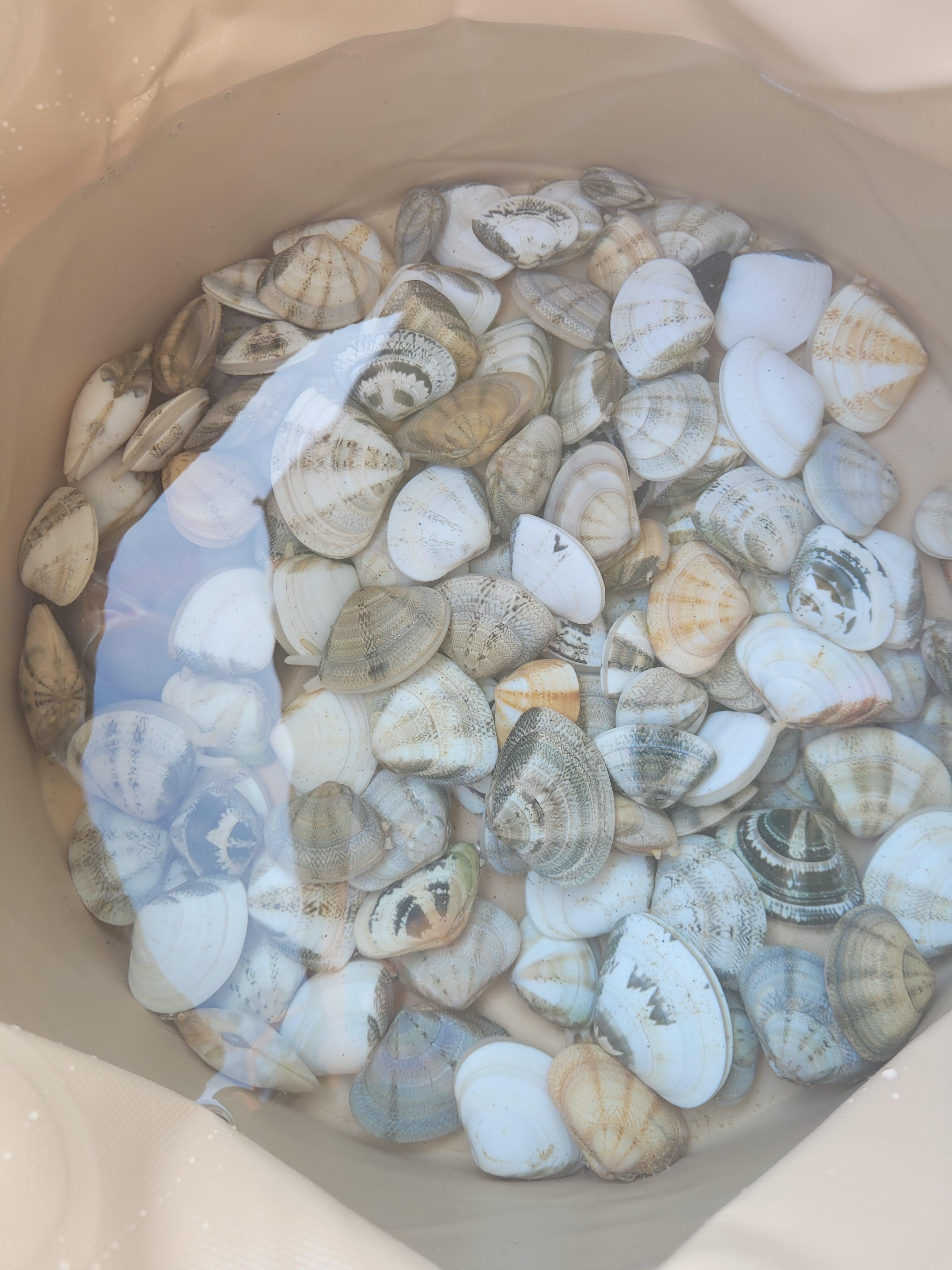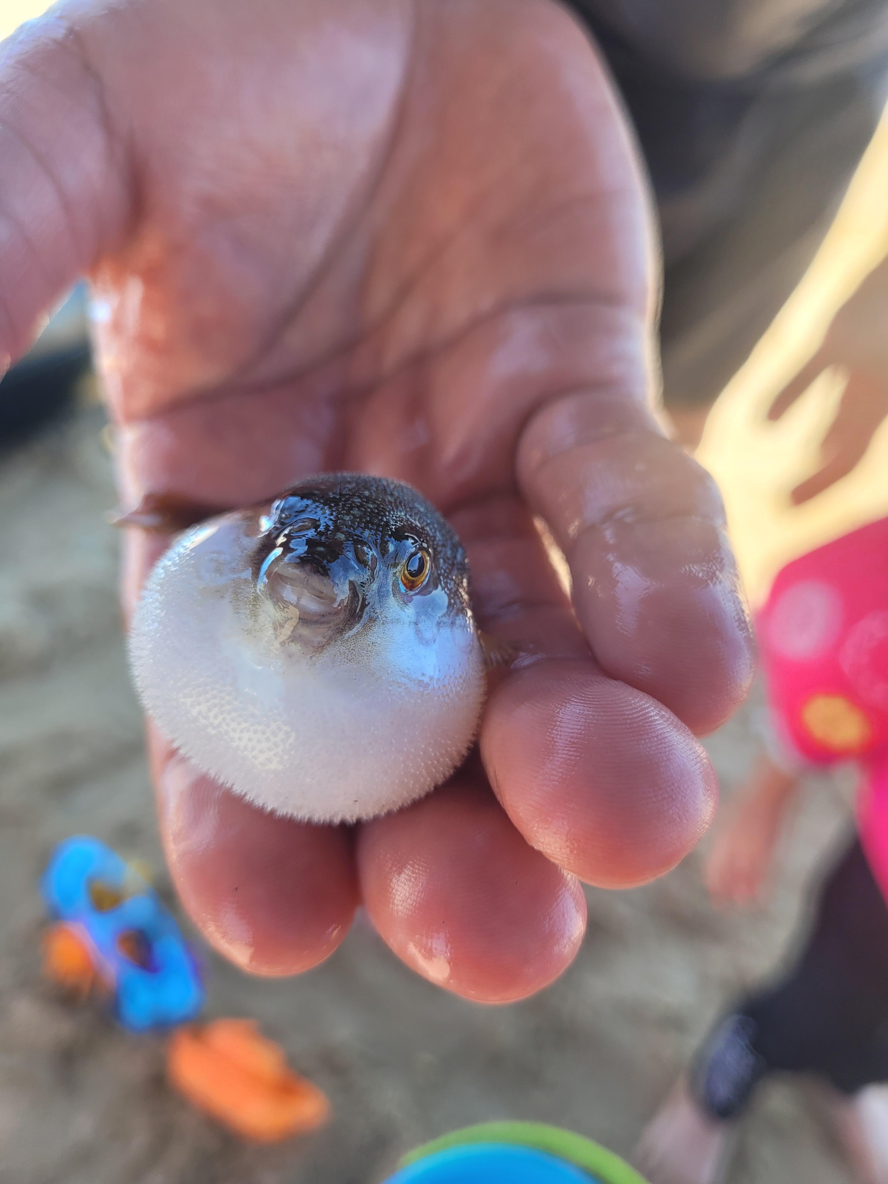 파도가 밀려들어올 때 아기 복어가 밀려들어와서 줍줍 했어요! 아이들이랑 관찰하고 놓아주었어요. 조개도 너무 많아서 씨알이 굵은 조개만 잡았어요. 바닷물로 해감하다가 저녁에 조갯국, 조개찜 해 먹었는데 국물 맛이 예술이었습니다! 바다 깊은 곳에서 골뱅이도 하나 주웠는데 너무 신기했어요.