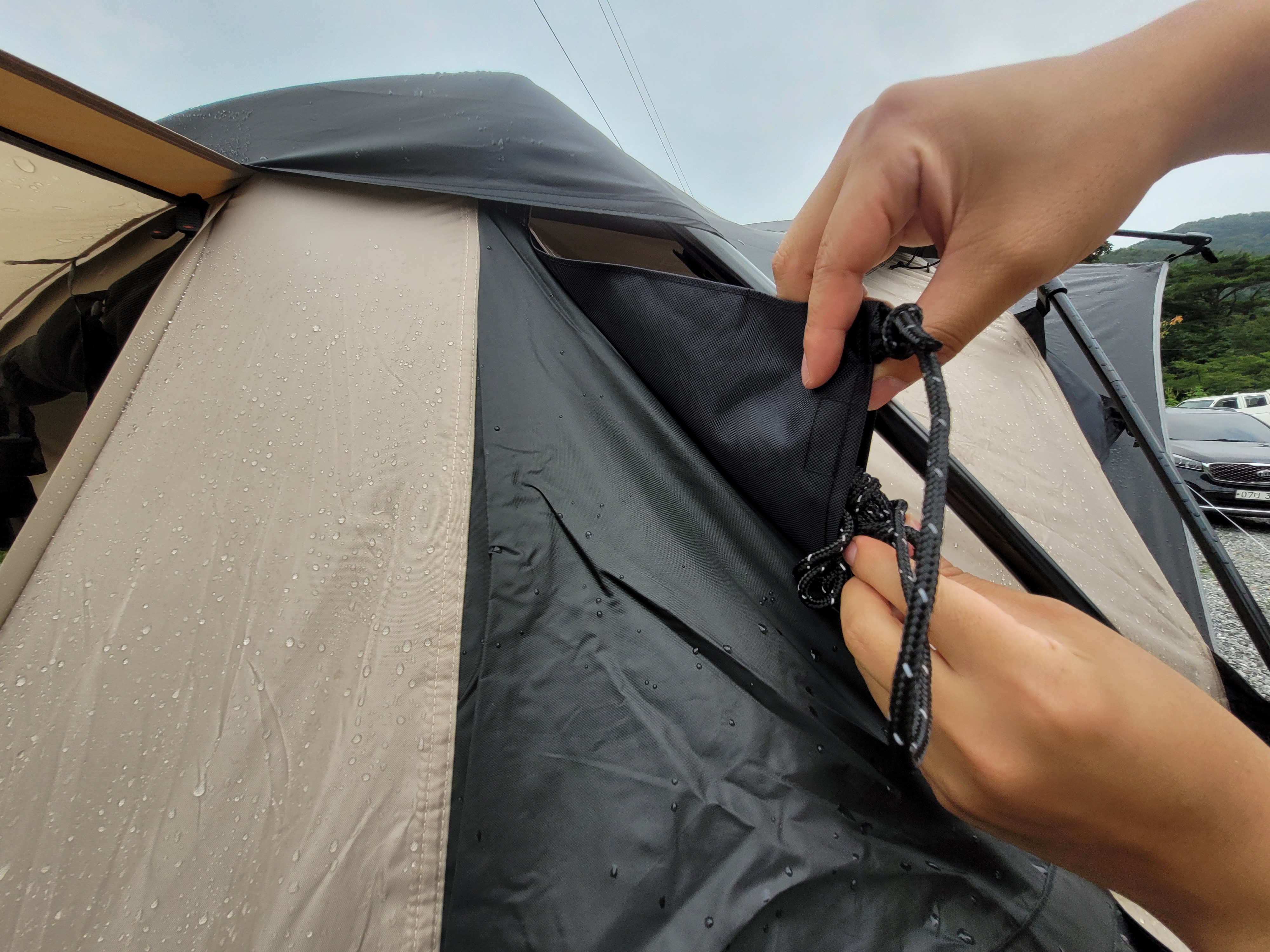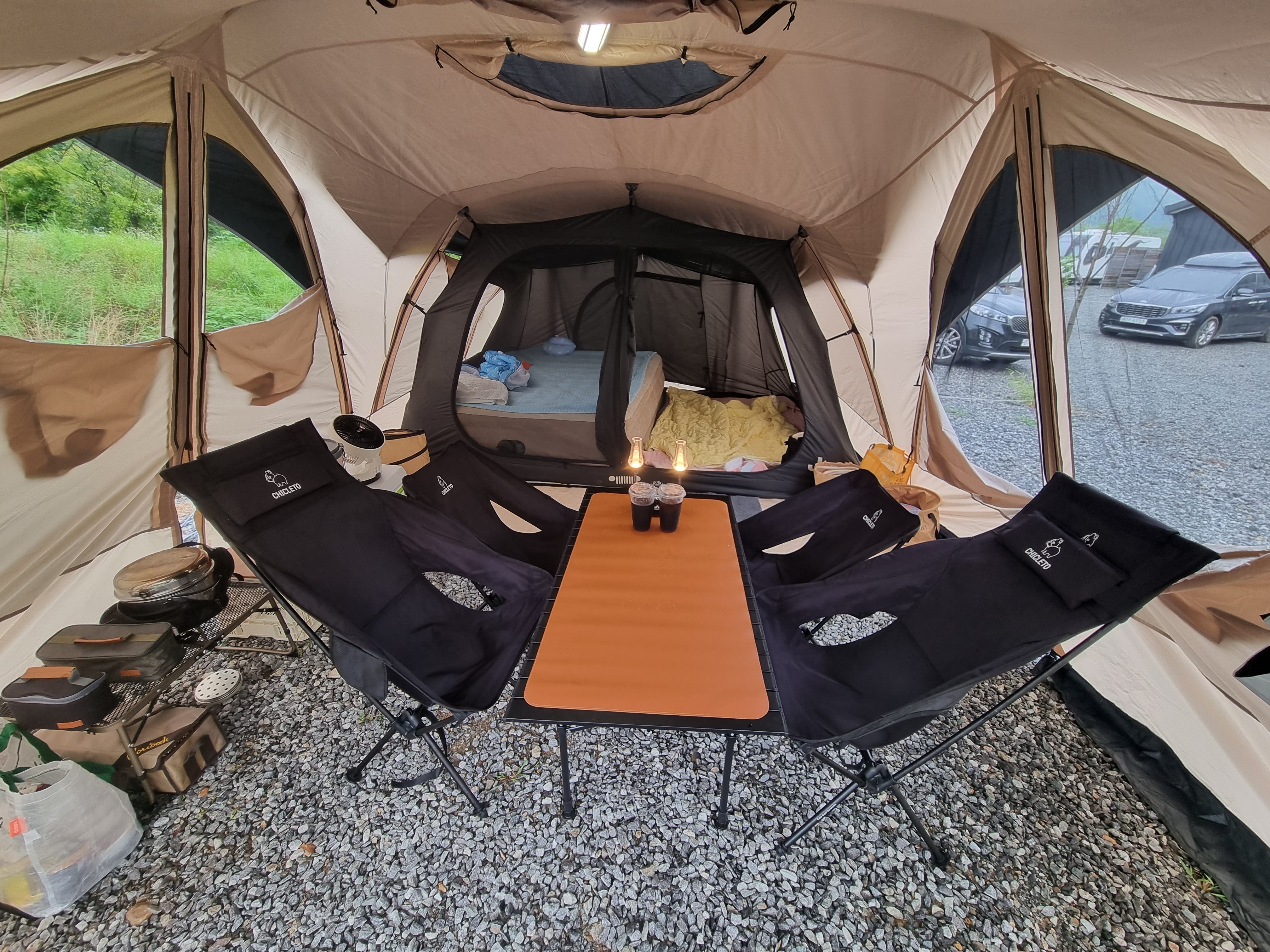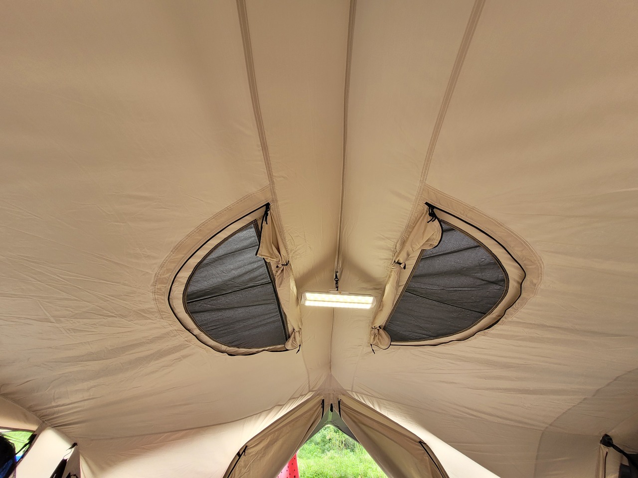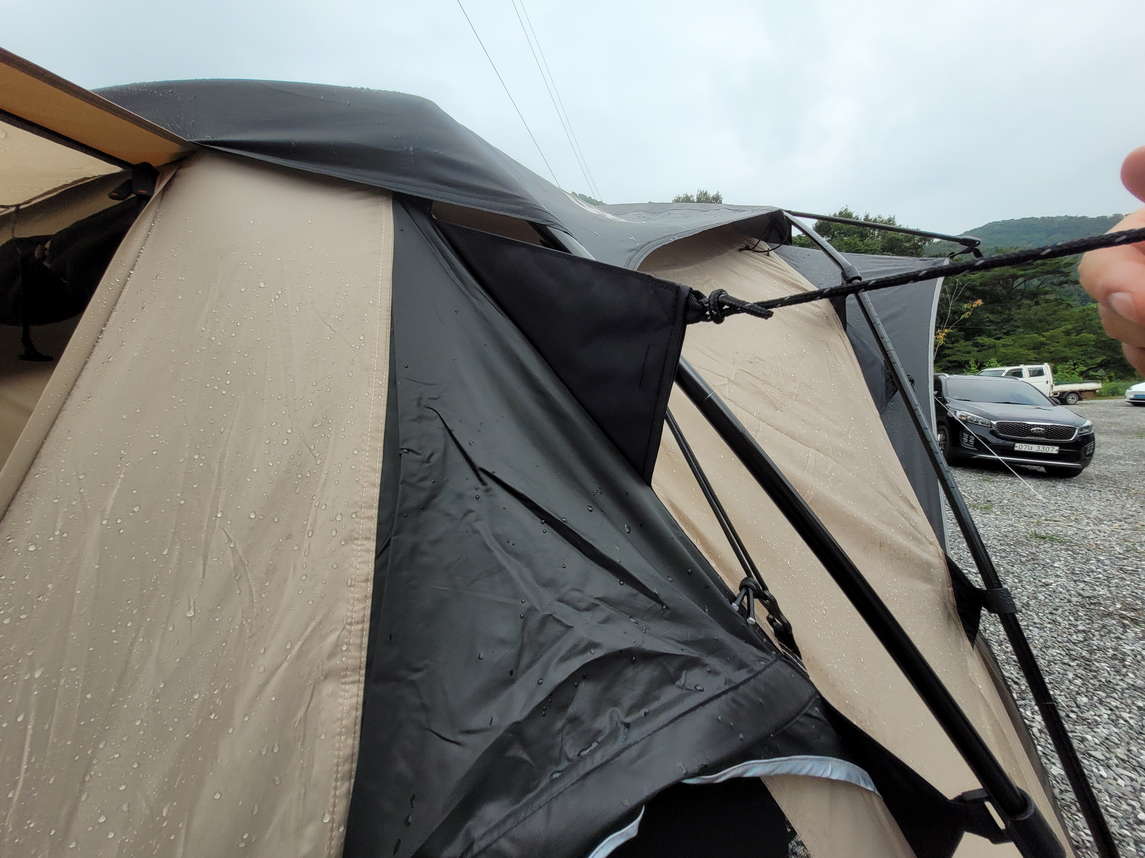 루프 벤틸레이션이 있어서 환기가 잘됩니다. 비가 와서 루프 플라이를 설치하고 사진 찍어서 하늘이 보이지 않지만 평소에는 하늘을 볼 수 있어요. 이너텐트를 설치한 쪽을 제외하고 세 면을 완전히 개방하고 쓸 수 있어서 좋아요.