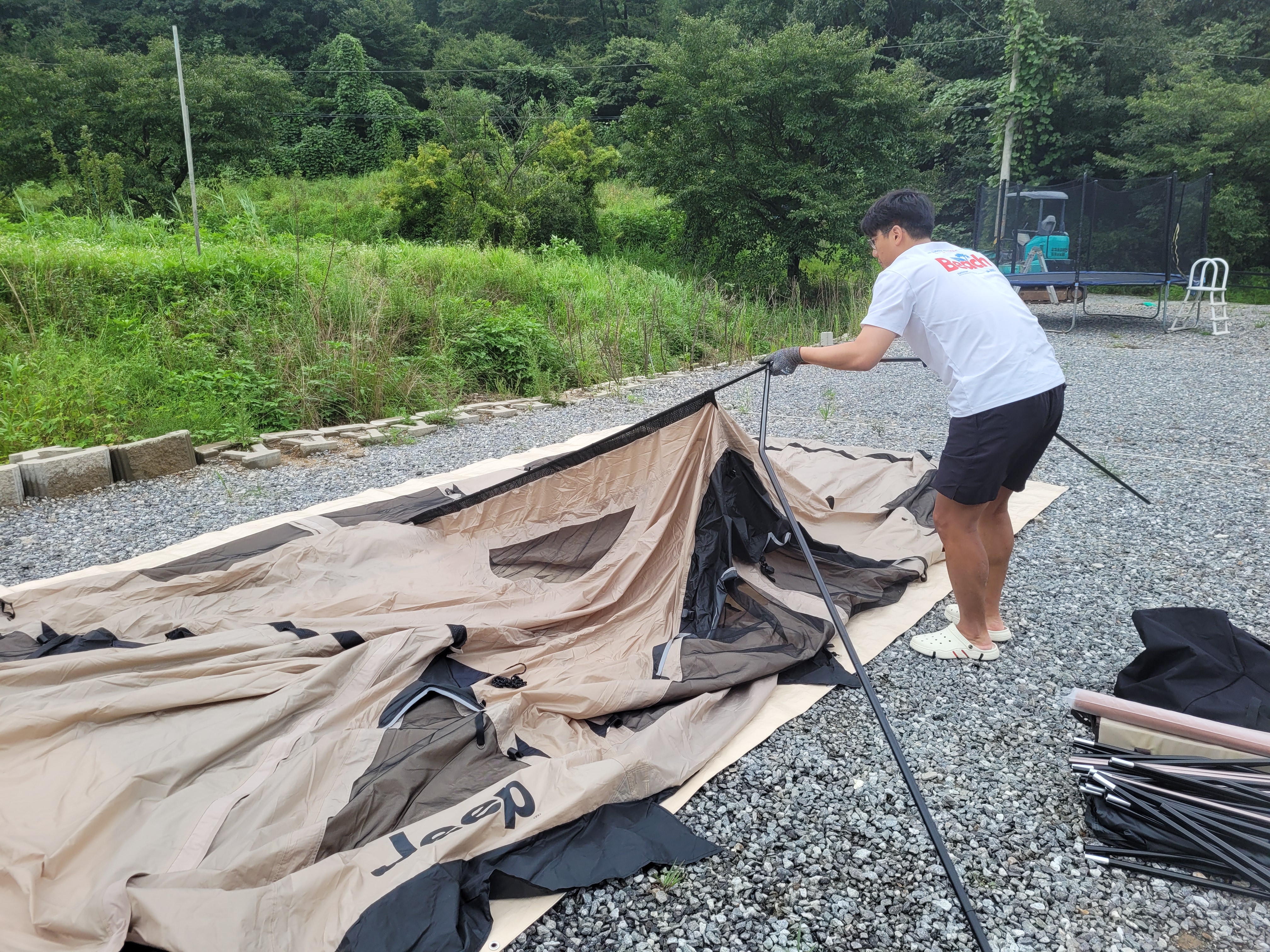 출입문 위로 들어가는 루프 폴을 넣어주었어요. 그 폴 양 옆으로 메인 폴라인(JEEP가 쓰여있는 폴)을 설치해 주면 텐트가 자립이 됩니다. 폴에 오징어팩에 꽂아주고 자립시킨 후 스킨고리를 끼워주고 처마 폴도 끼워주었습니다.