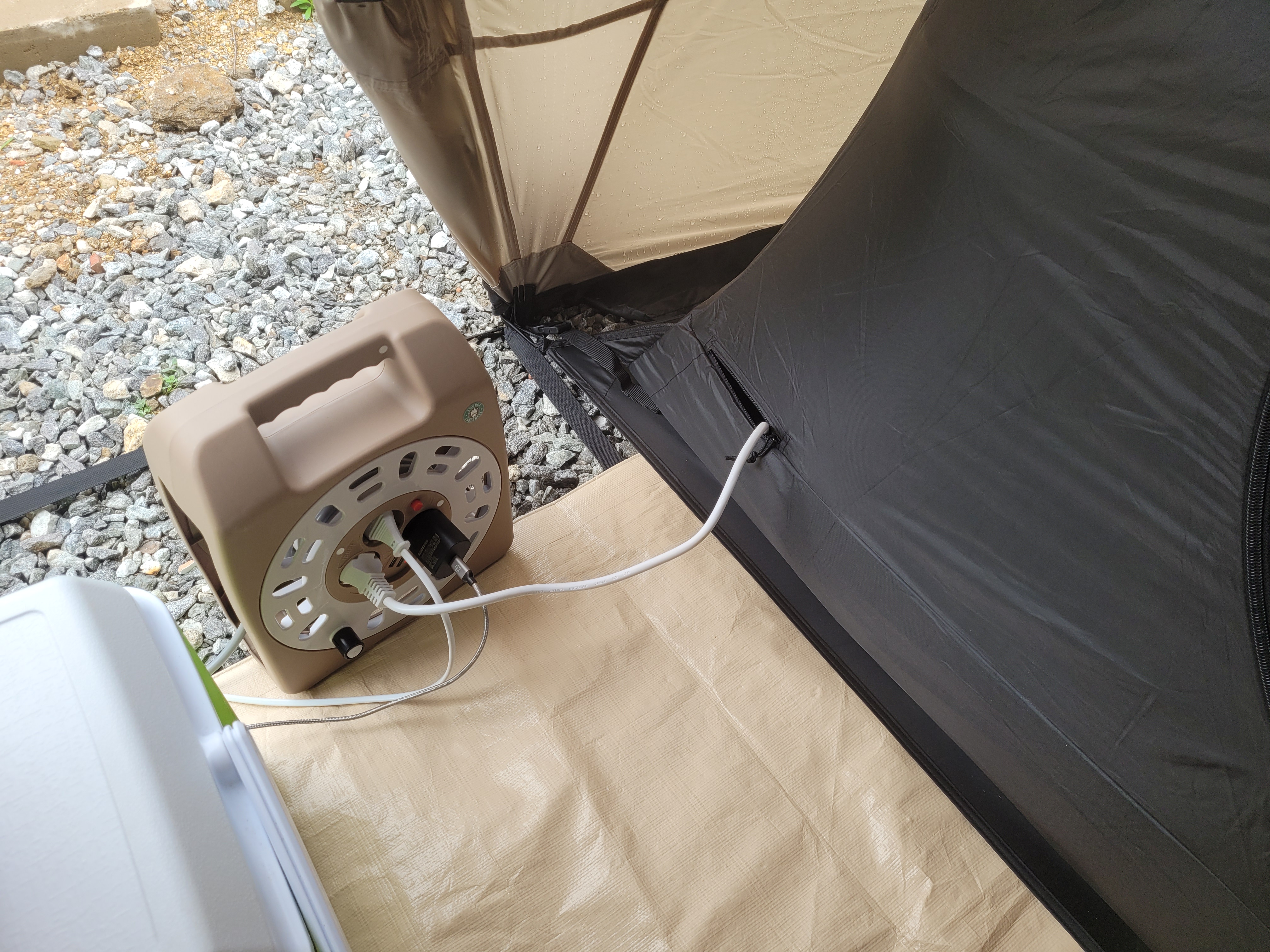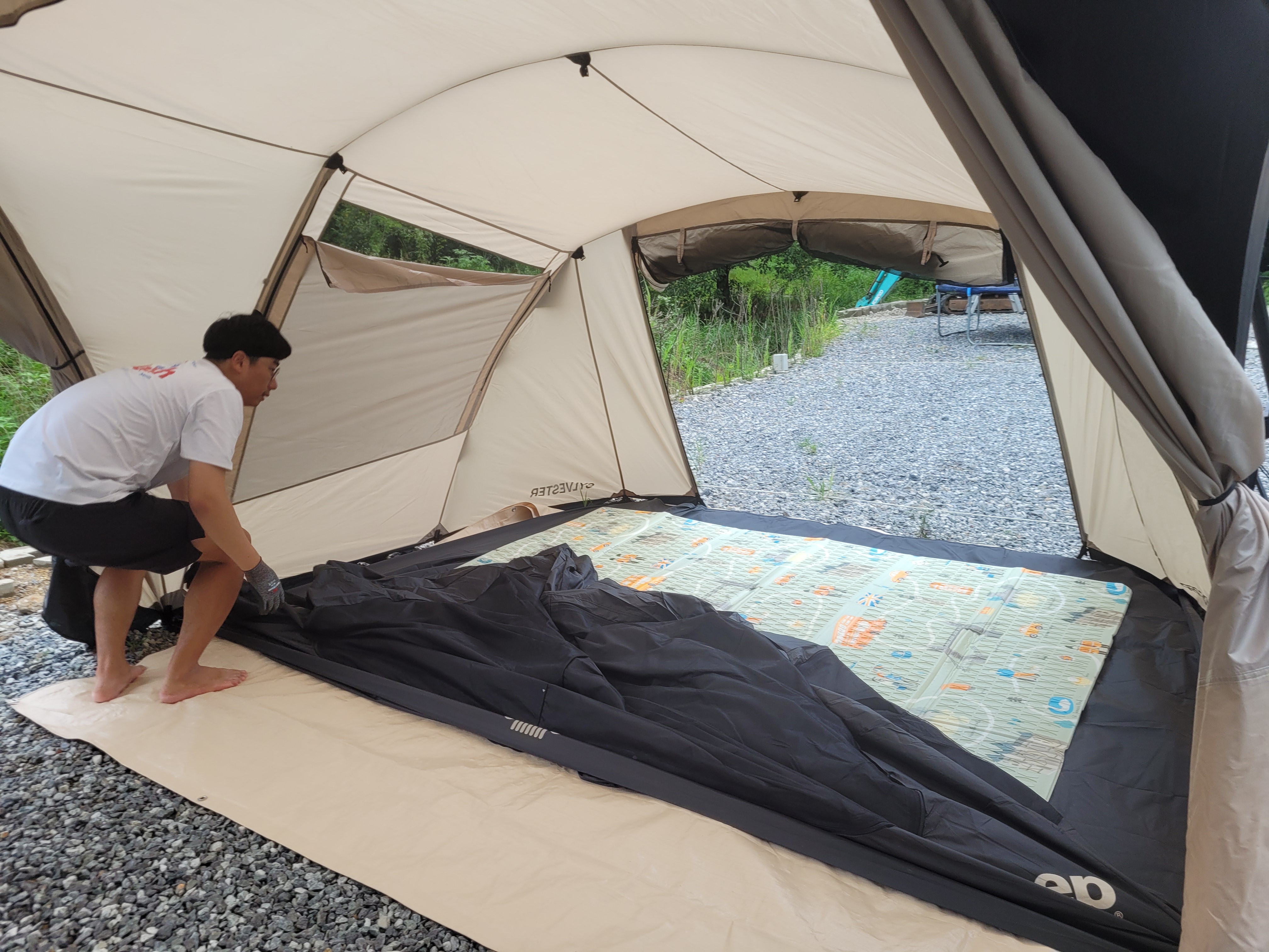 그라운드시트는 반 접어서 이너텐트 쪽에만 깔았어요. 그 위에 이너 그라운드시트를 깔고 이너텐트를 설치합니다. 이너텐트 안에 에어침대와 자충매트도 넣어주고.. 살림살이도 모두 넣어주었어요.