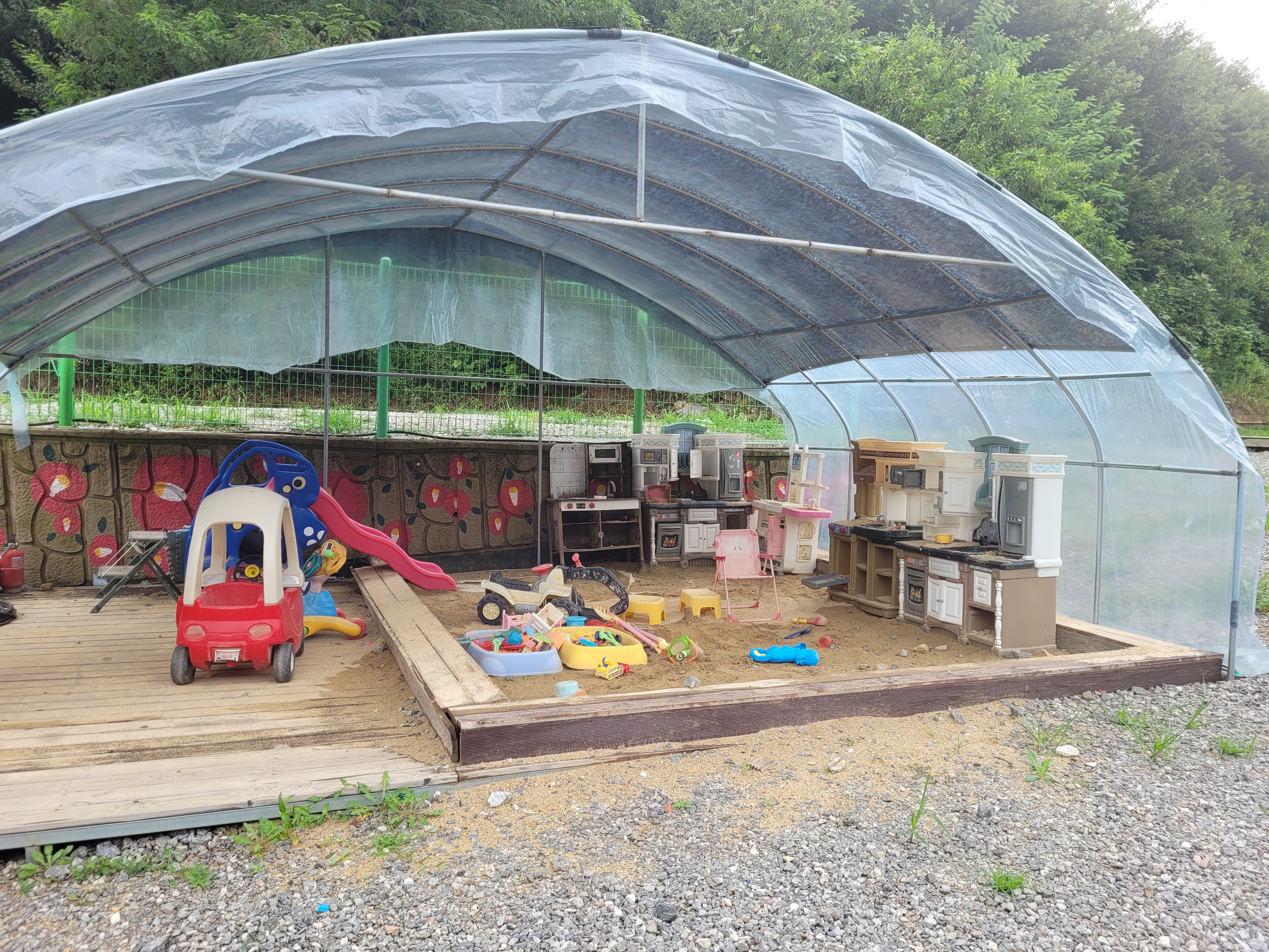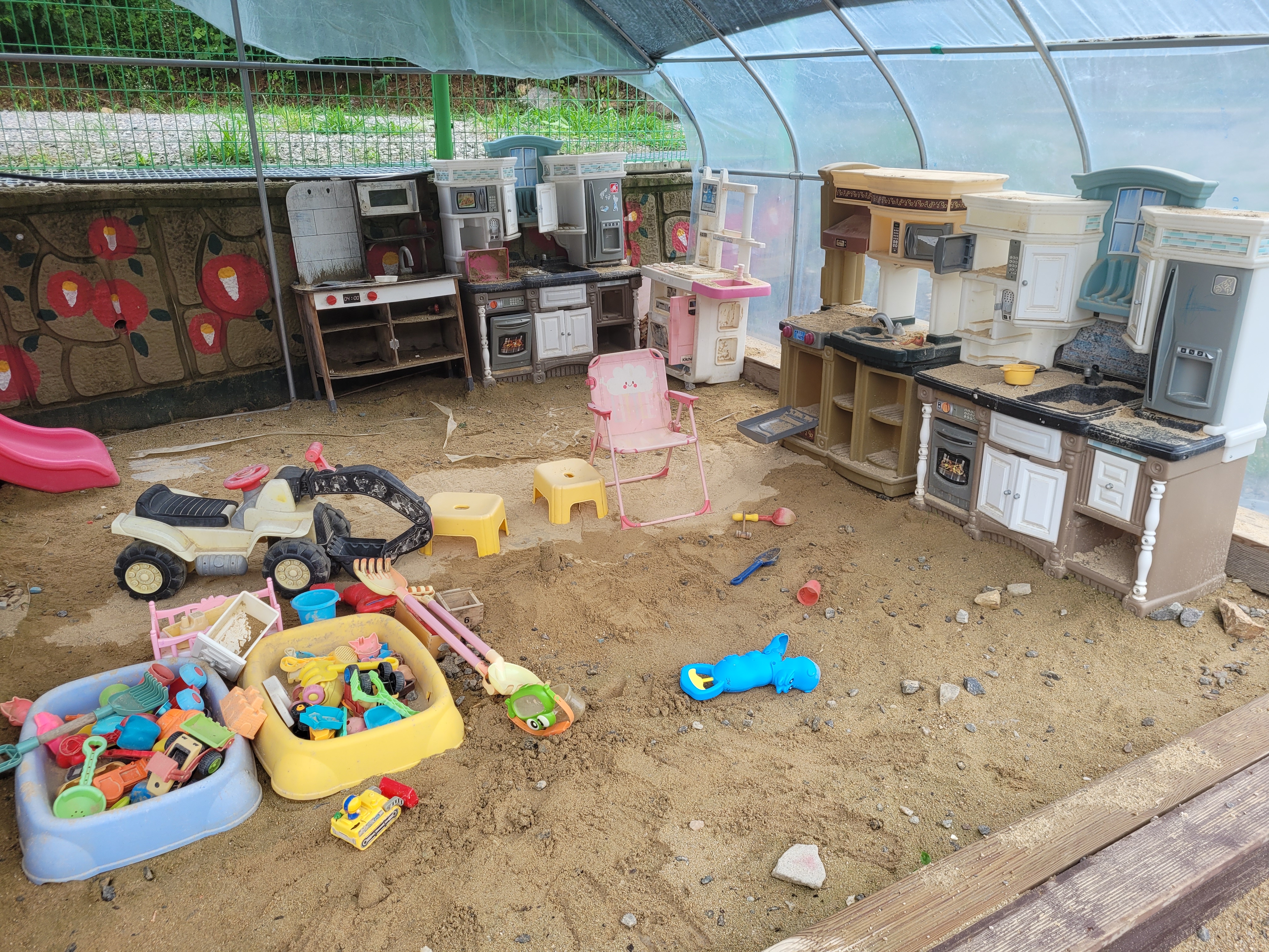 야외에 있다 보니 모래놀이 도구나 주변 장난감이 좀 낡았지만 아이는 잘 놀았어요. 탈 것과 주방놀이도 있어서 어린아이들이 잘 놀더라고요.