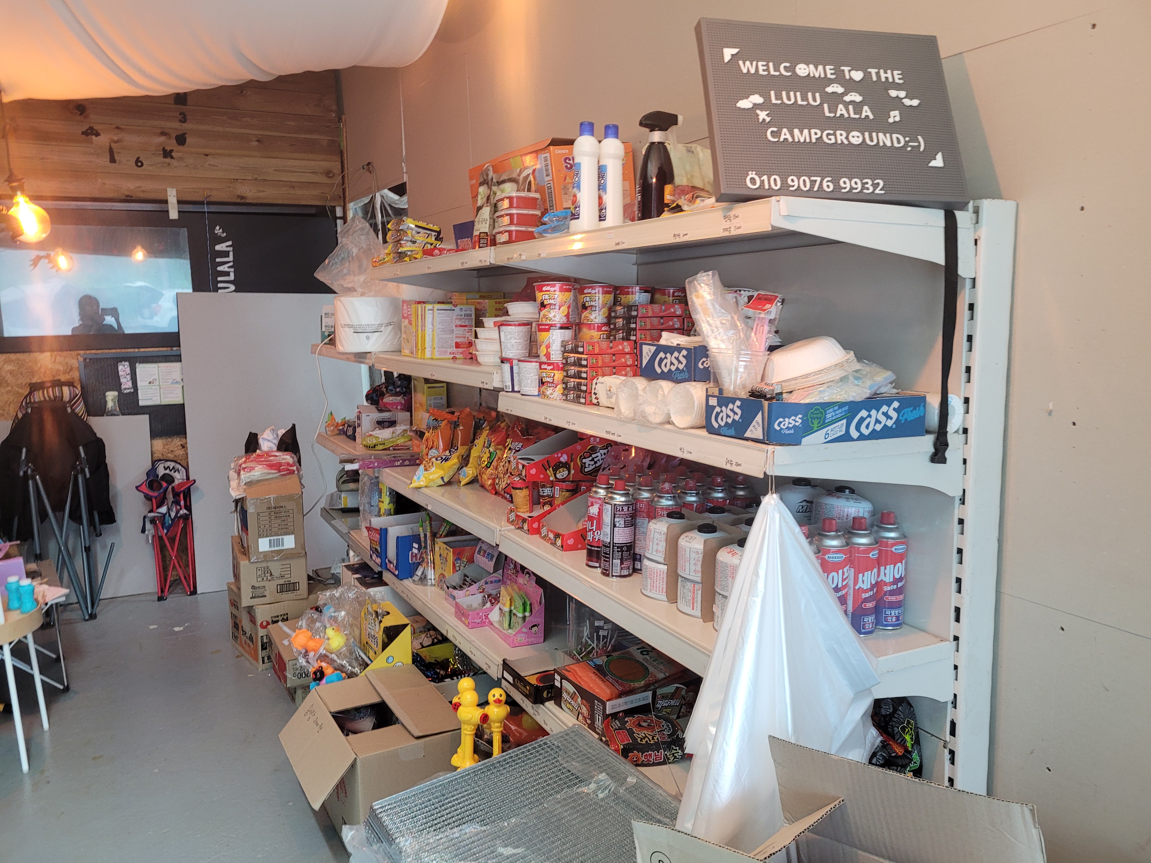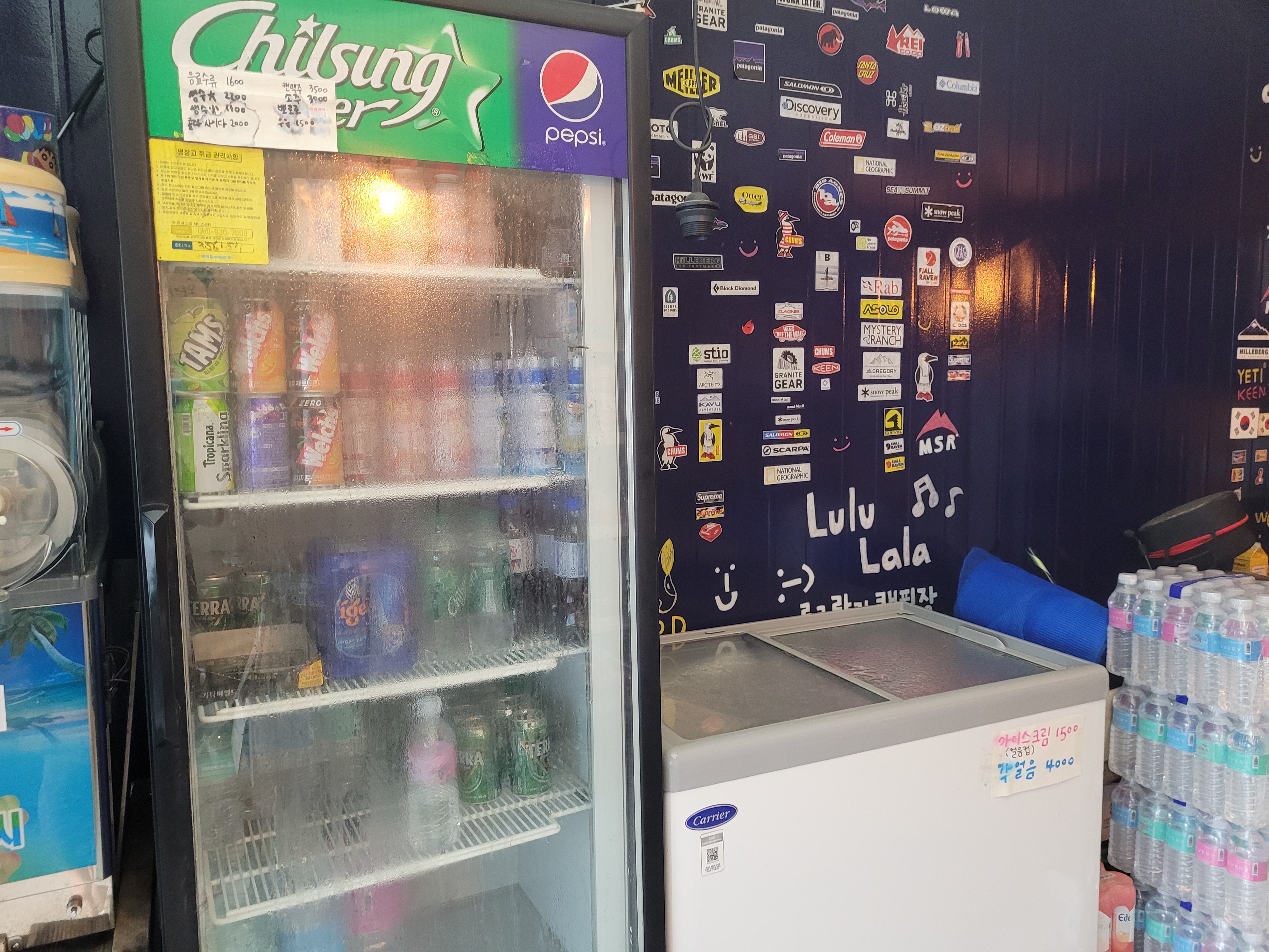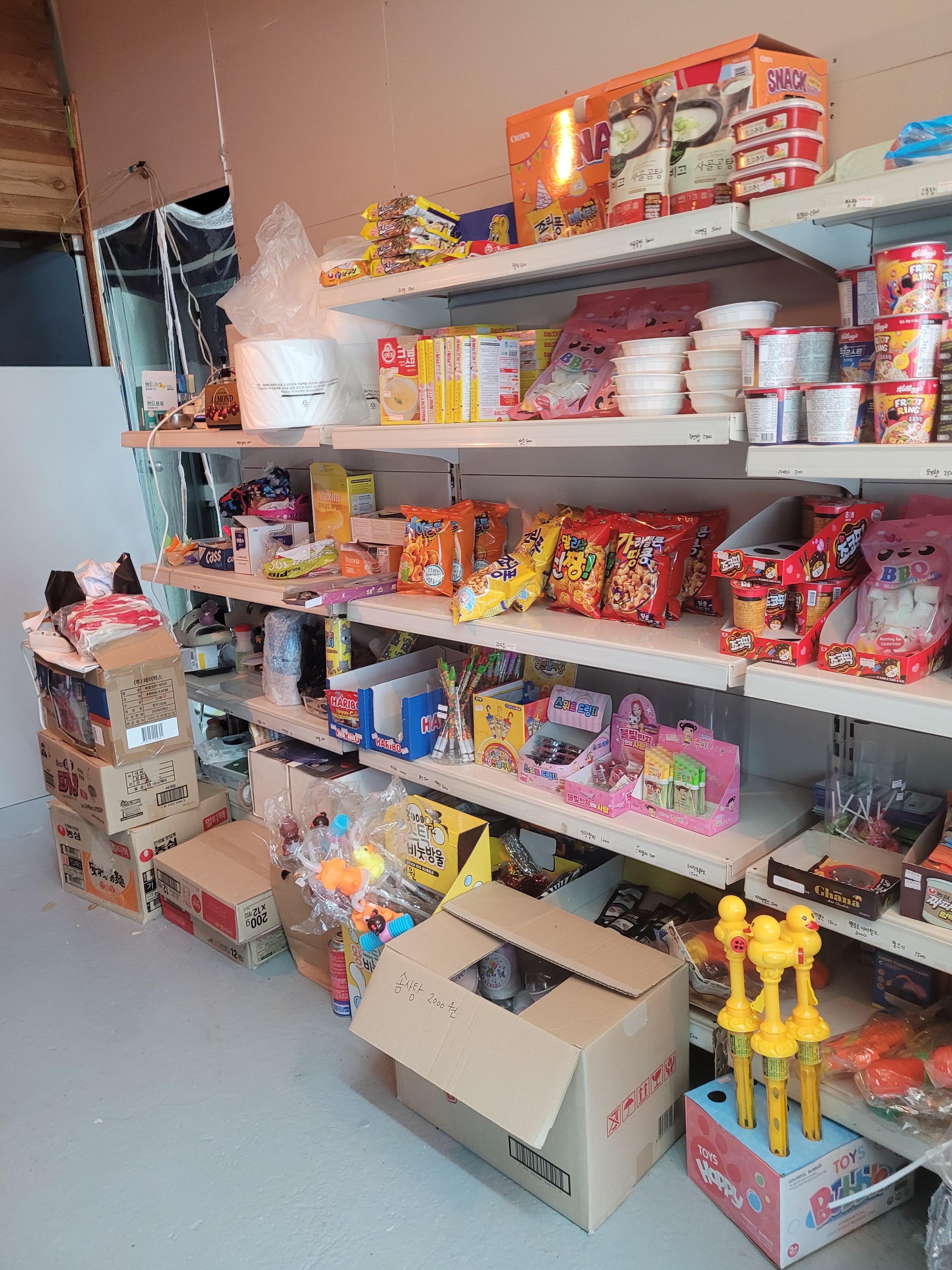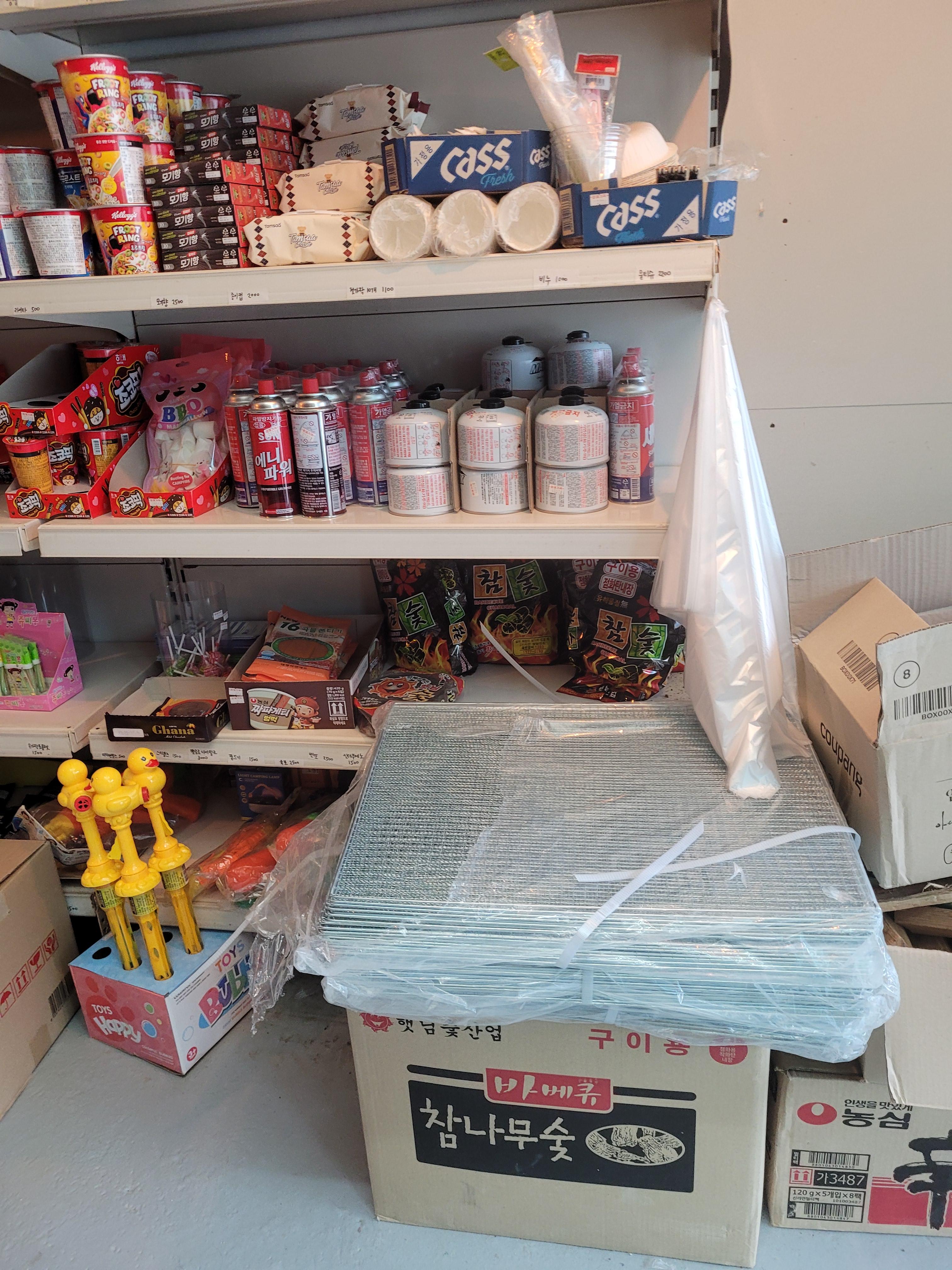 매점에는 음료, 술, 라면, 장작 등 기본적인 것들 갖추고 있었어요. 맥주를 깜빡하고 안챙겨워서 4캔 사 먹었네요. 테라가 3500원이었고, 장작은 현금가로 12000원에 구매했어요.
