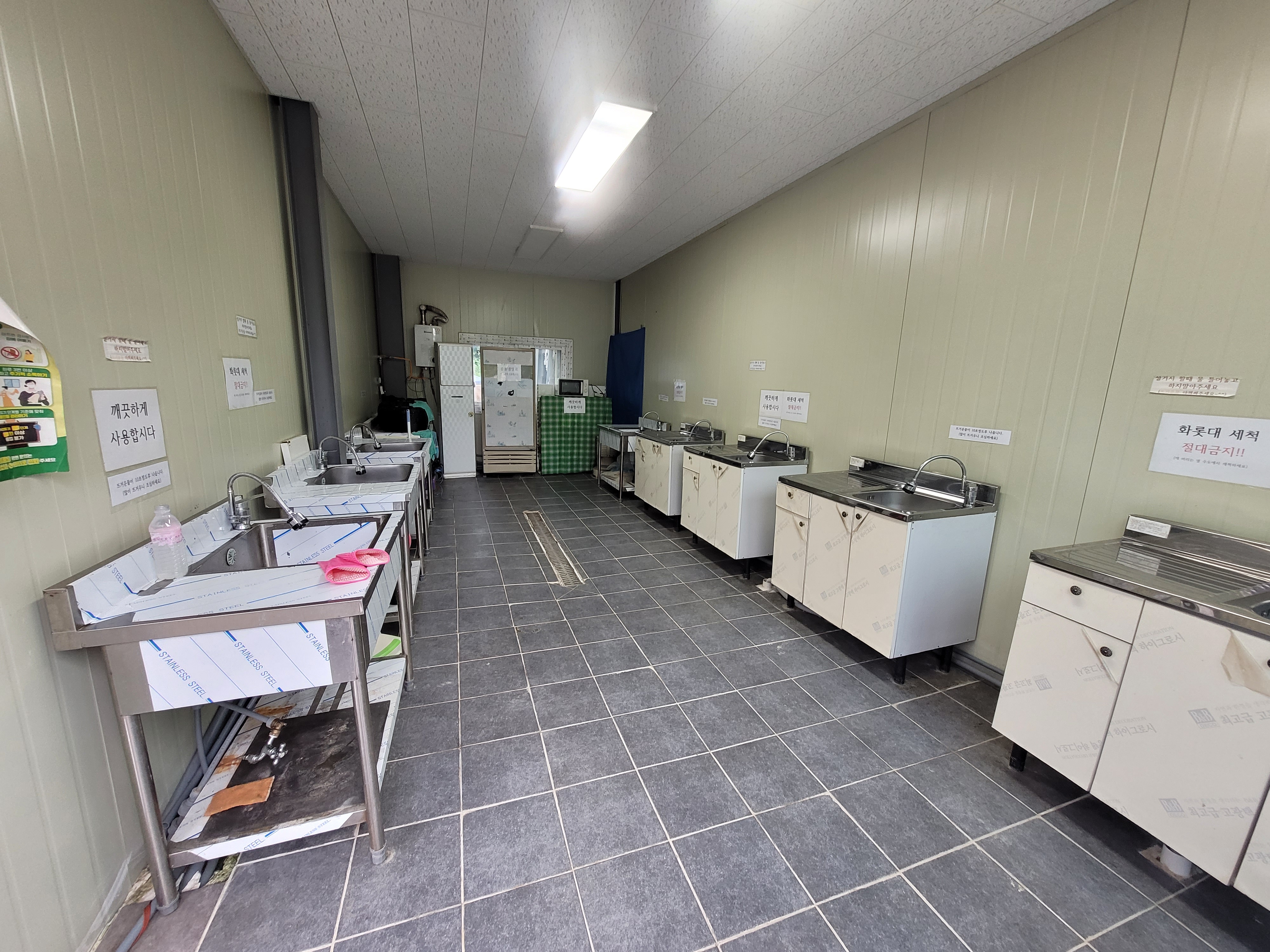 개수대에는 공용냉장고, 전자레인지가 있어요. 공용 냉장고에 음식보관할 수 있어서 편리했어요.