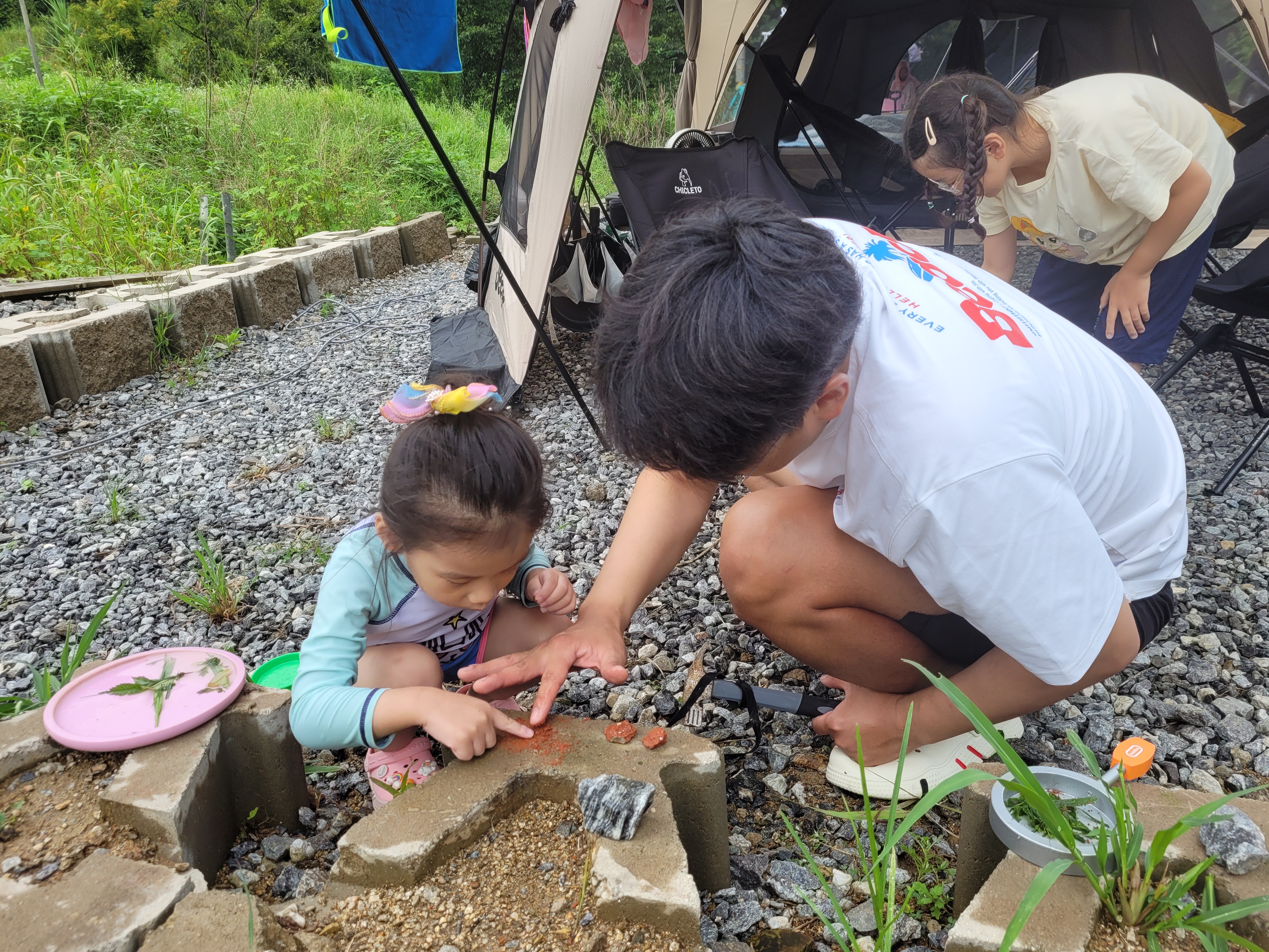 오늘도 다이소 설거지통은 아이 물놀이통이 되었어요. 소꿉놀이하는데 돌 갈아서 고춧가루 만든다고 망치까지 꺼내온 아빠입니다. 각종 돌을 갈아서 소꿉놀이 양념으로 사용했어요 :)
