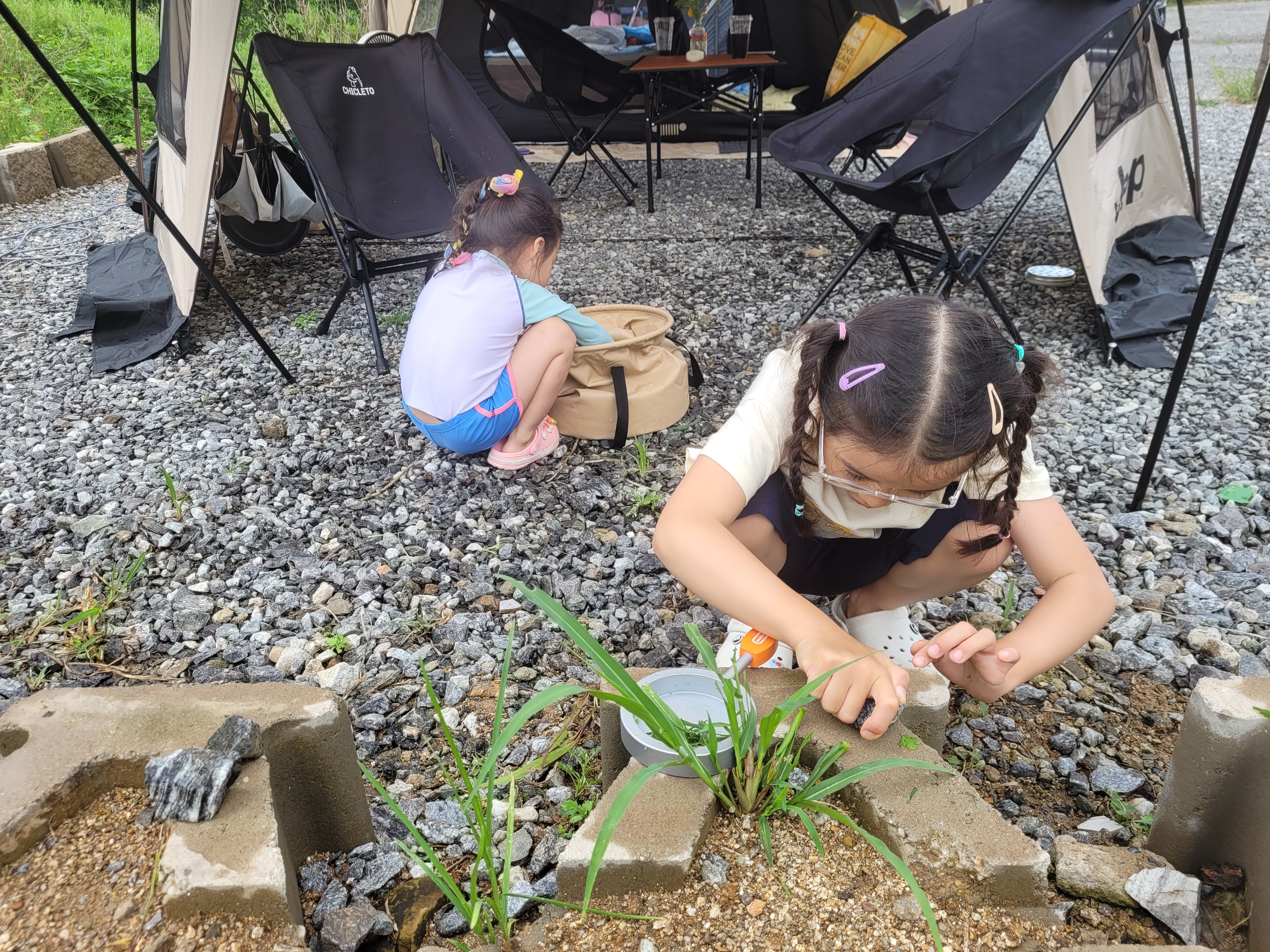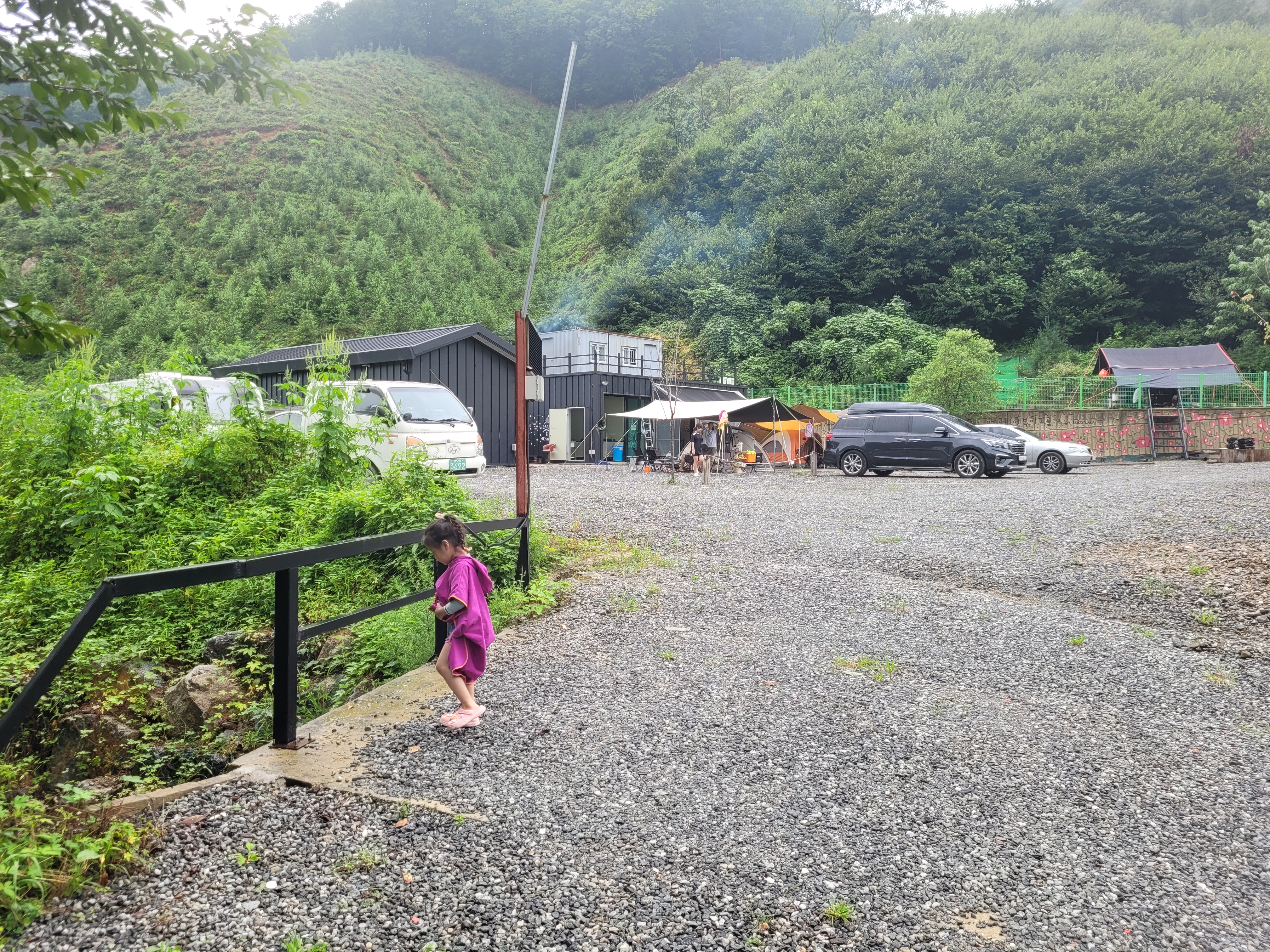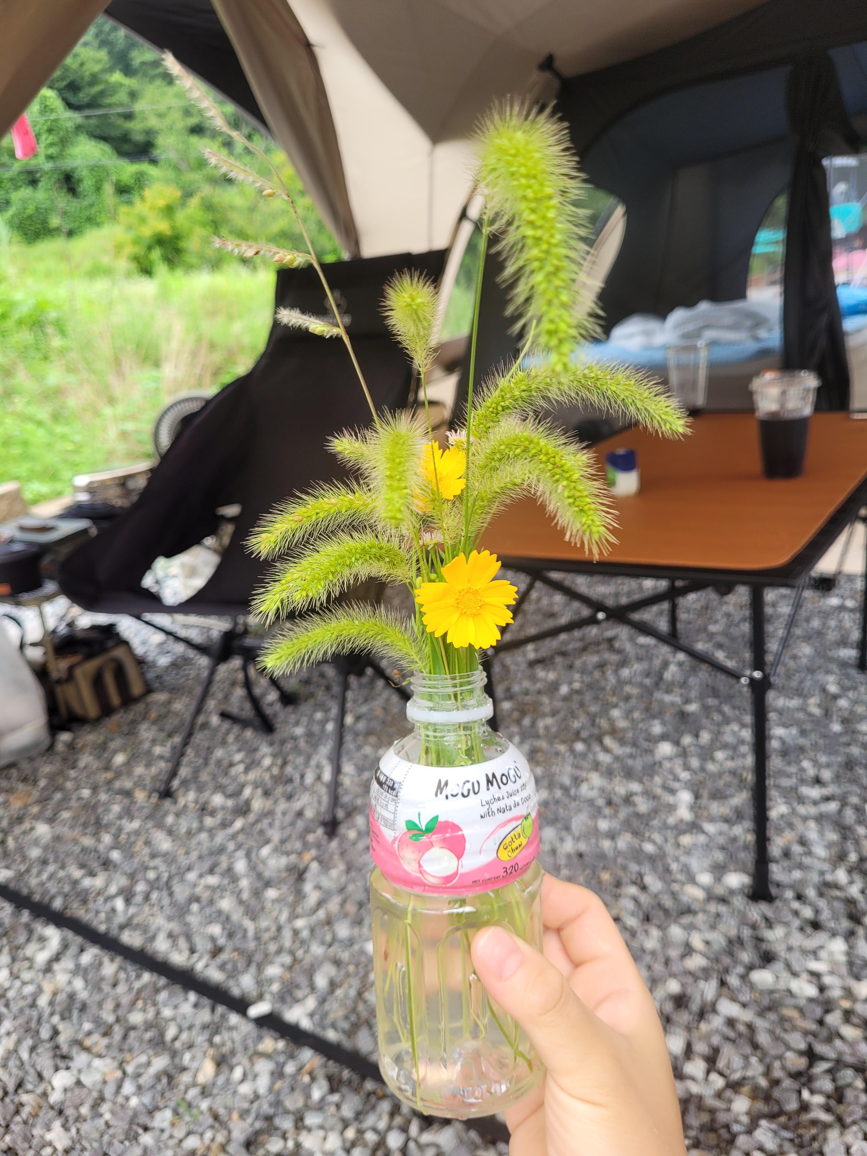 캠핑장 들어가는 입구에 작은 다리가 있어서 돌멩이 던지고 놀기도 하고, 주변 산책하면서 아이와 강아지풀을 뜯어왔는데 음료수 병에 꽃꽃이해주니 감성 캠핑이 되었어요 :)
