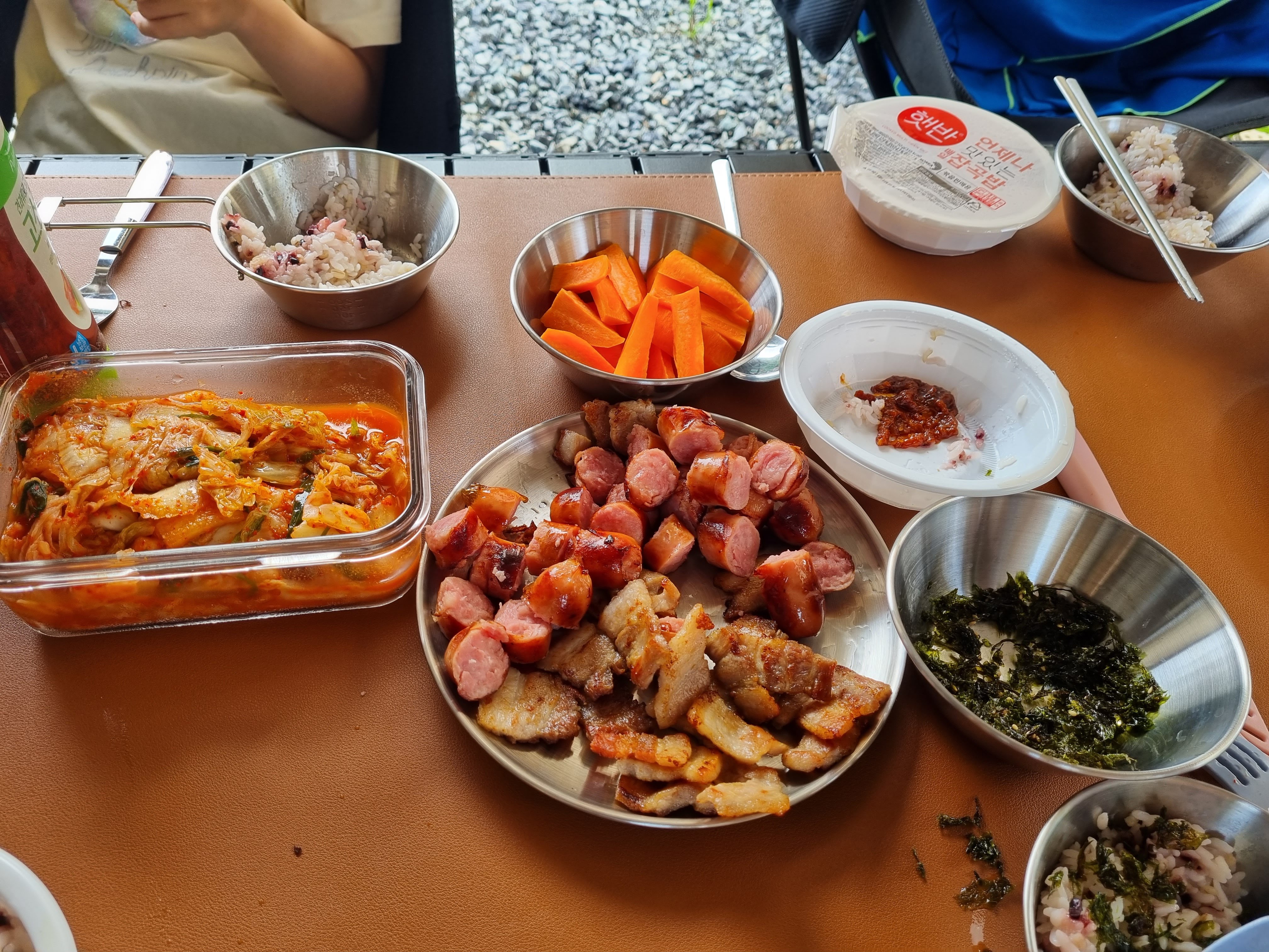 저녁은 간단히(?) 삼겹살과 소시지를 프라이팬에 구워서 먹었어요. 먹을 것에 힘을 빼니까 짐 싸는 게 훨씬 수월해졌어요~