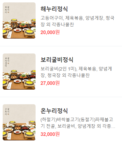 정식메뉴는 해누리정식, 보리굴비정식, 온누리정식이 있어요. 저희는 보리굴비정식 2개와 해누리정식 2개를 시켰고, 아이들이 좋아하는 불고기 단품을 추가해서 주문했습니다.