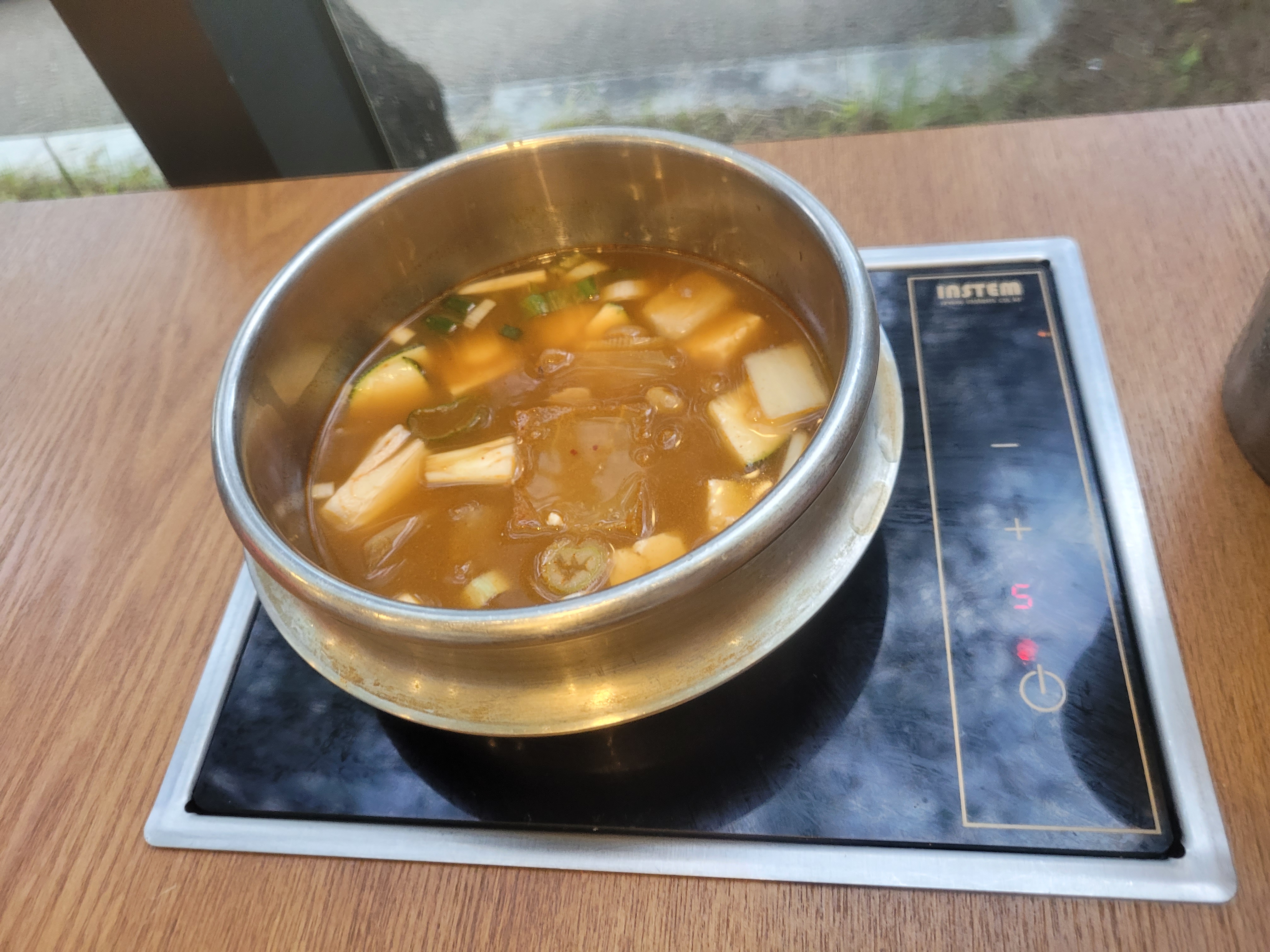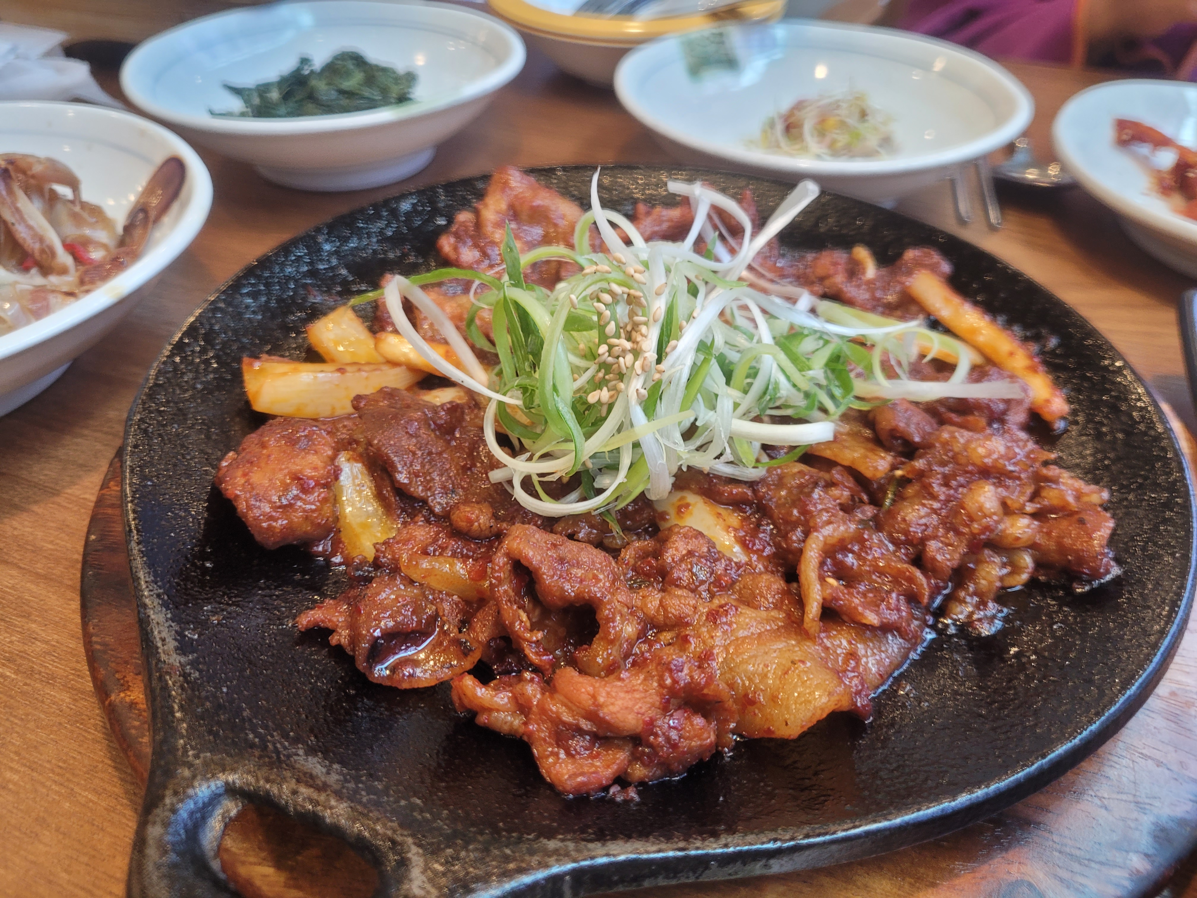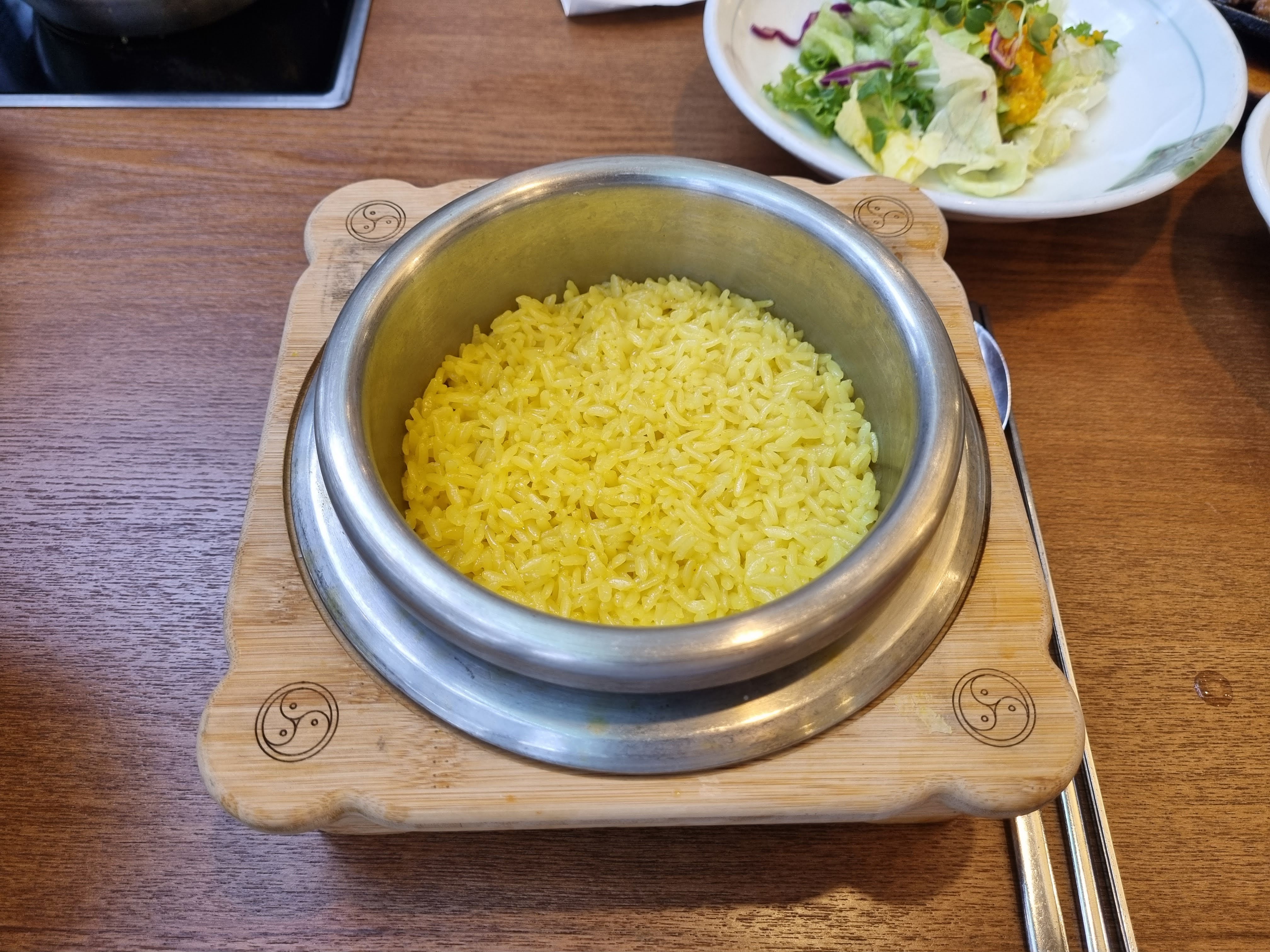 해누리정식과 보리굴비정식, 파채불고기를 시켰는데요. 메인메뉴도 반찬도 정갈하고 맛있었습니다. 밥은 솥밥으로 노란 강황밥이었는데, 강황 특유의 강한 냄새도 없었고 아이도 잘 먹었습니다:) 청국장찌개는 식탁에서 끓여 먹을 수 있게 되어요.