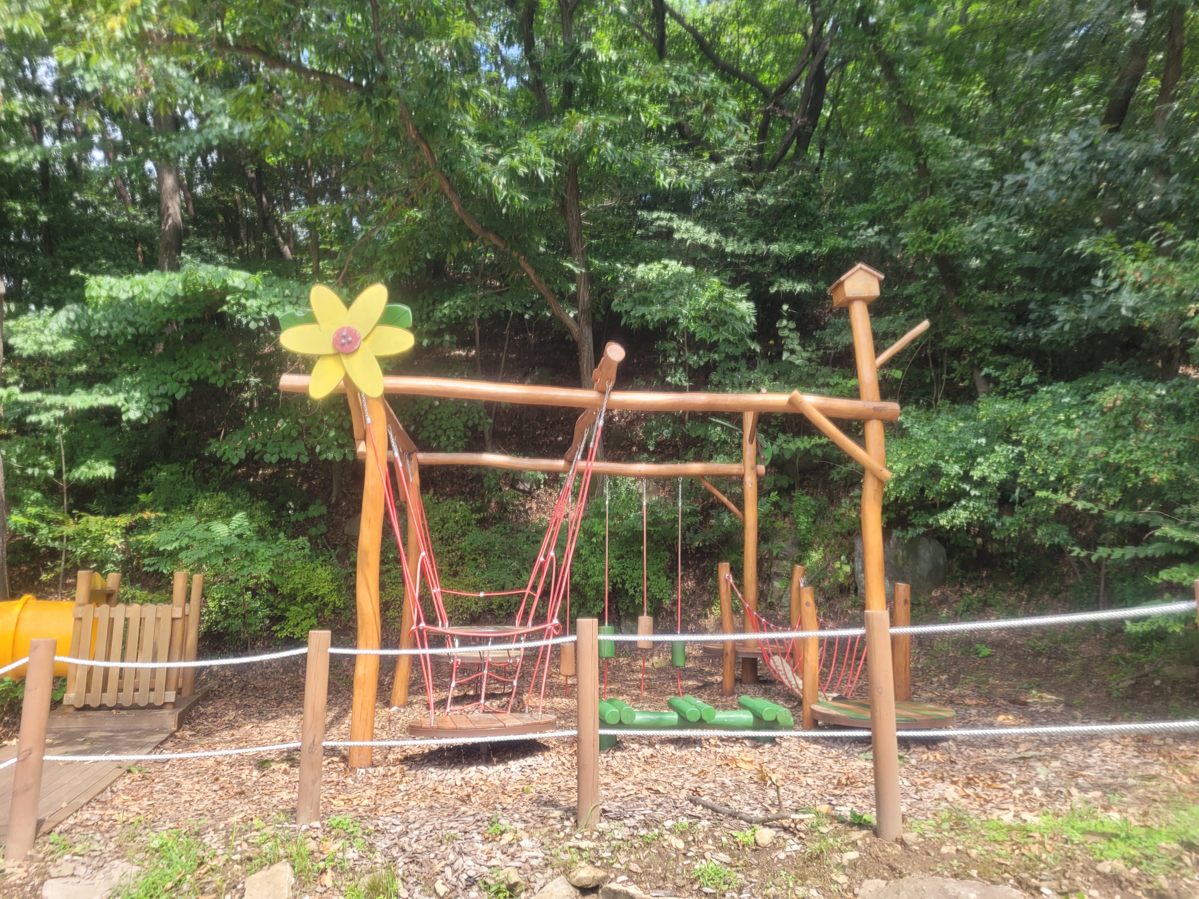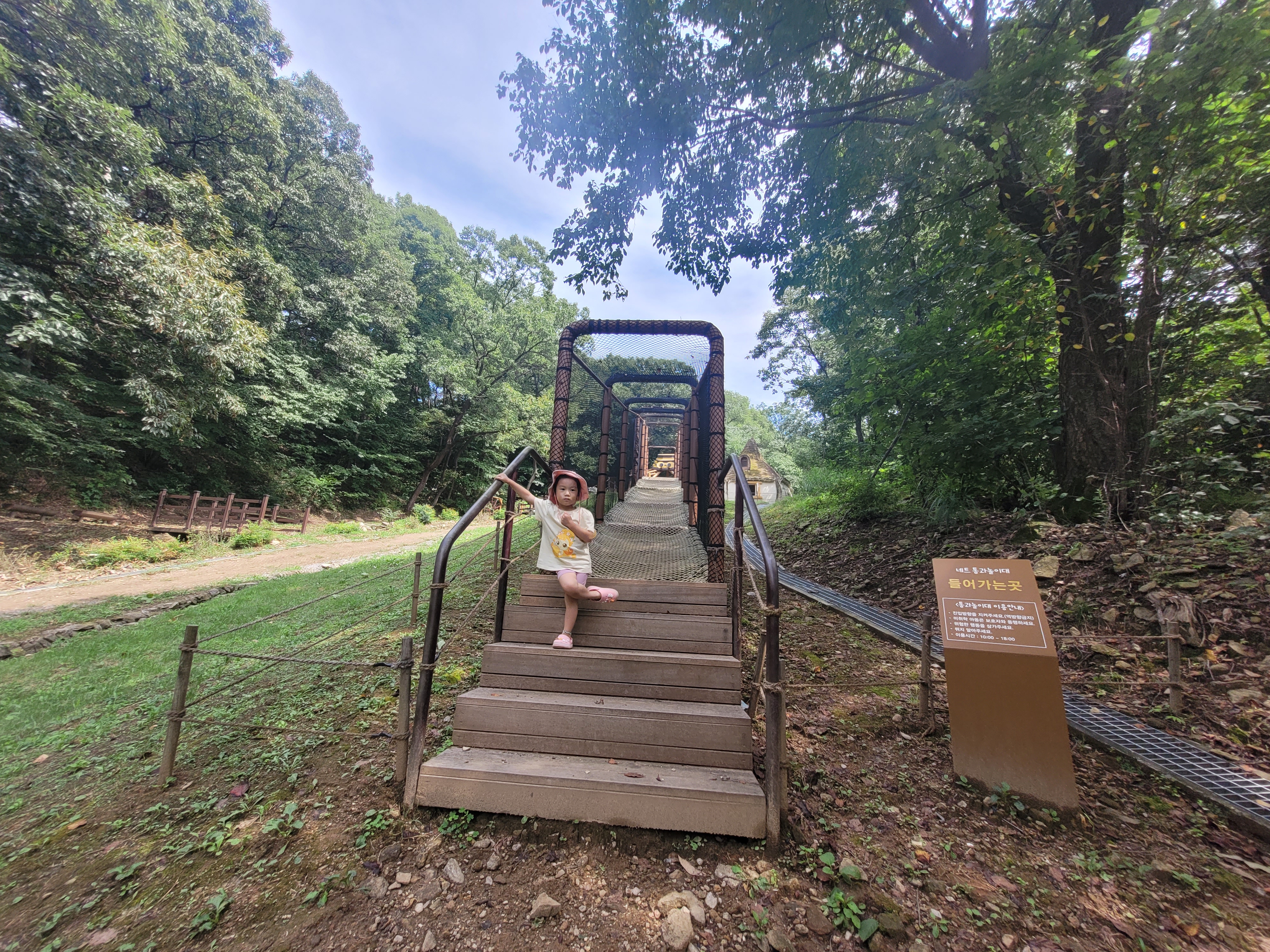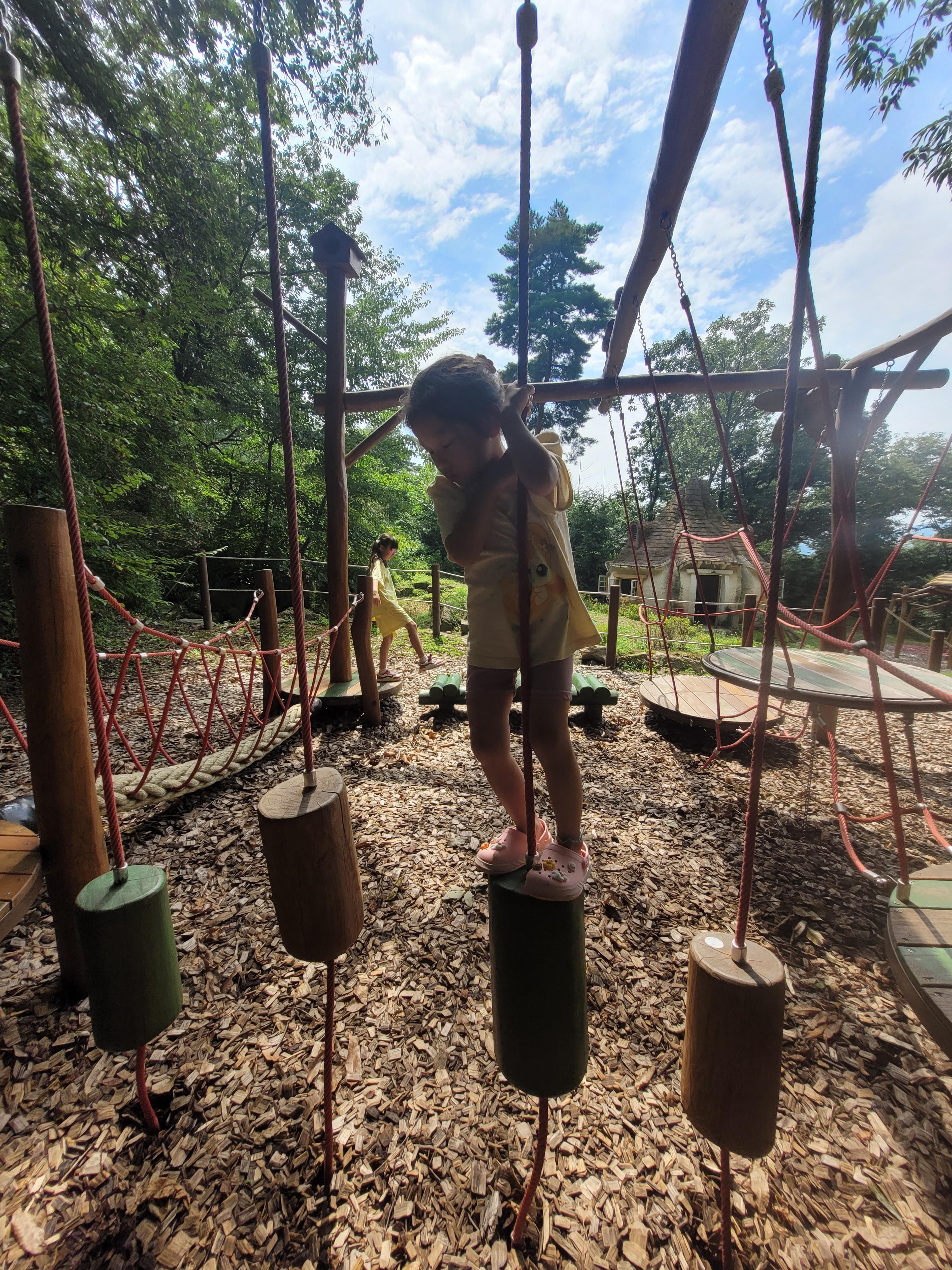 매점 윗편에 있는 유아숲체험원입니다. 어드벤쳐놀이대, 미끄럼틀 등이 있어요. 큰 아이들에게는 조금 시시할 수 있고, 5살 아이는 처음에는 무섭다고 했는데 나중에는 모든 시설을 섭렵하며 재밌게 놀았어요.