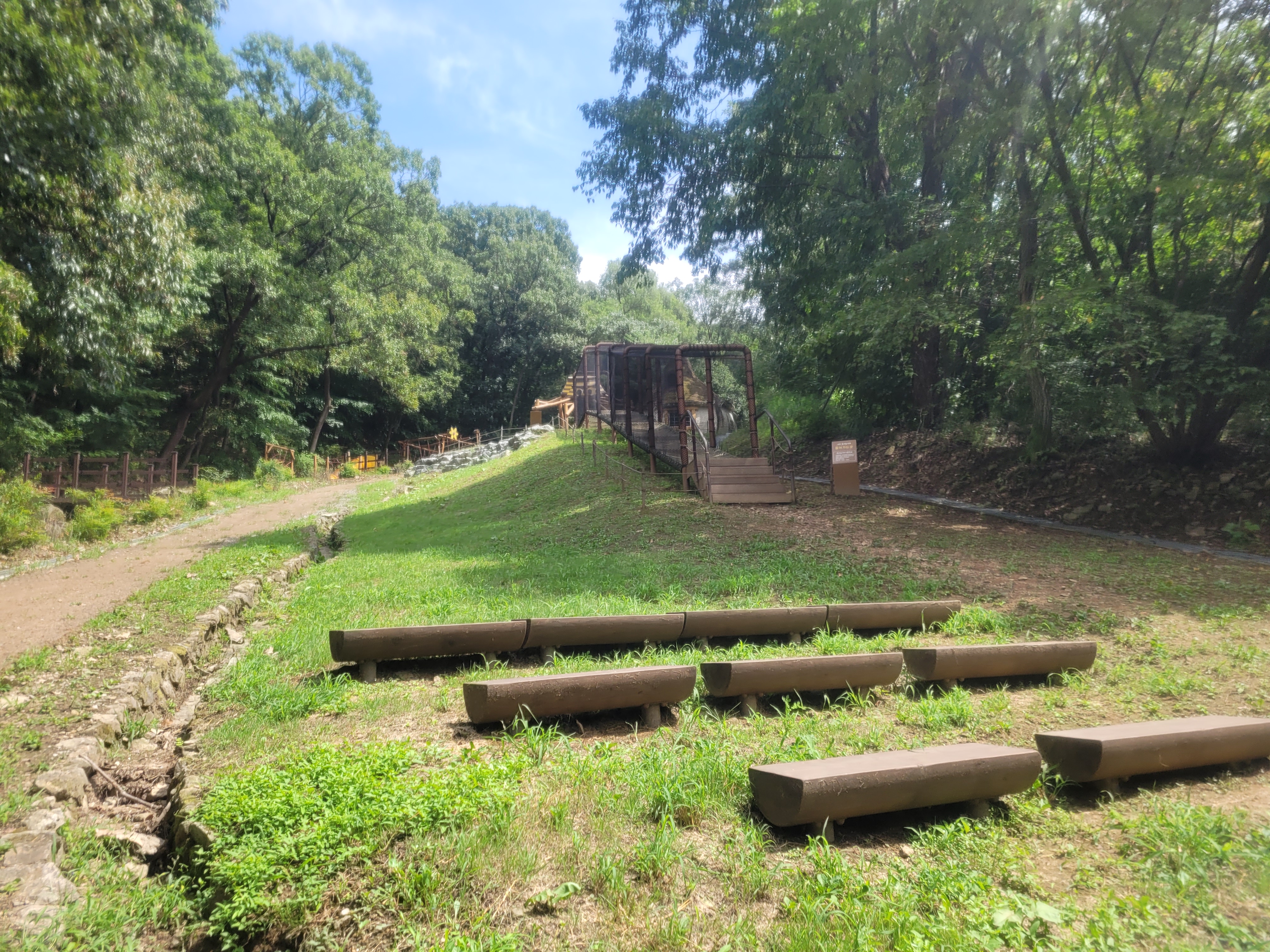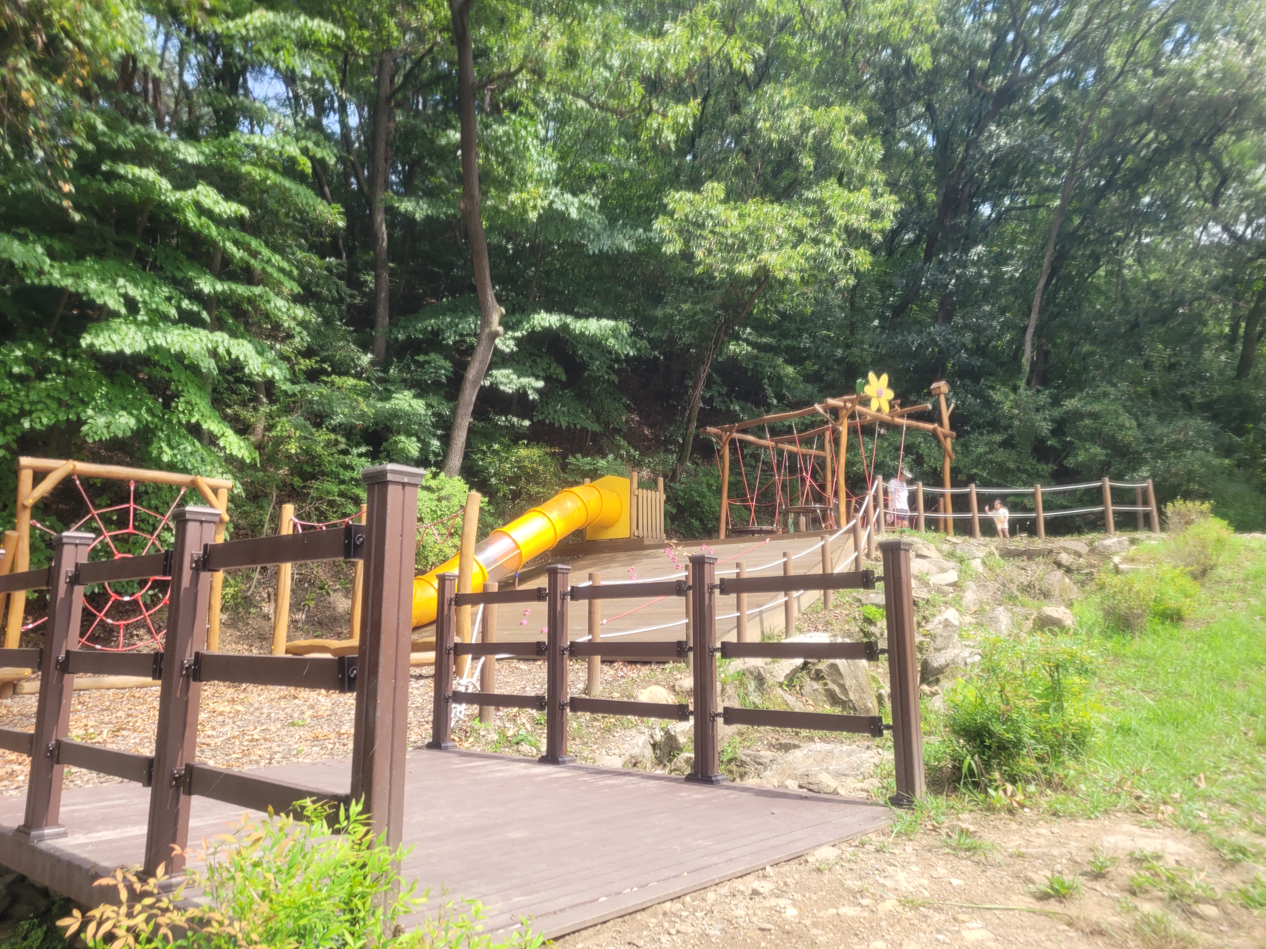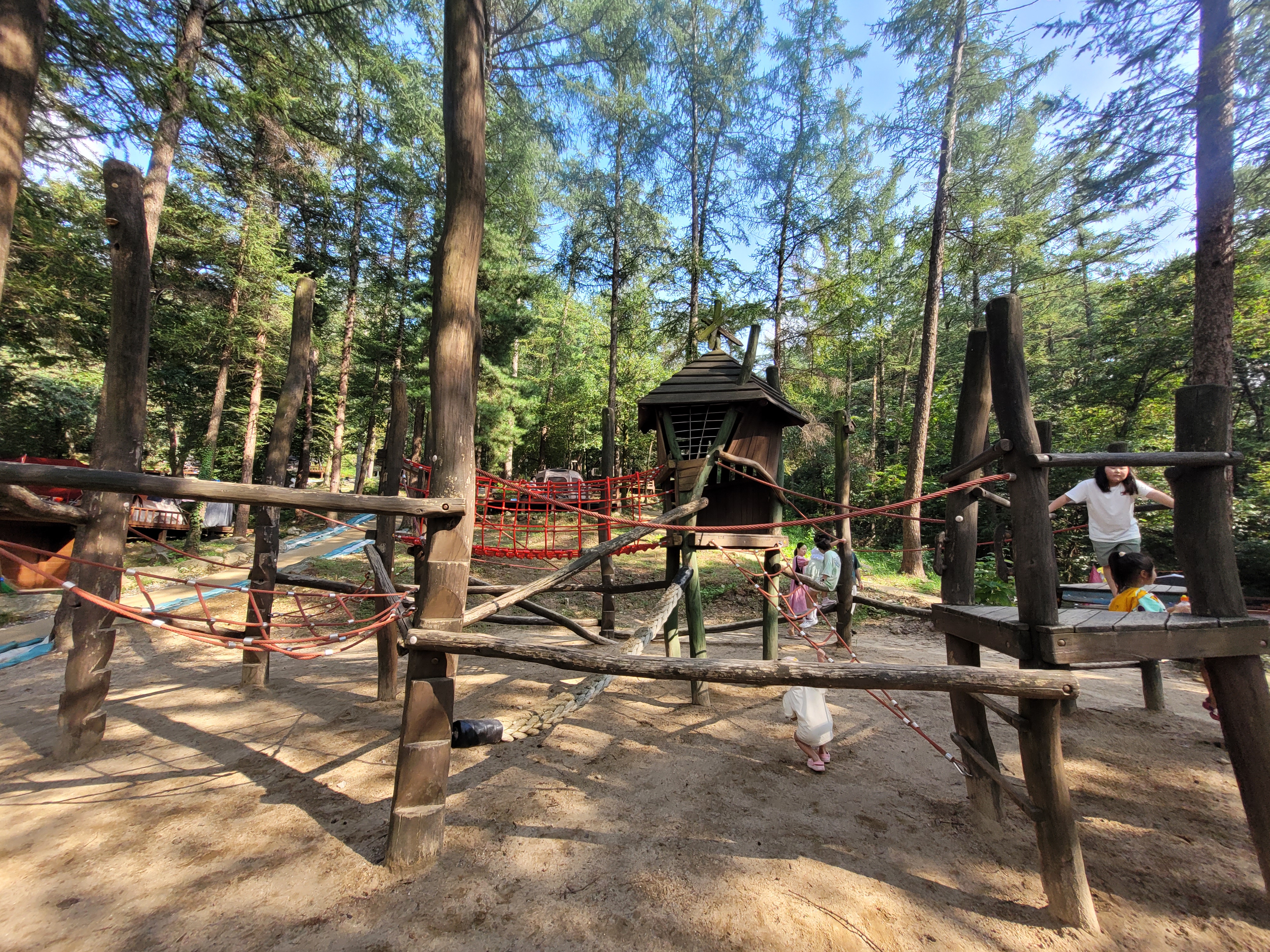 매점 윗편에 있는 유아숲체험원입니다. 어드벤쳐놀이대, 미끄럼틀 등이 있어요. 큰 아이들에게는 조금 시시할 수 있고, 5살 아이는 처음에는 무섭다고 했는데 나중에는 모든 시설을 섭렵하며 재밌게 놀았어요.