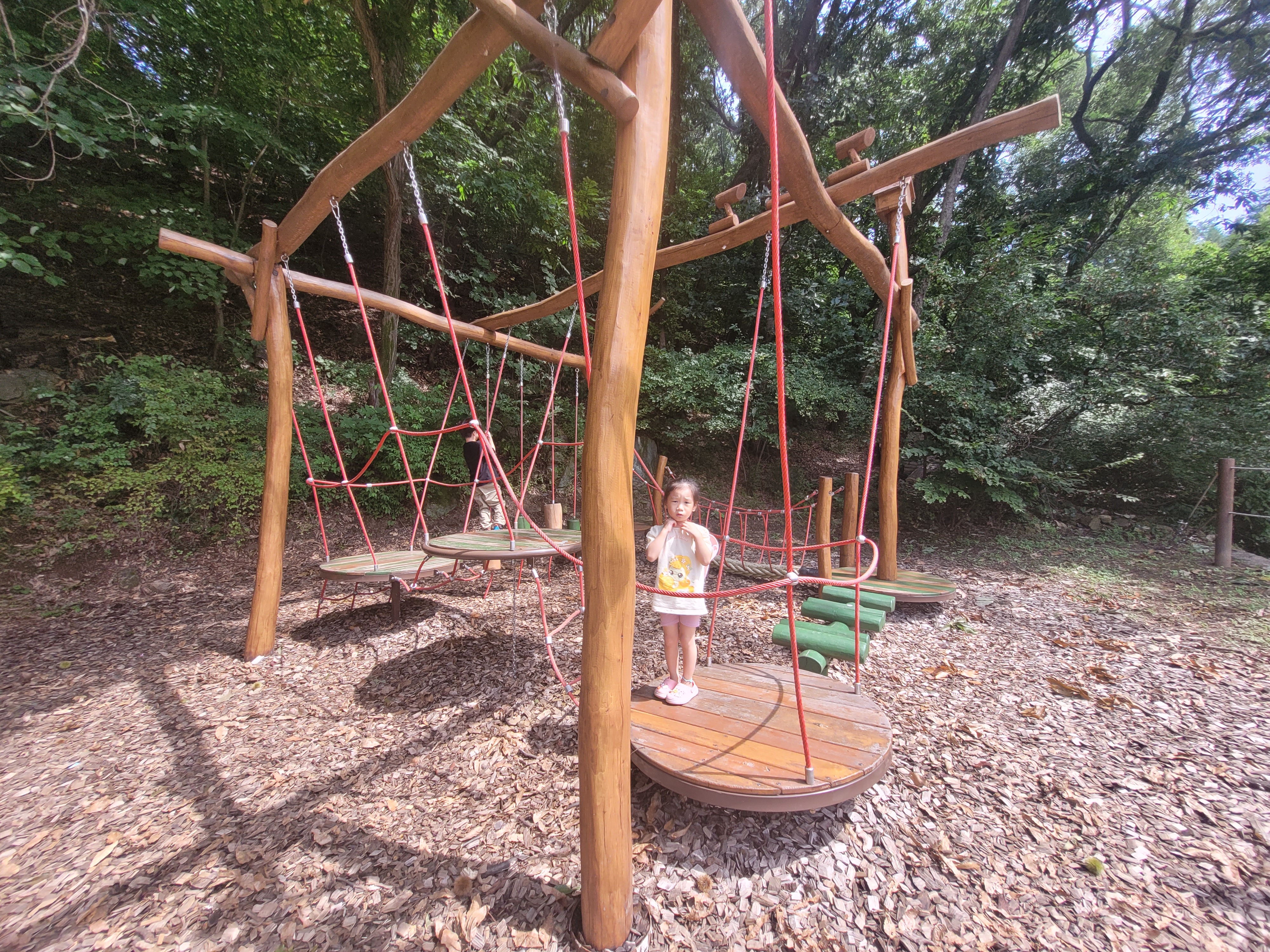 매점 윗편에 있는 유아숲체험원입니다. 어드벤쳐놀이대, 미끄럼틀 등이 있어요. 큰 아이들에게는 조금 시시할 수 있고, 5살 아이는 처음에는 무섭다고 했는데 나중에는 모든 시설을 섭렵하며 재밌게 놀았어요.