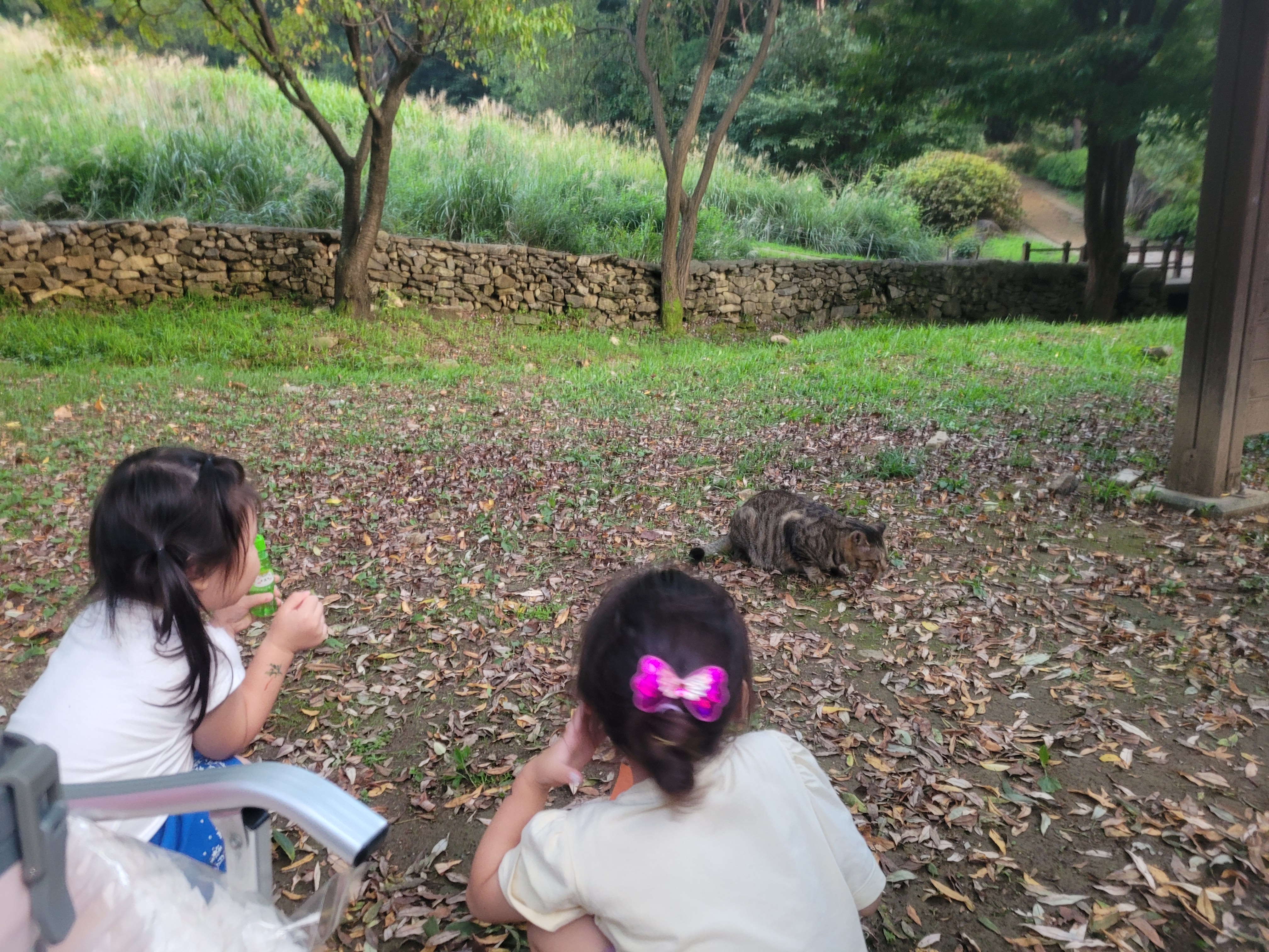 가마골은 방 2개와 화장실1, 거실, 야외에는 바베큐할 수 있는 공간으로 이루어져 있어요. 신나게 놀다보니 사진을 띄엄띄엄 찍었네요. 야외에는 바베큐 그릴과 4~6인 정도 앉을 수 있는 테이블이 있어요. 공간이 넓어서 캠핑용 테이블 2개 설치해서 사용했어요. 옆 숙소에서는 그늘막 설치해서 아이들이 놀게 해주었는데 좋아보였어요! 잔디밭도 넓고 작은 개울도 있어서 아이들이 발담그고 놀 수 있어요. 고기 구우니 고양이들이 한마리씩 와서 고양이 구경하는 재미도 있었어요.
