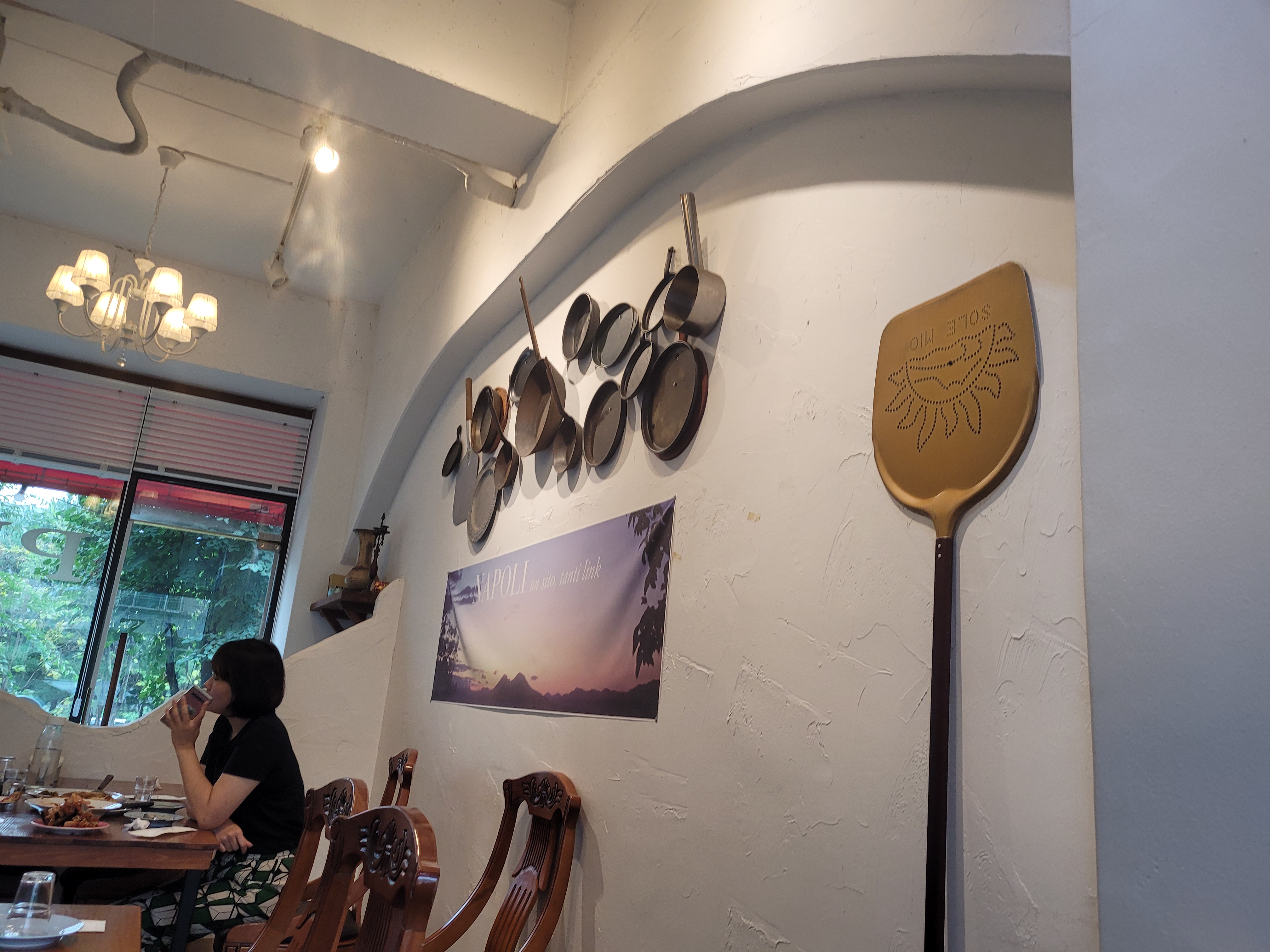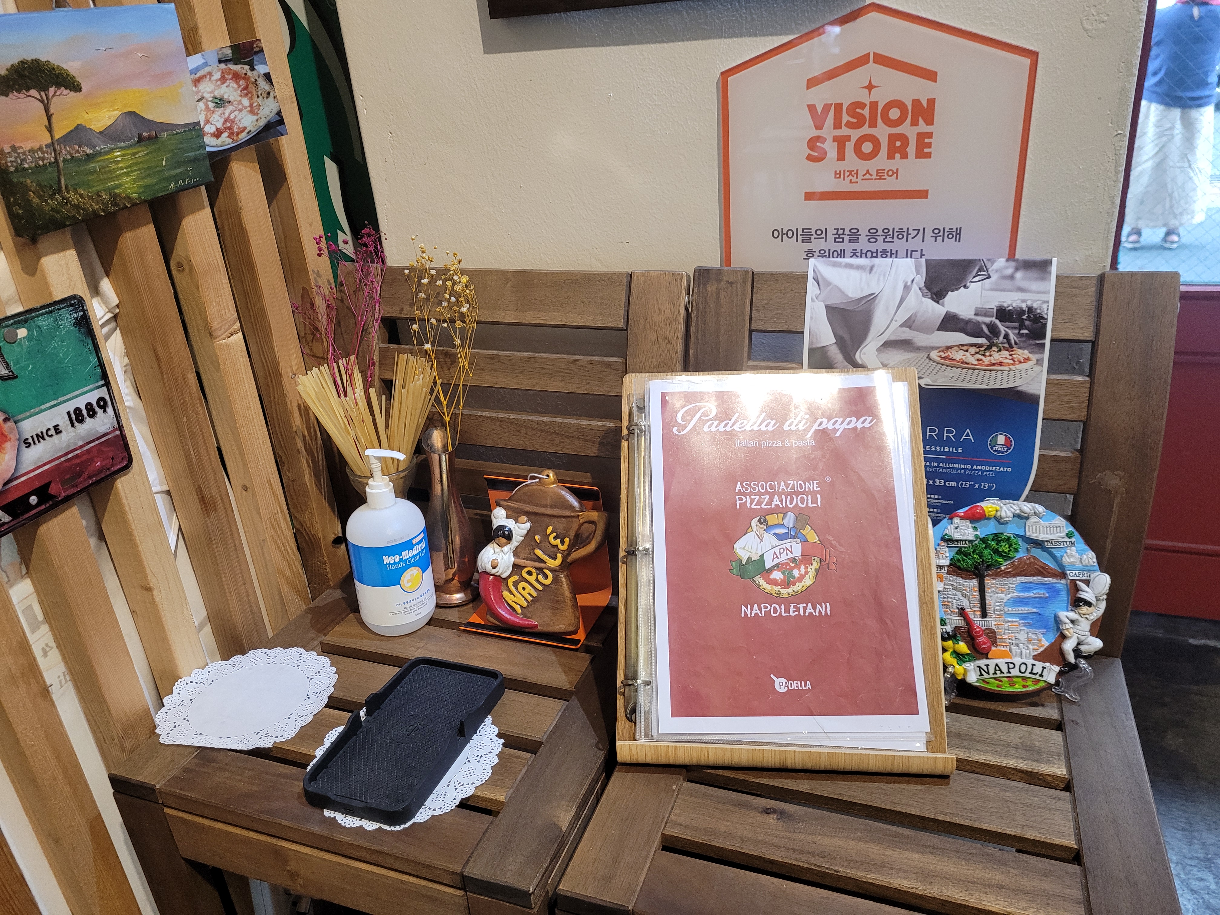 SBS 생활의 달인 출연하셨는지 화덕피자의 달인 명패가 달려있어요. 외관 및 내부가 이탈리아 국기와 지중해 느낌의 하얀 벽으로 깔끔하게 꾸며져 있어요. 셀프 코너에서는 추가로 필요한 접시, 컵, 물, 할라피뇨 등 가져올 수 있어요.