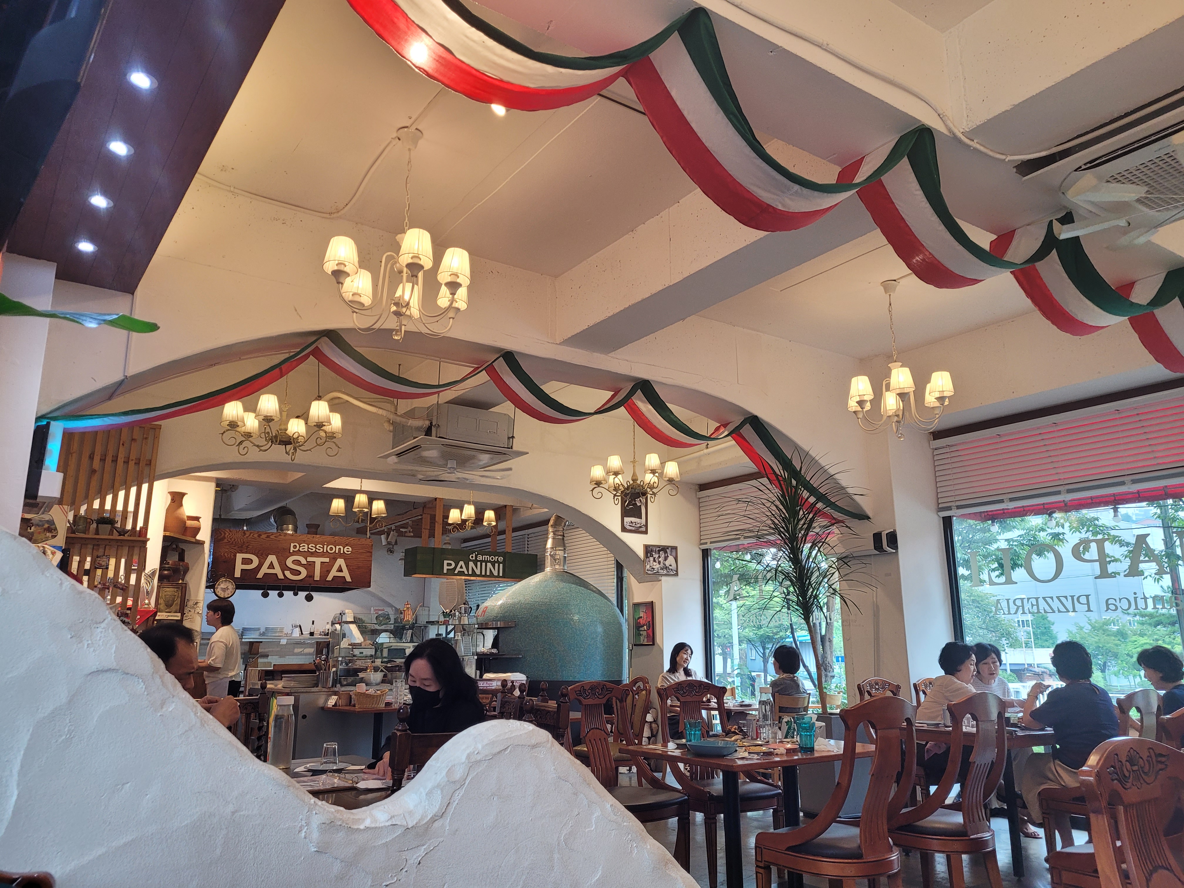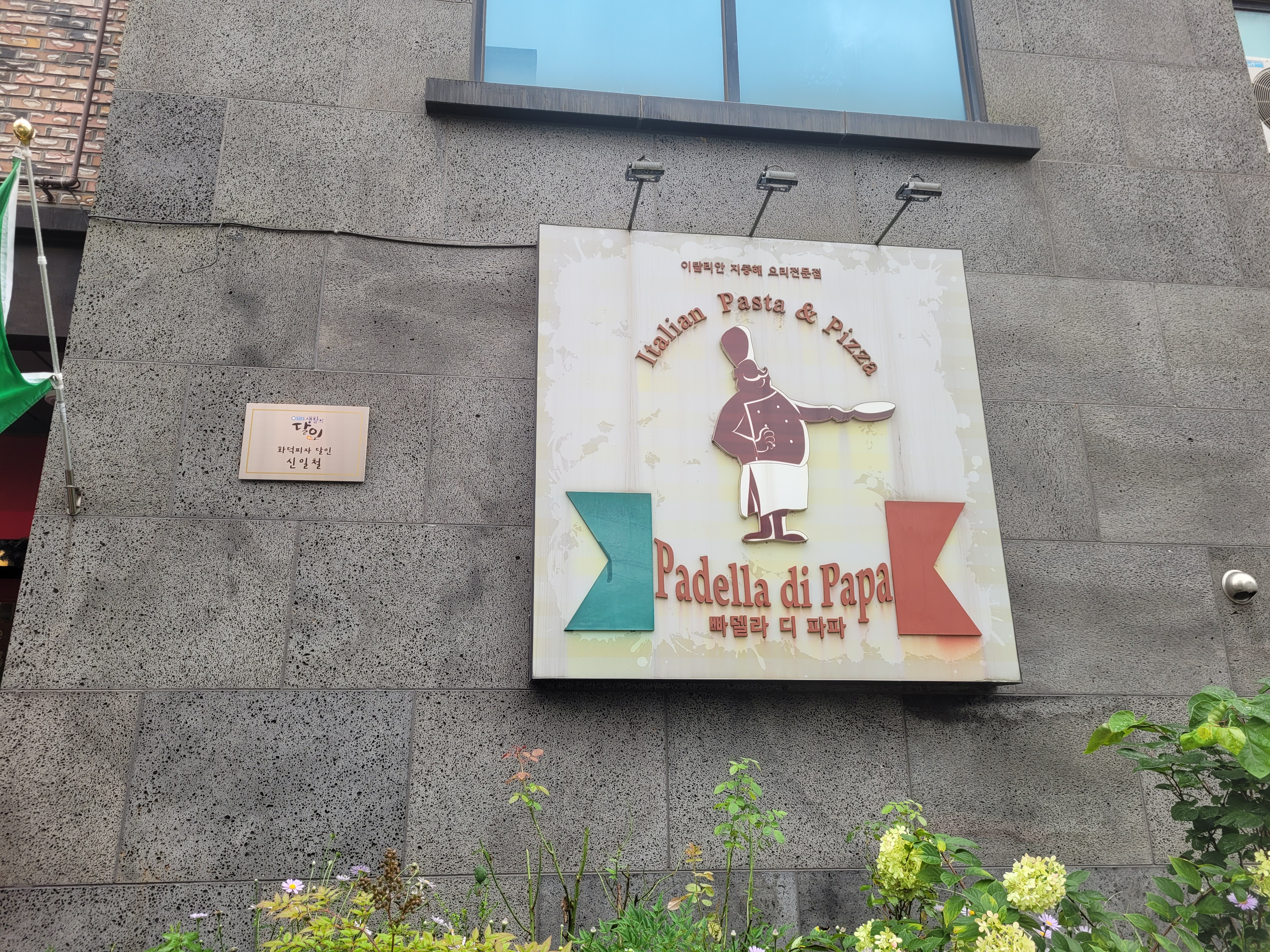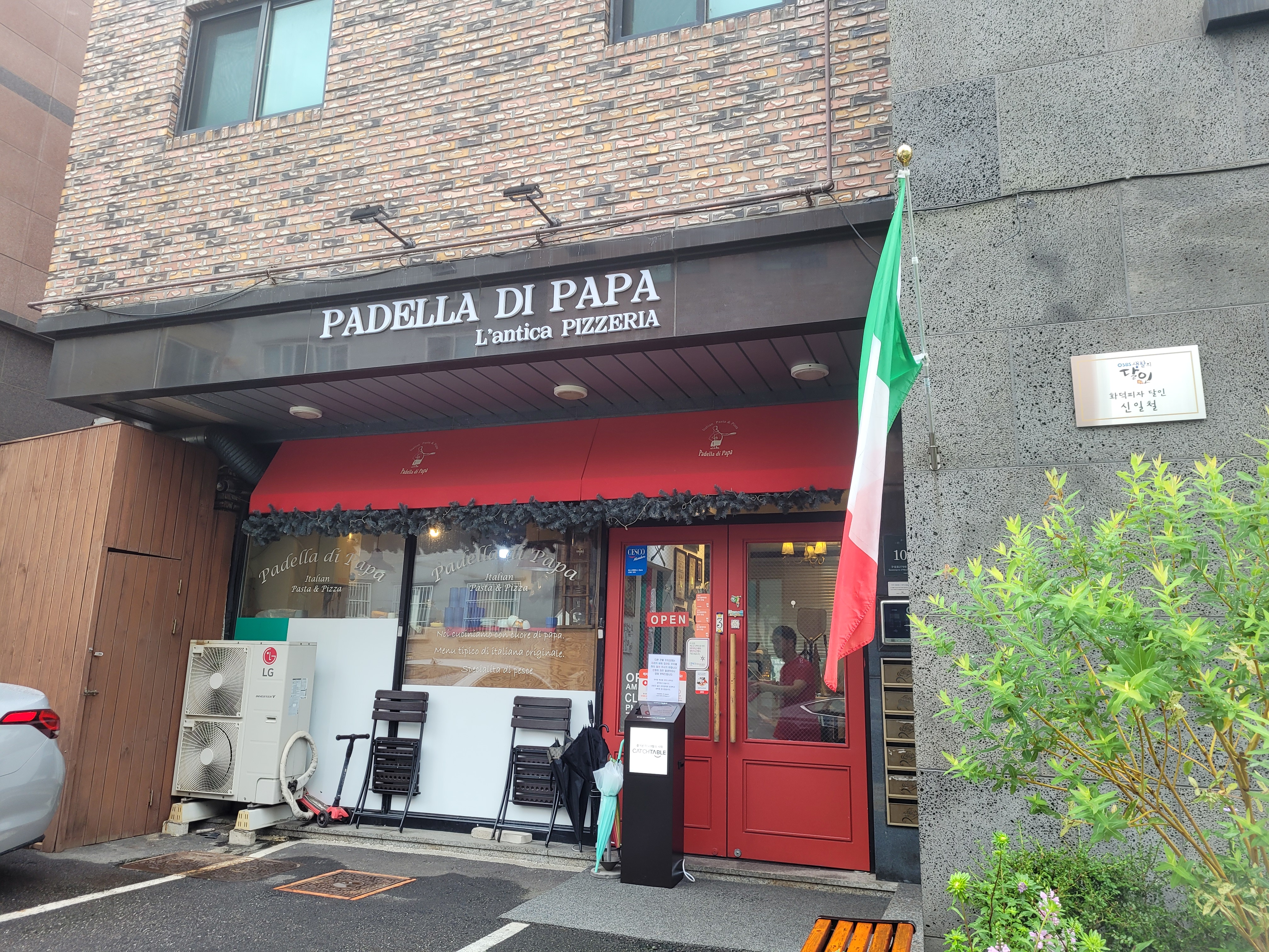 빠델라디파파는 청덕 성당 옆에 위치해 있고, 청덕도서관, 법무연수원, 메가박스와 가까워서 메가박스 용인테크노밸리점에서 영화 관람 후에 이용하기 좋아요. 식당 앞에 이탈리아 국기가 걸려있어서 눈에 띄네요:) 손님이 많지만 주차 공간이 많은 편은 아니어서 주변 골목에 주차했어요.