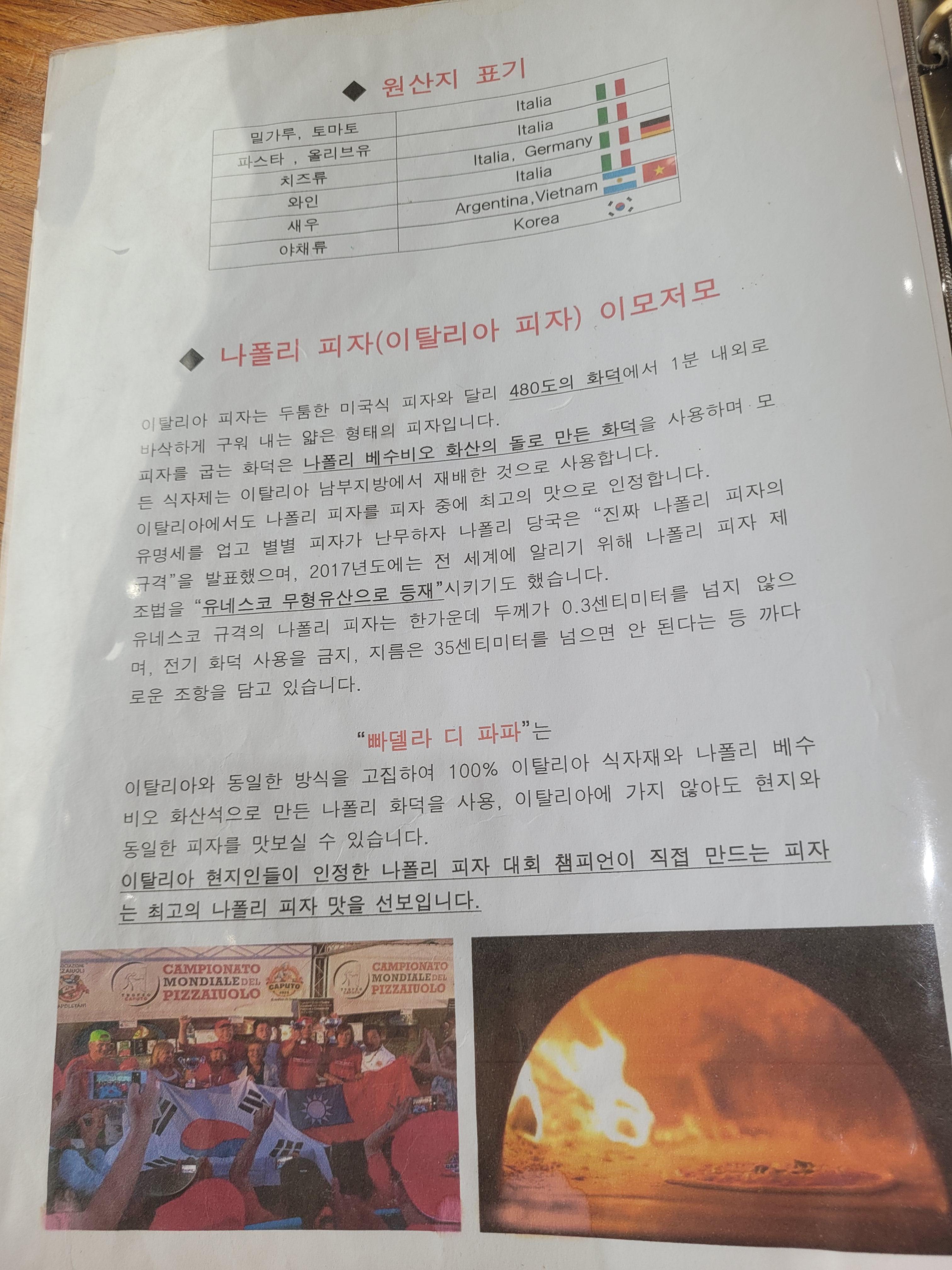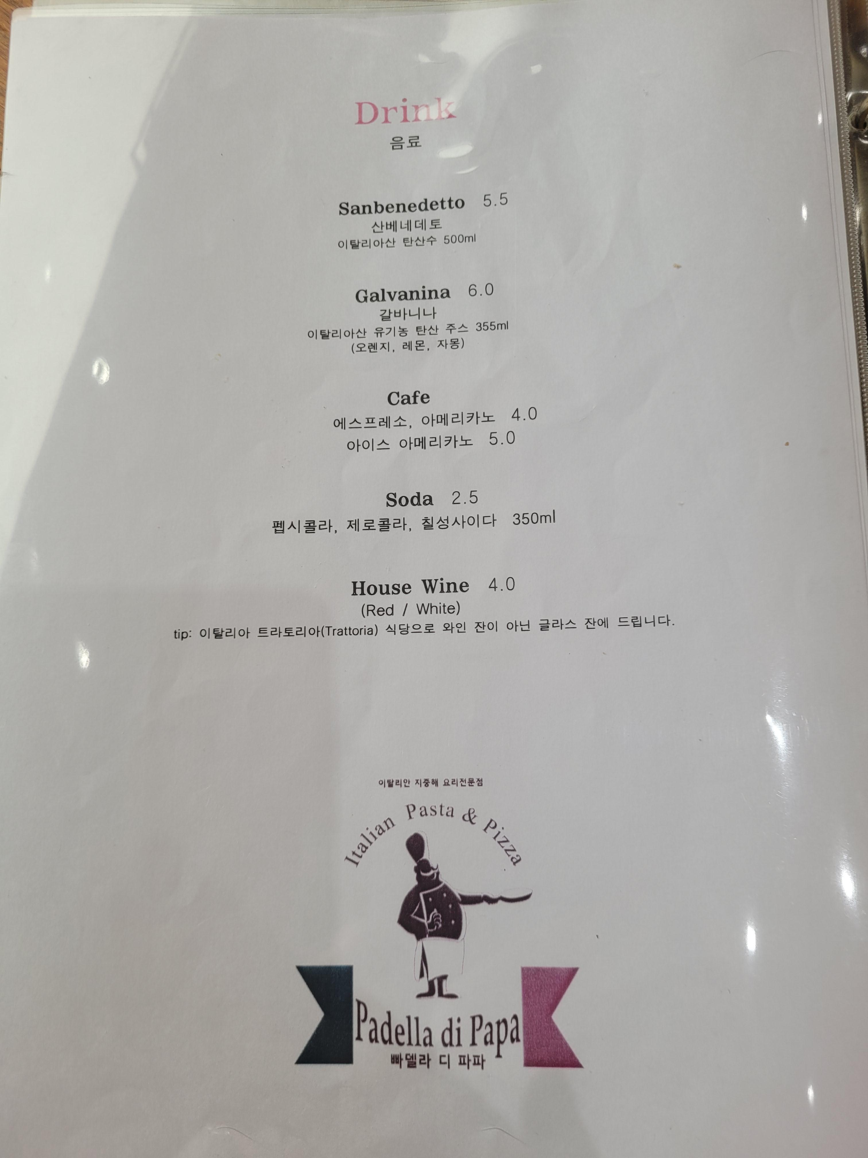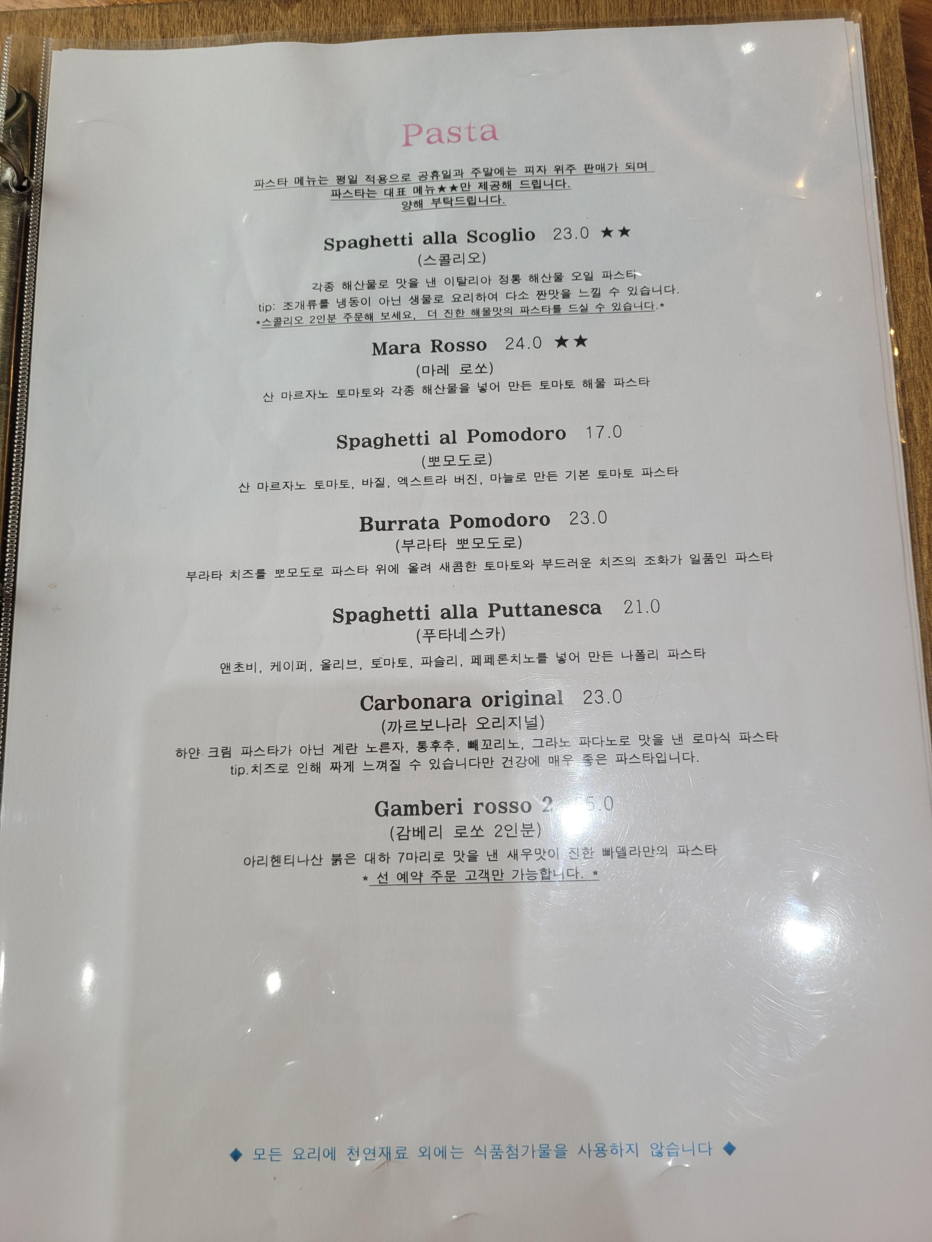 메뉴는 나폴리 피자와 파스타로 구성되어 있어요. 빠델라디파파는 이탈리와 동일한 방식으로 이탈리아 식자재와 나폴리 화덕을 사용해서 현지와 같은 피자맛을 느낄 수 있다고 하네요. 저희는 디아볼라리코타 피자와 까르보나라 파스타를 주문했어요. 사실 크림이 듬뿍 담긴 크림파스타를 먹고 싶어서 까르보나라를 선택했는데, 이곳의 까르보나라는 크림이 아닌 계란 노른자로 만든 오리지널 까르보나라라고 설명해 주셨어요. 오리지널 맛이 궁금해서 메뉴를 바꾸지 많았어요~