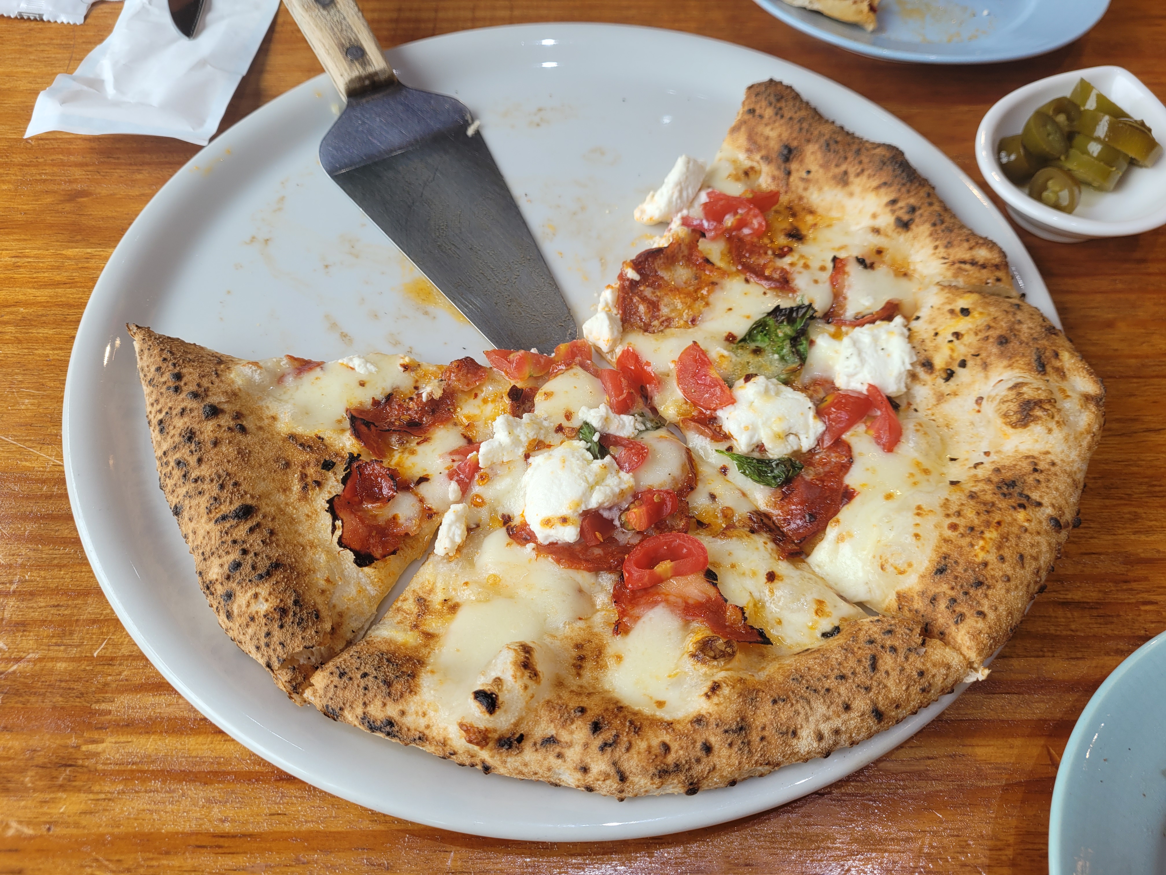 디아볼라리코타 피자입니다. 배가 고팠는지 사진 찍는 걸 잊고 한 조각씩 먹다가 찍었네요. 리코타 치즈와 매콤한 페퍼로치노가 조화로웠고, 무엇보다 화덕피자 도우가 단백하면서도 쫀득하고 정말 맛있었어요!!!