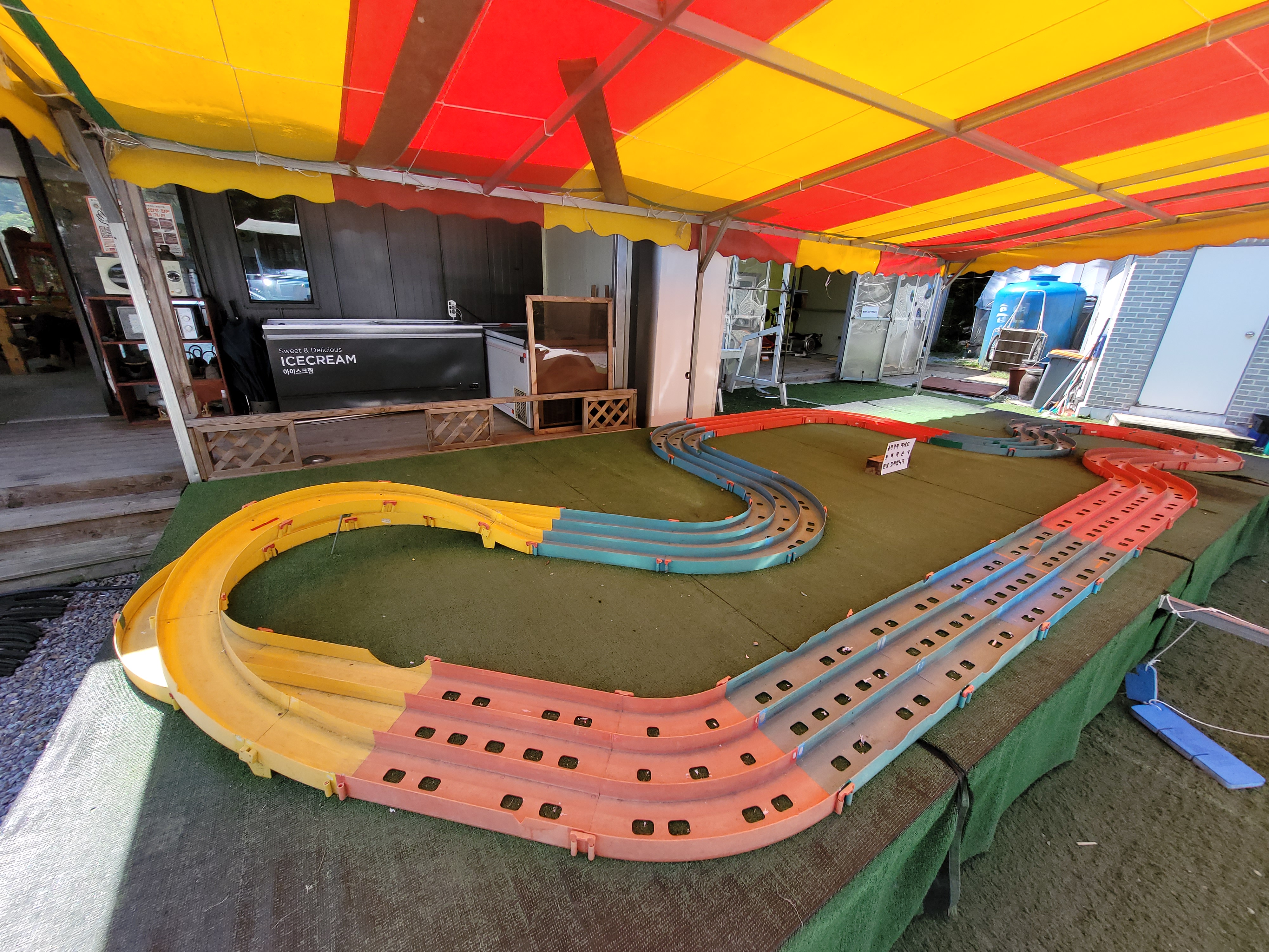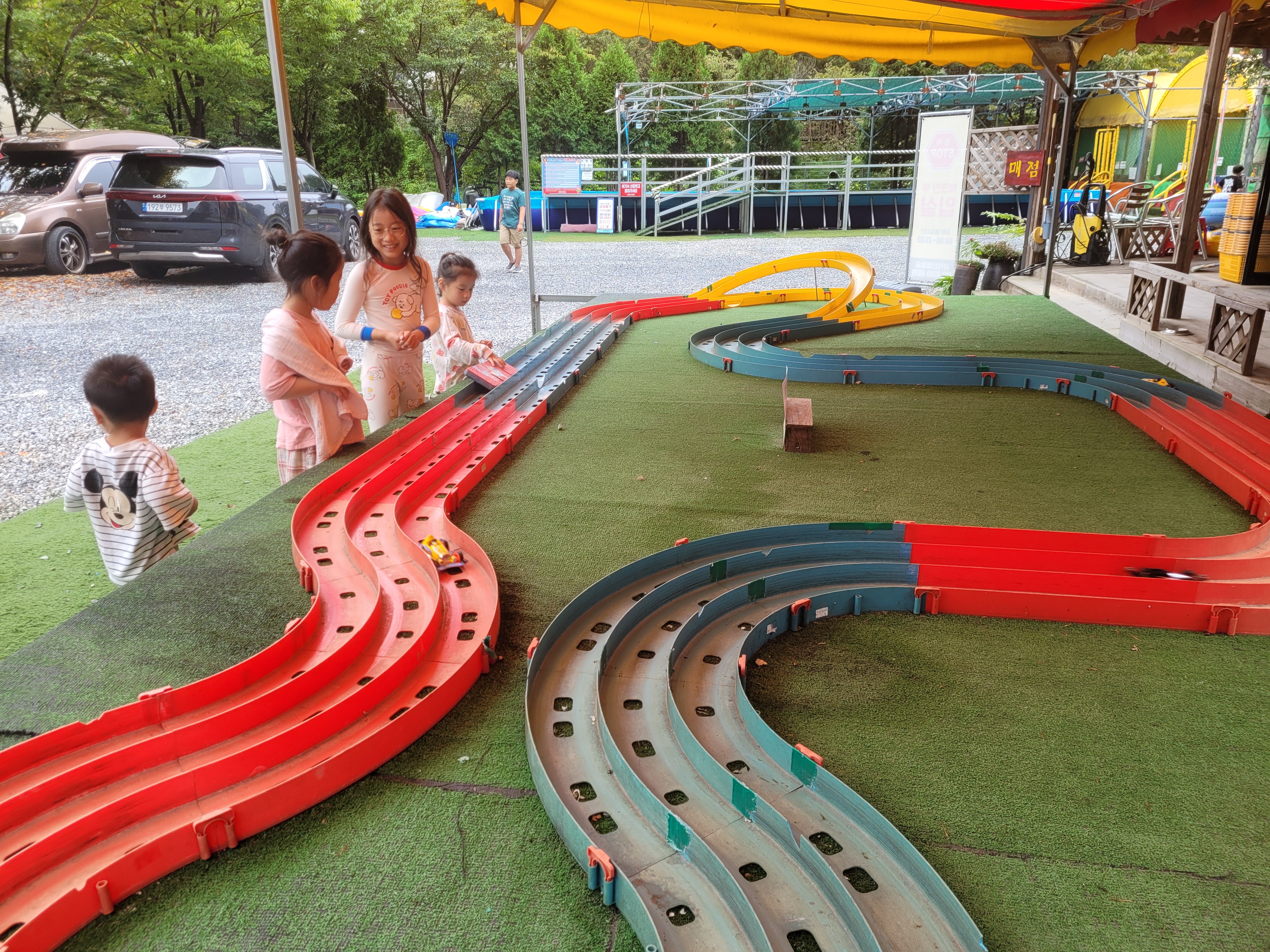 캠핑장의 미니카 트랙에 가서 레이싱을 해보았어요. 처음에는 엄청 빨라서 다른 미니카를 밀고 다니더라고요!!! 그러다가 배터리가 달수록 느려지는게 눈에 보여요. ㅎㅎㅎ 나중에는 엄청 느리게 가더라고요. 미니카 속도에는 베터리가 중요한 것 같아요~