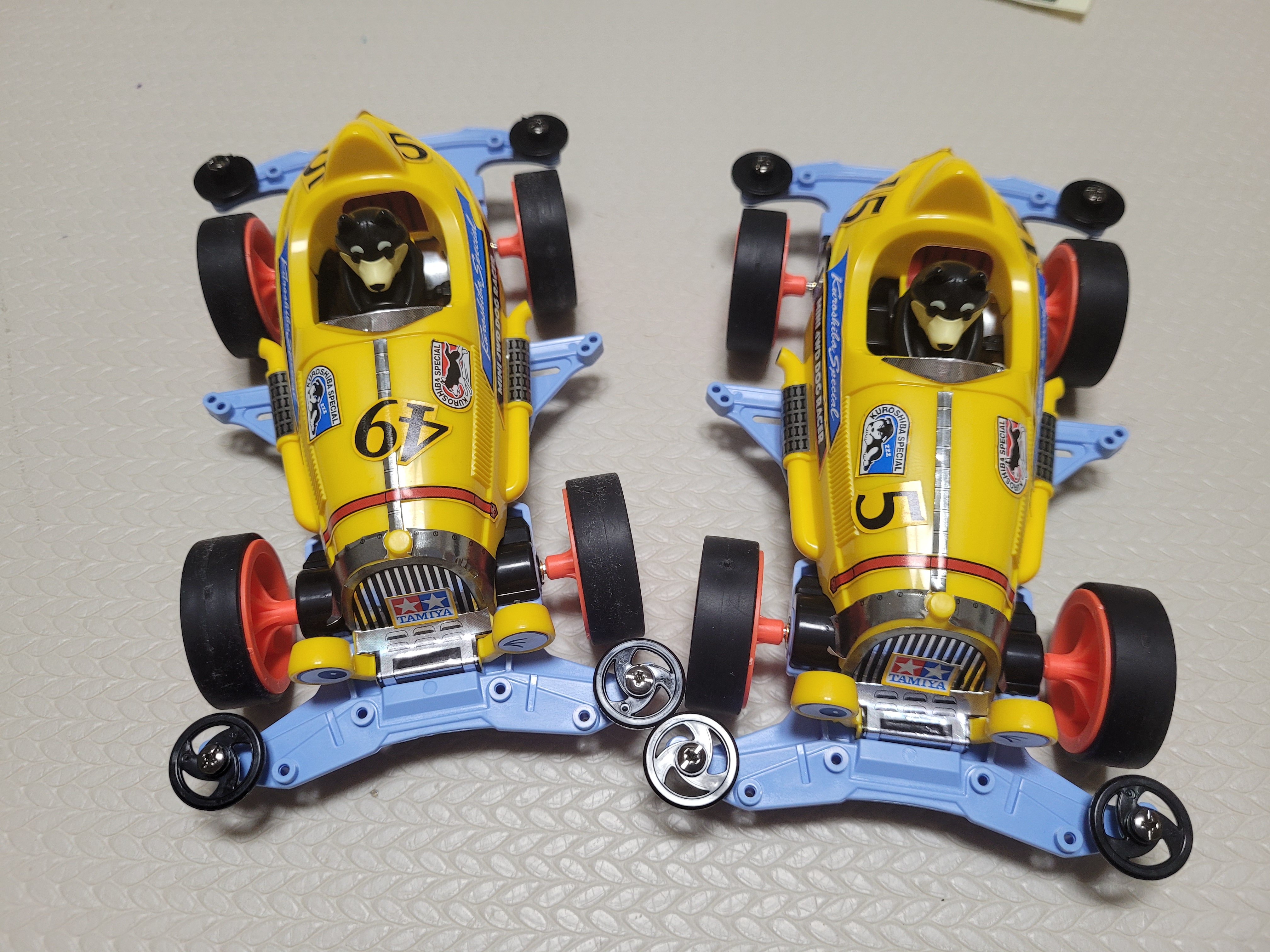 완성된 미니카입니다. 운전하는 강아지가 너무 귀여워요! 숫자를 다르게 붙여서 첫쨰와 둘째 미니카 차이를 줬어요.