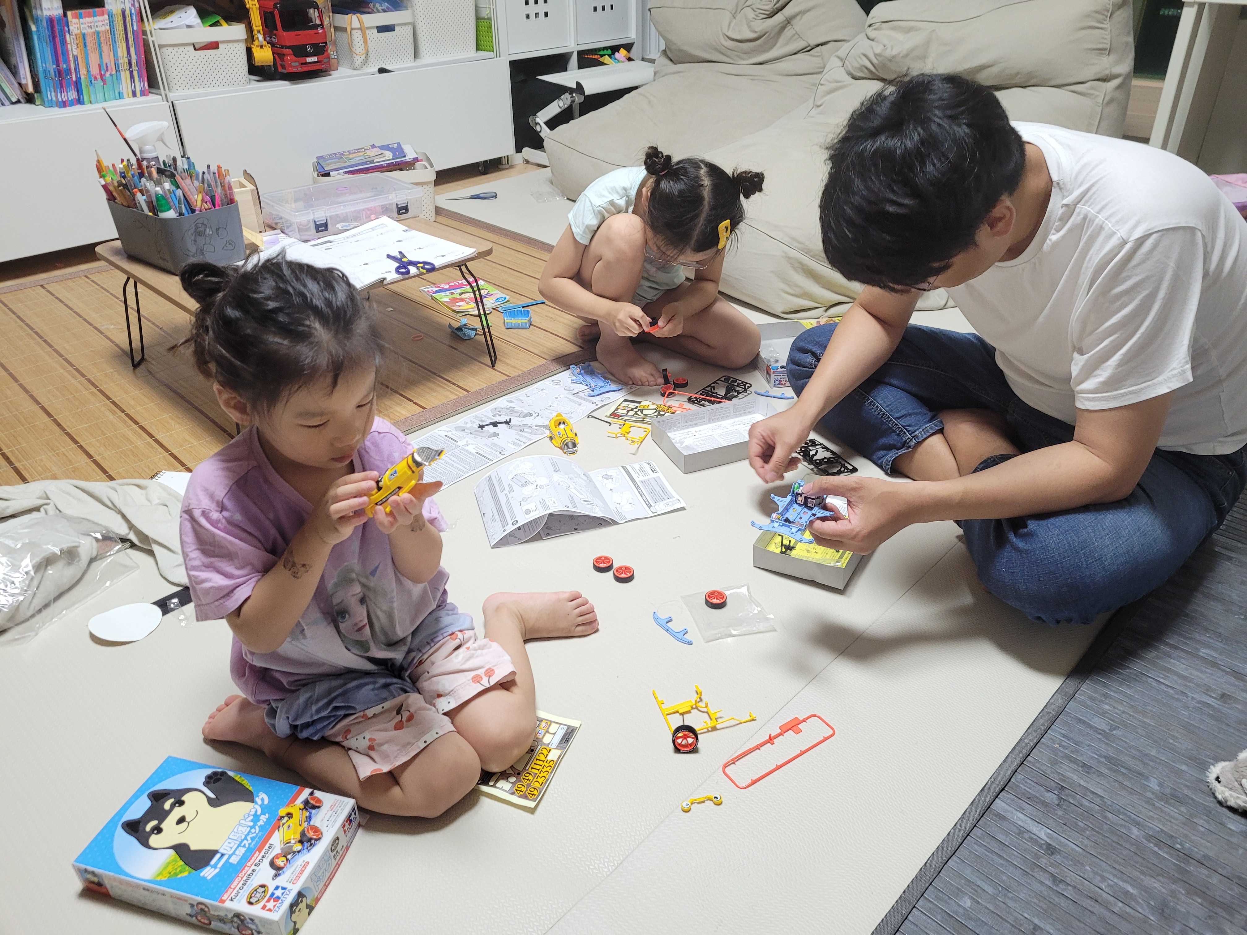 열심히 만드는 아이들과 아빠예요~ 9살인 첫째는 아빠가 조금 도와주면 스스로 만들 수 있어요. 둘째는 스티커를 열심히 붙였어요. 만들면서 가장 힘들었던 점은 5살 둘째 아이가 스티커를 삐뚤빼뚤 붙이는 걸 참는 것이었습니다. 똑바로 고쳐주고 싶은 거 참느라 힘들었어요!