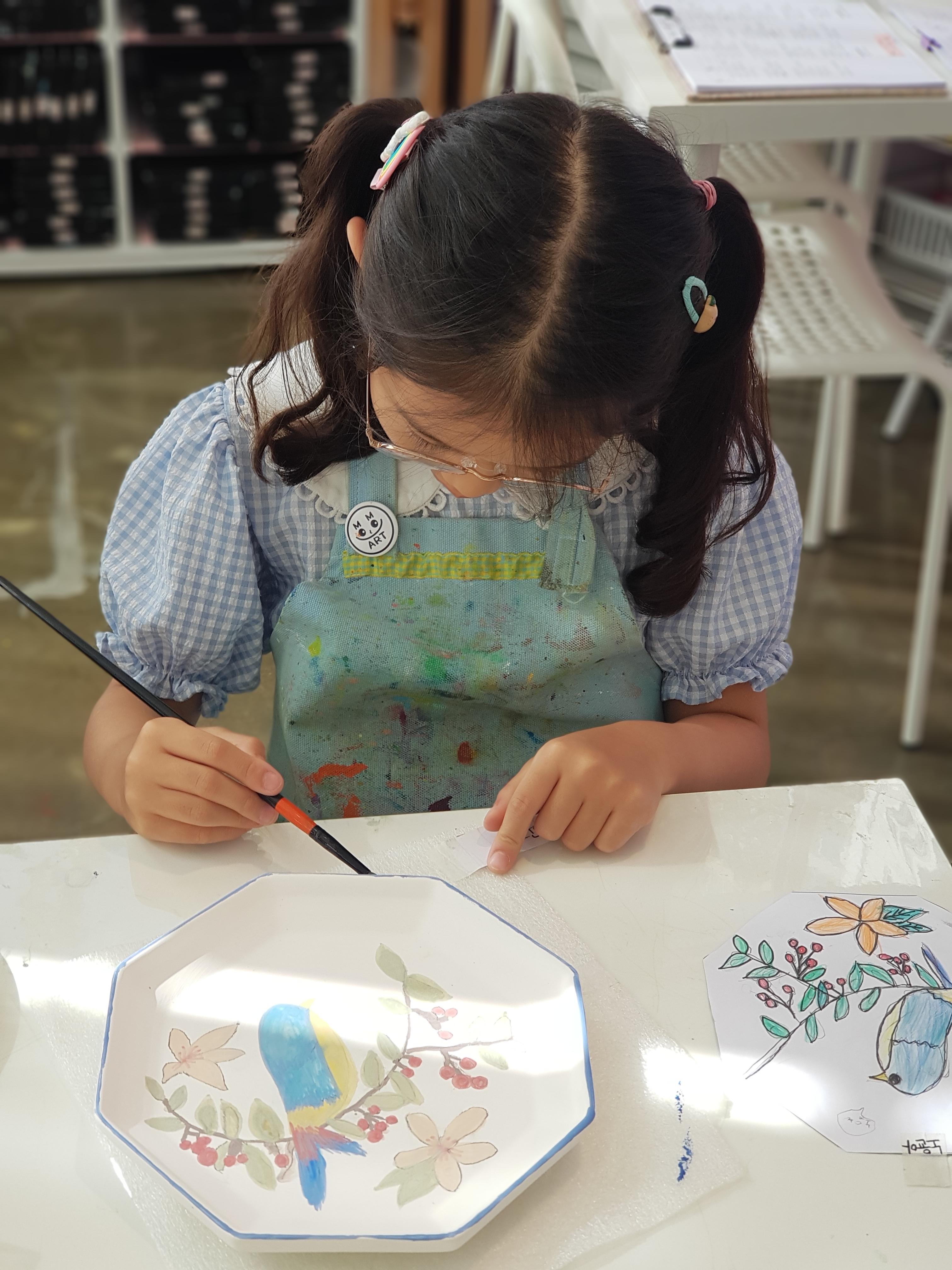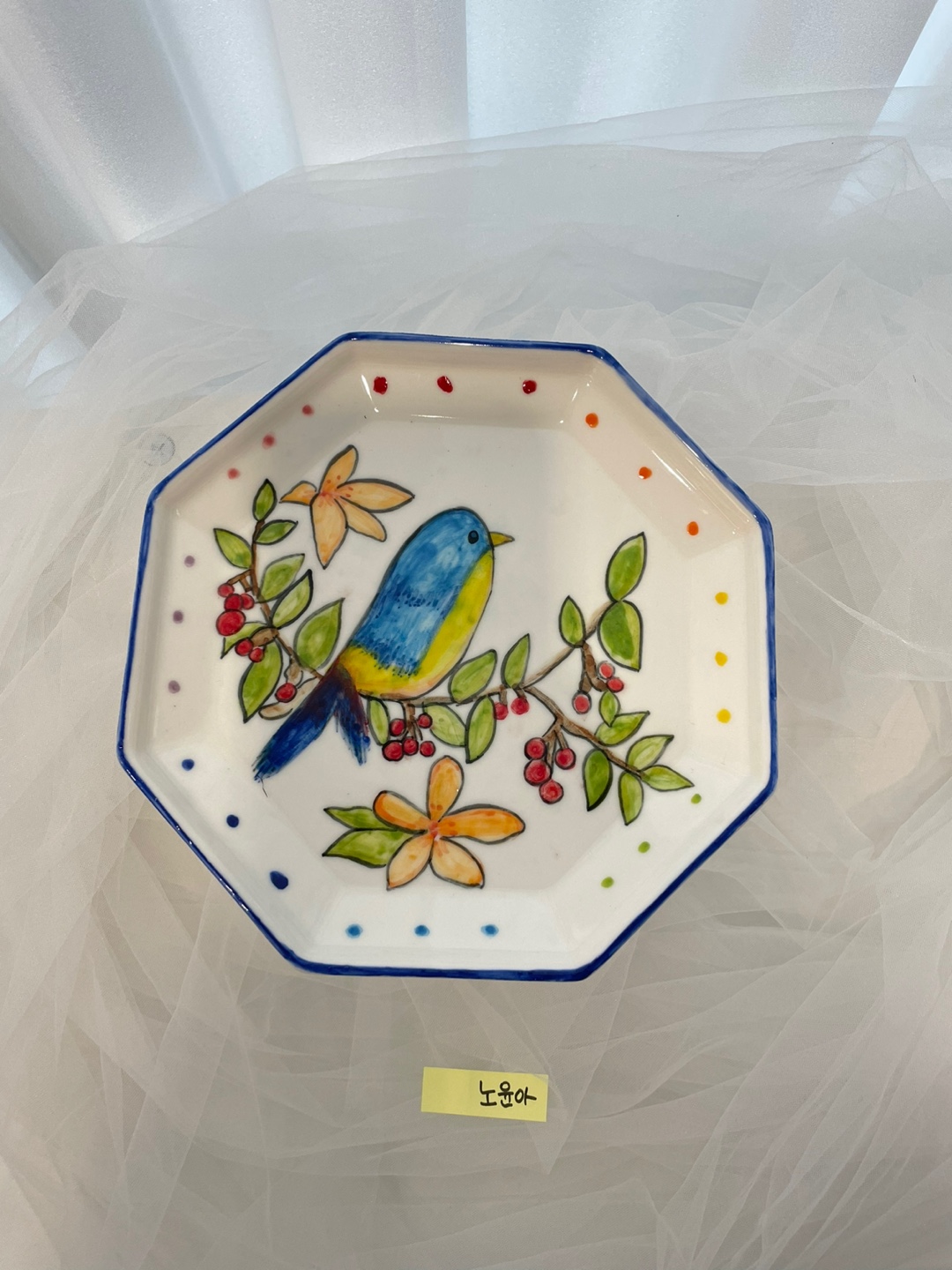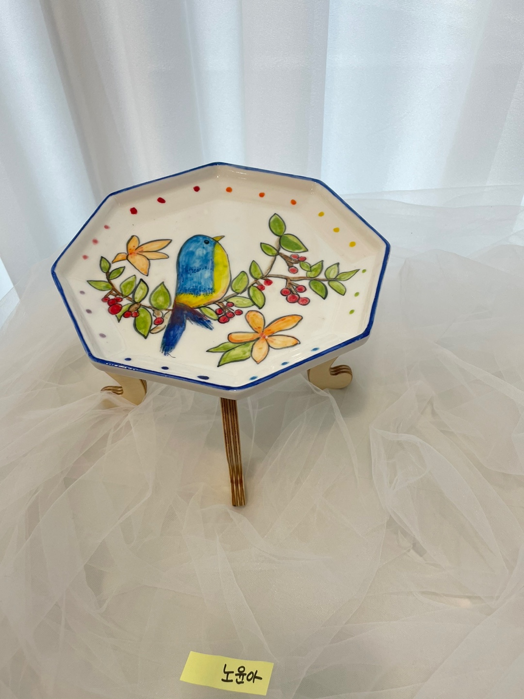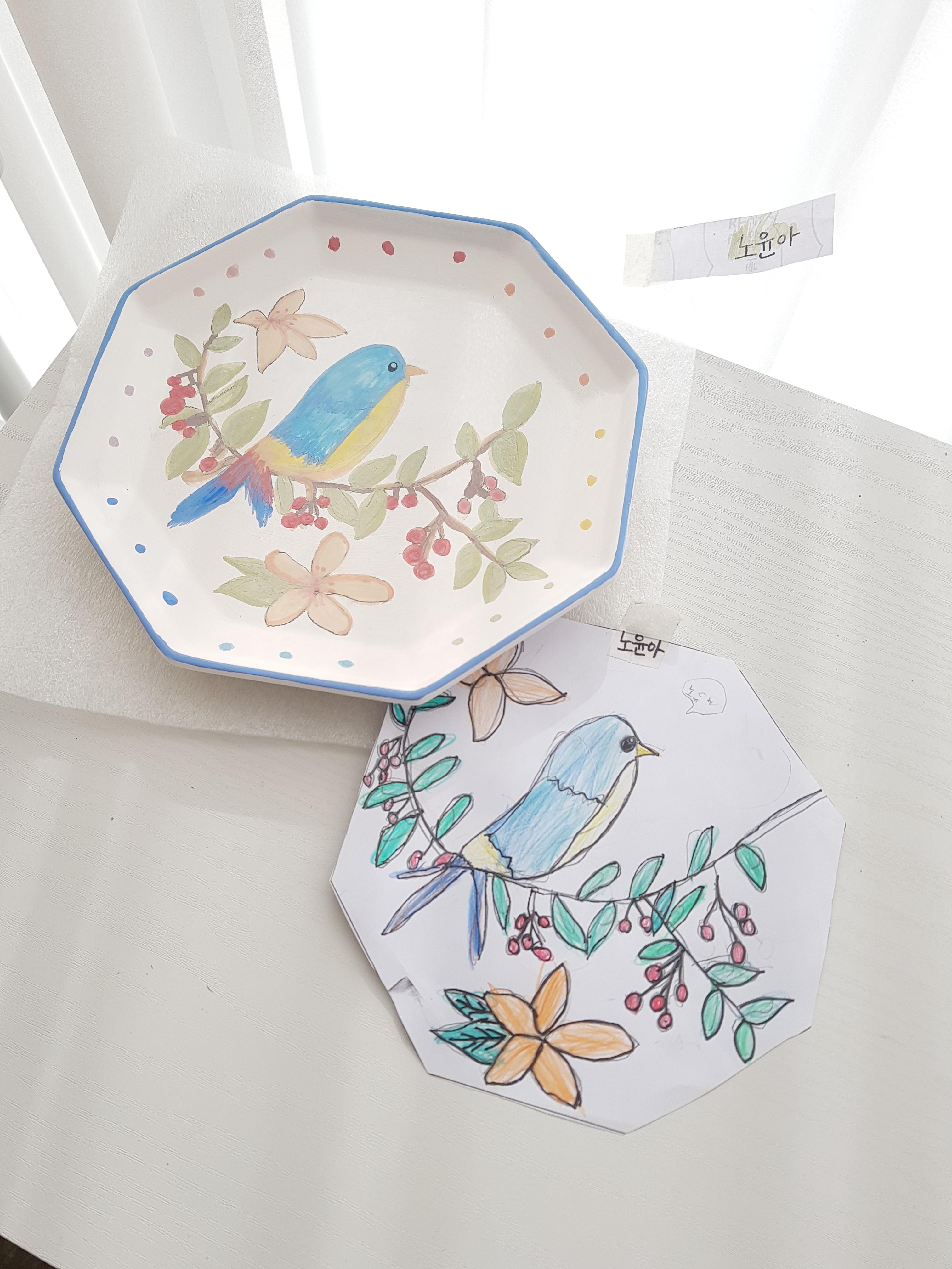 초벌한 도자기 접시 위에 아이가 원하는 디자인으로 스케치하고 도자 전용물감으로 채색했어요. 새와 꽃이 참 예쁘죠? 아이가 디자인한 접시를 1250도 가마에 굽고 자작나무 다리도 붙여주셨어요. 추석 때 송편 만들어서 올려놓고 먹기로 했답니다:)