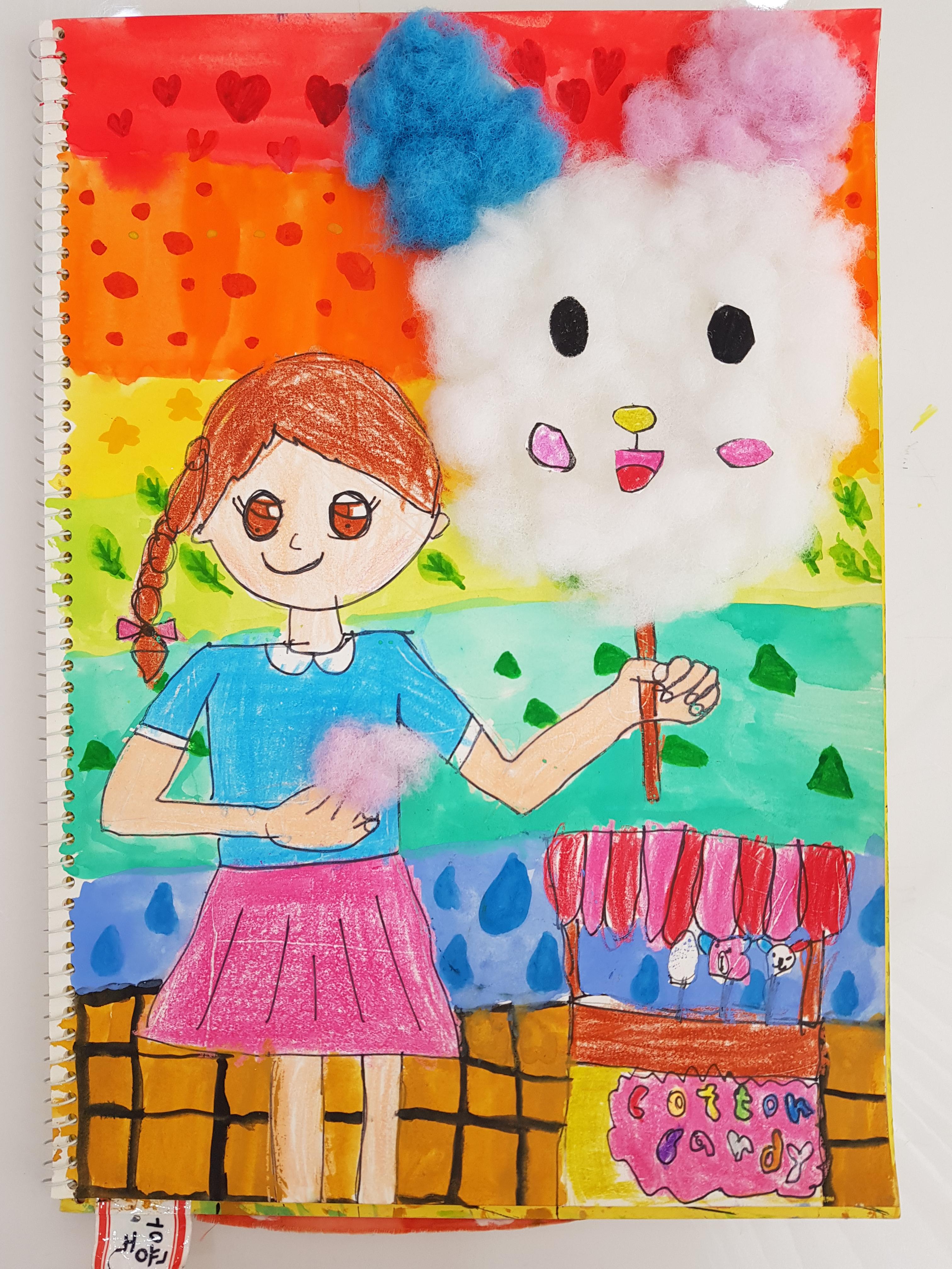 솜사탕을 들고 있는 아이를 그리고 솜사탕을 솜으로 붙여서 꾸몄어요. 보송보송한 솜사탕이 너무 귀여워요. 무지개빛 바탕색과 무늬도 마음에 들어요.