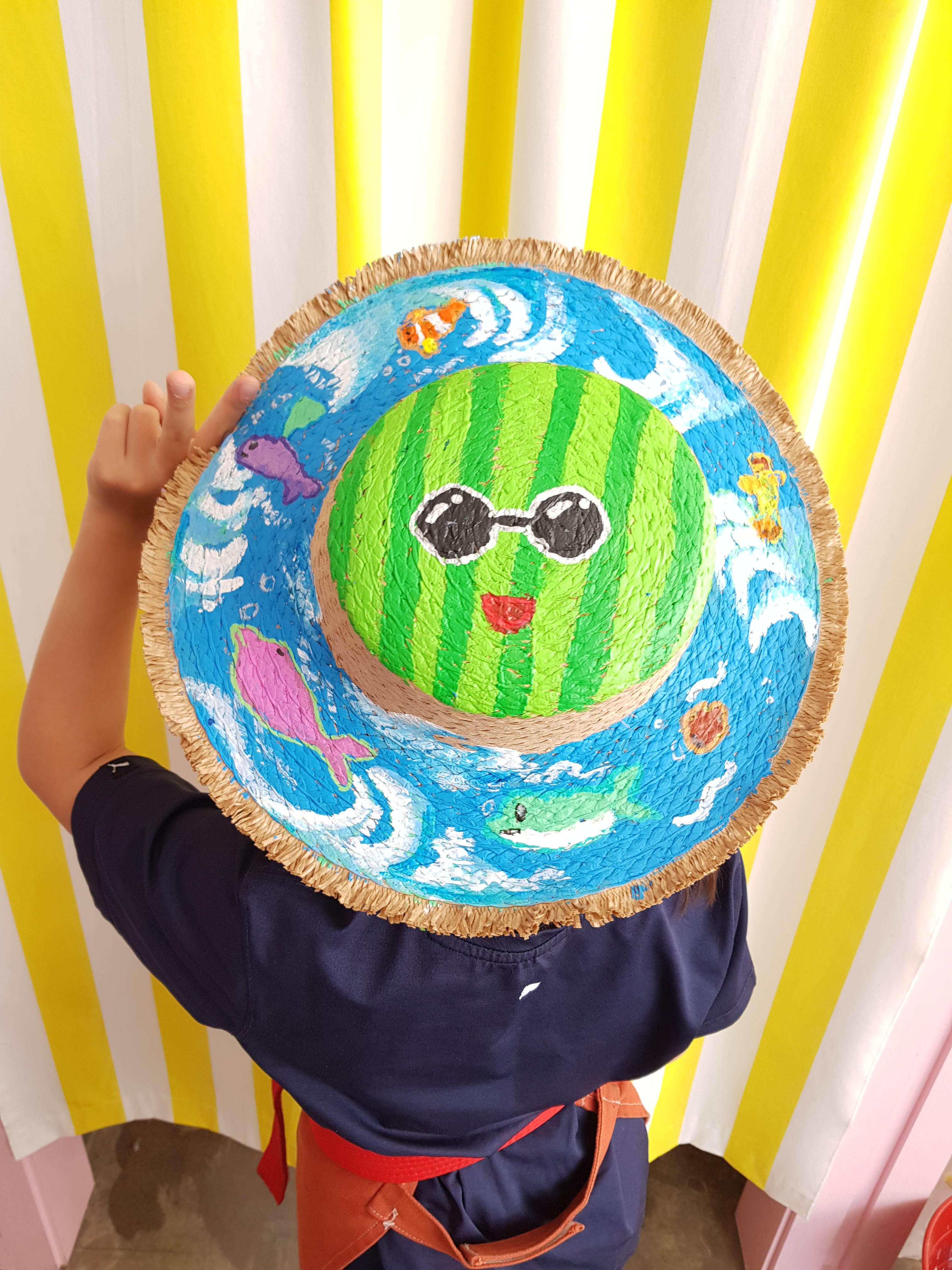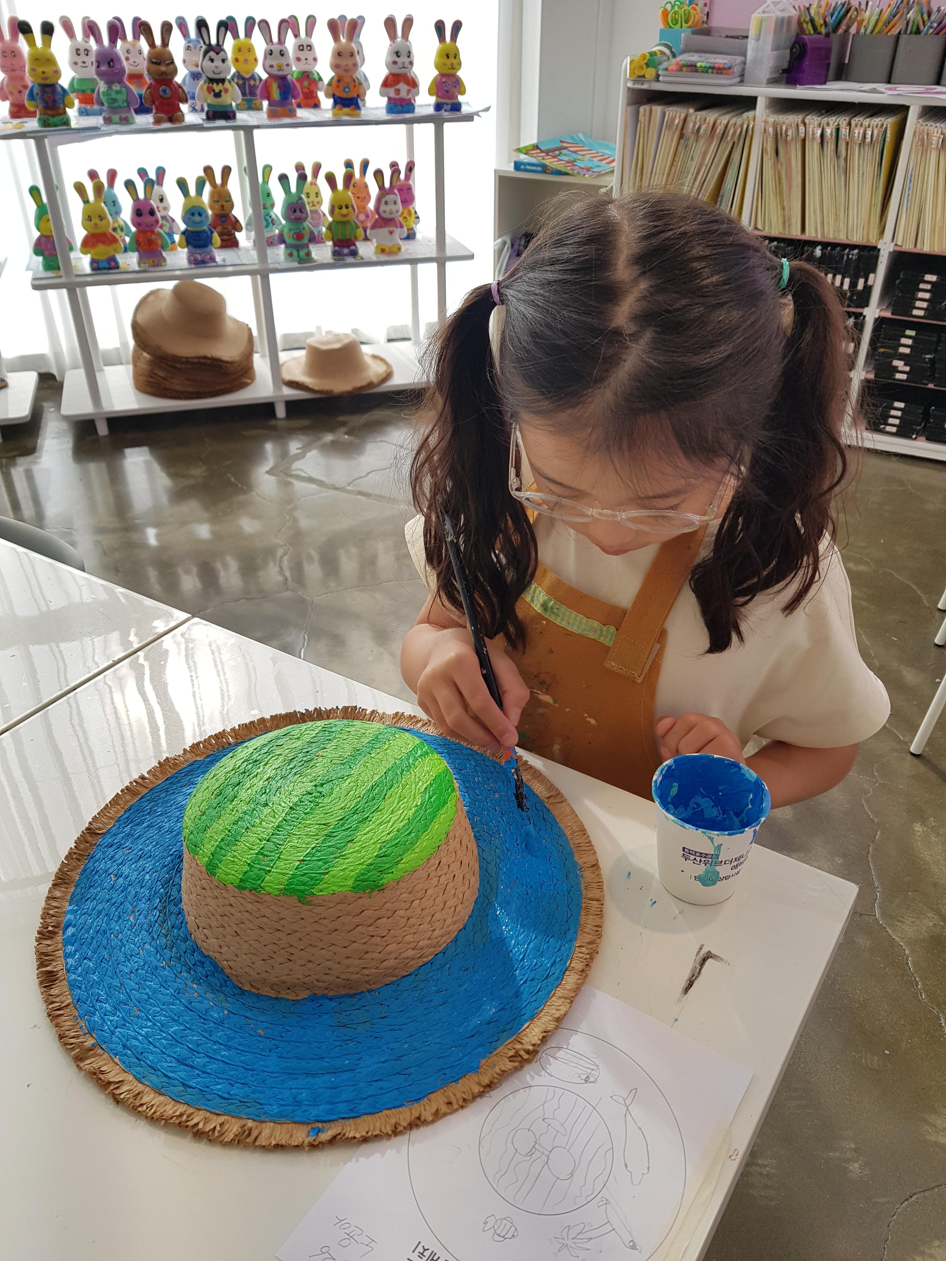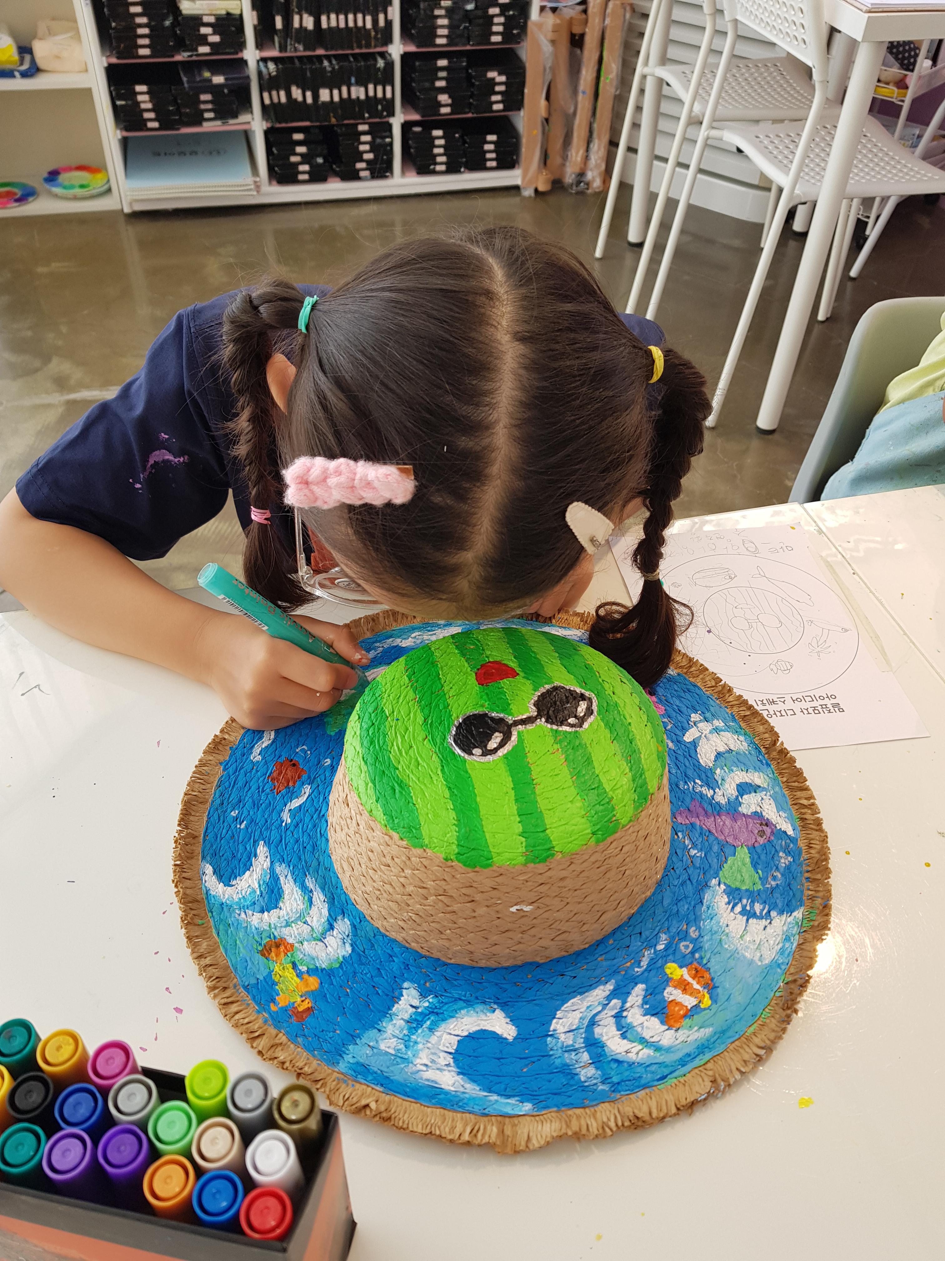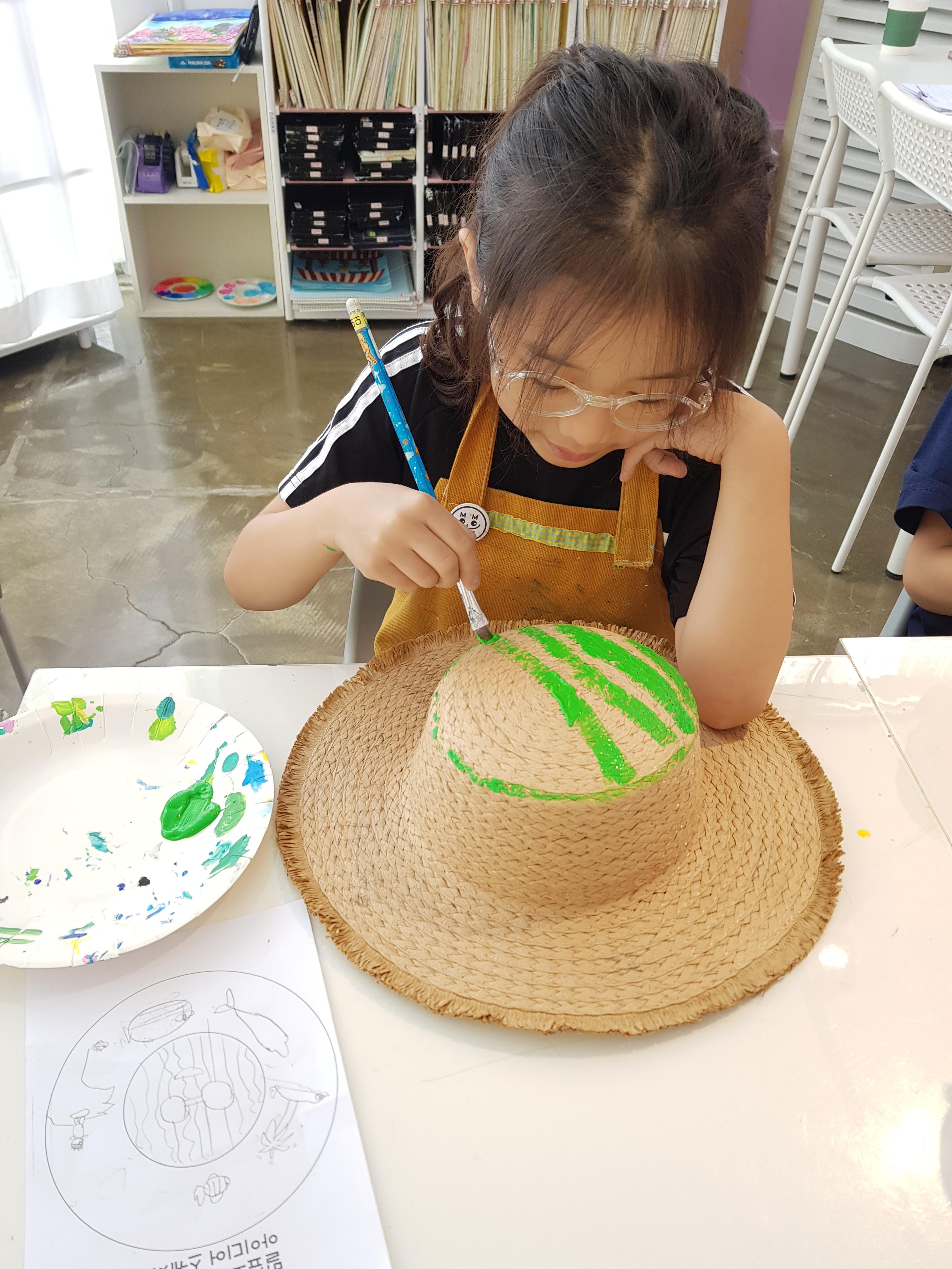 여름 조형 수업으로 나만의 밀짚모자를 만들었어요. 시원한 바다와 수박의 조합이 잘어울려요. 스스로 만든 모자라고 애정하며 외출할 때 몇 번 쓰고 나갔는데~ 시선 강탈입니다 ㅋㅋ