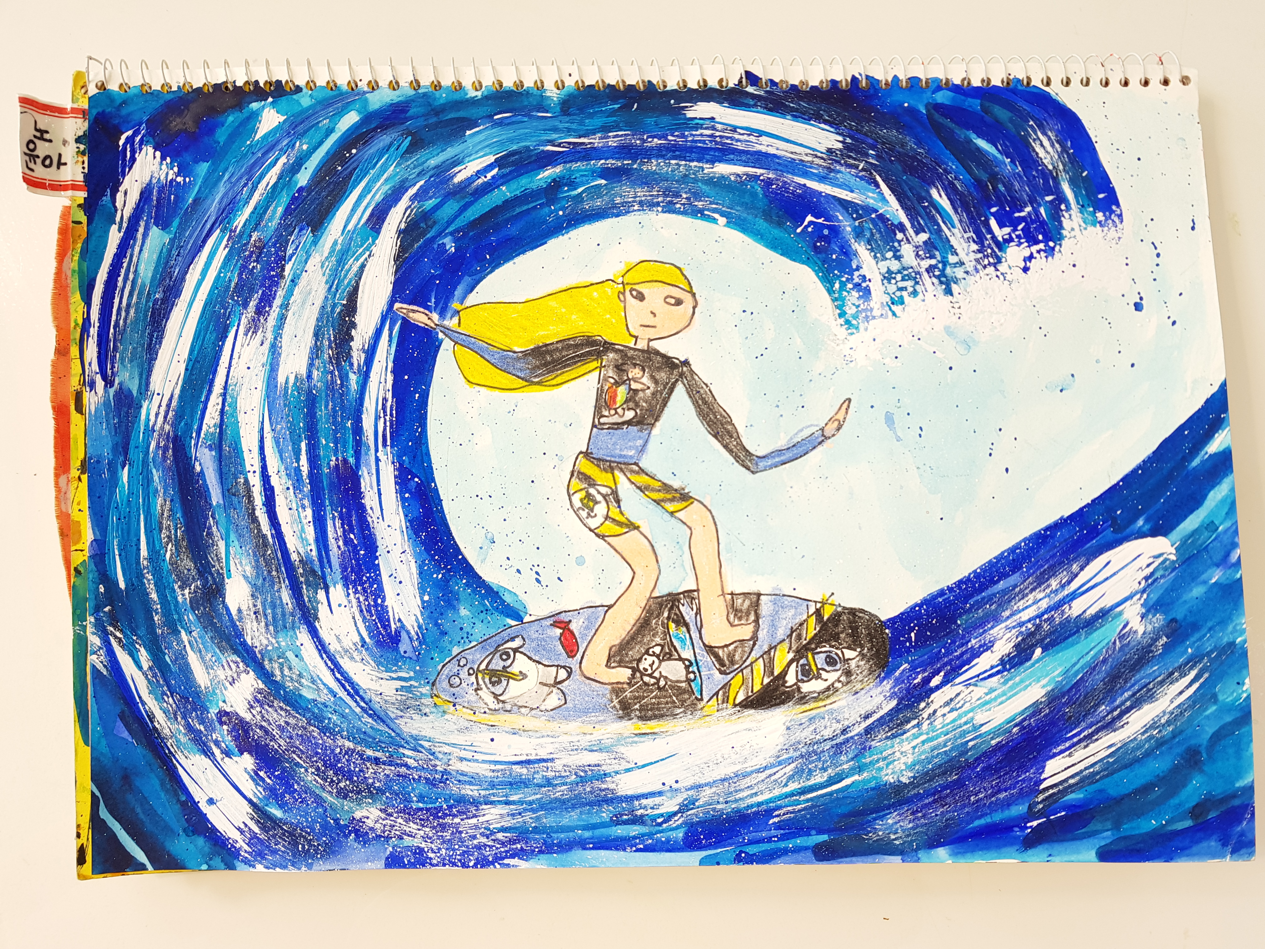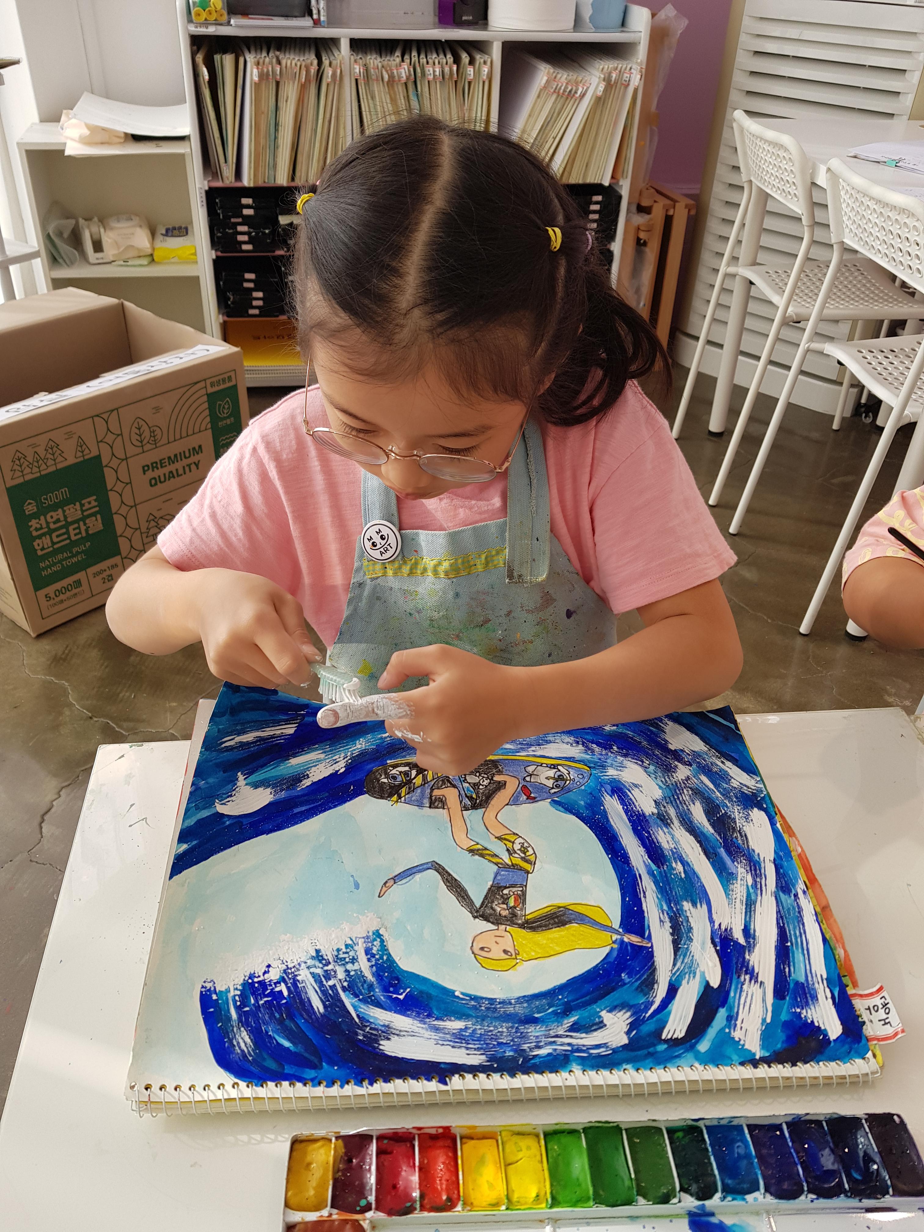 바다에서 서핑하는 역동적인 동세를 그려보고 배경의 파도는 칫솔을 사용하여 물결그리기, 물방울 튀기기로 생동감을 주었어요~ 시원시원하고 역동적인 느낌이에요.