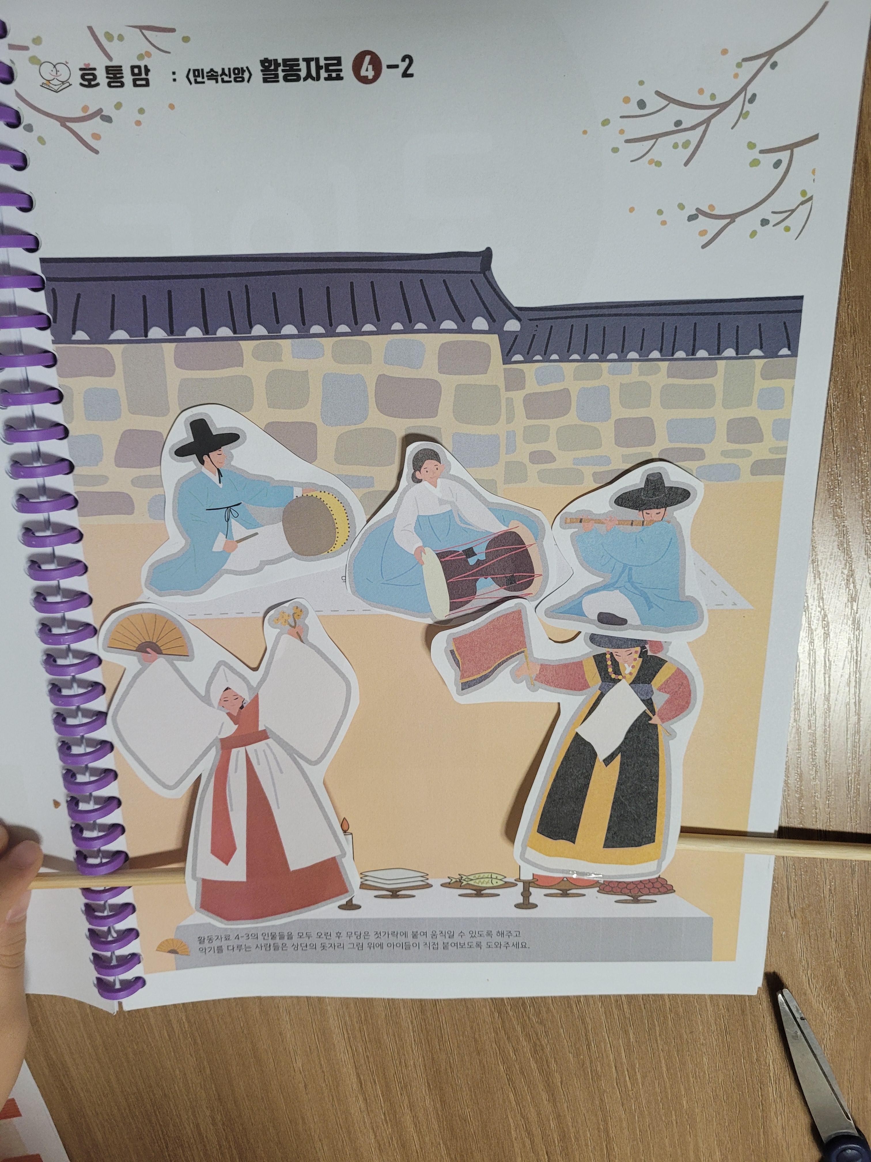 젓가락에 무녀들을 붙여서 그림위에서 직접 굿하고 춤추는 역할극을 해보았습니다.