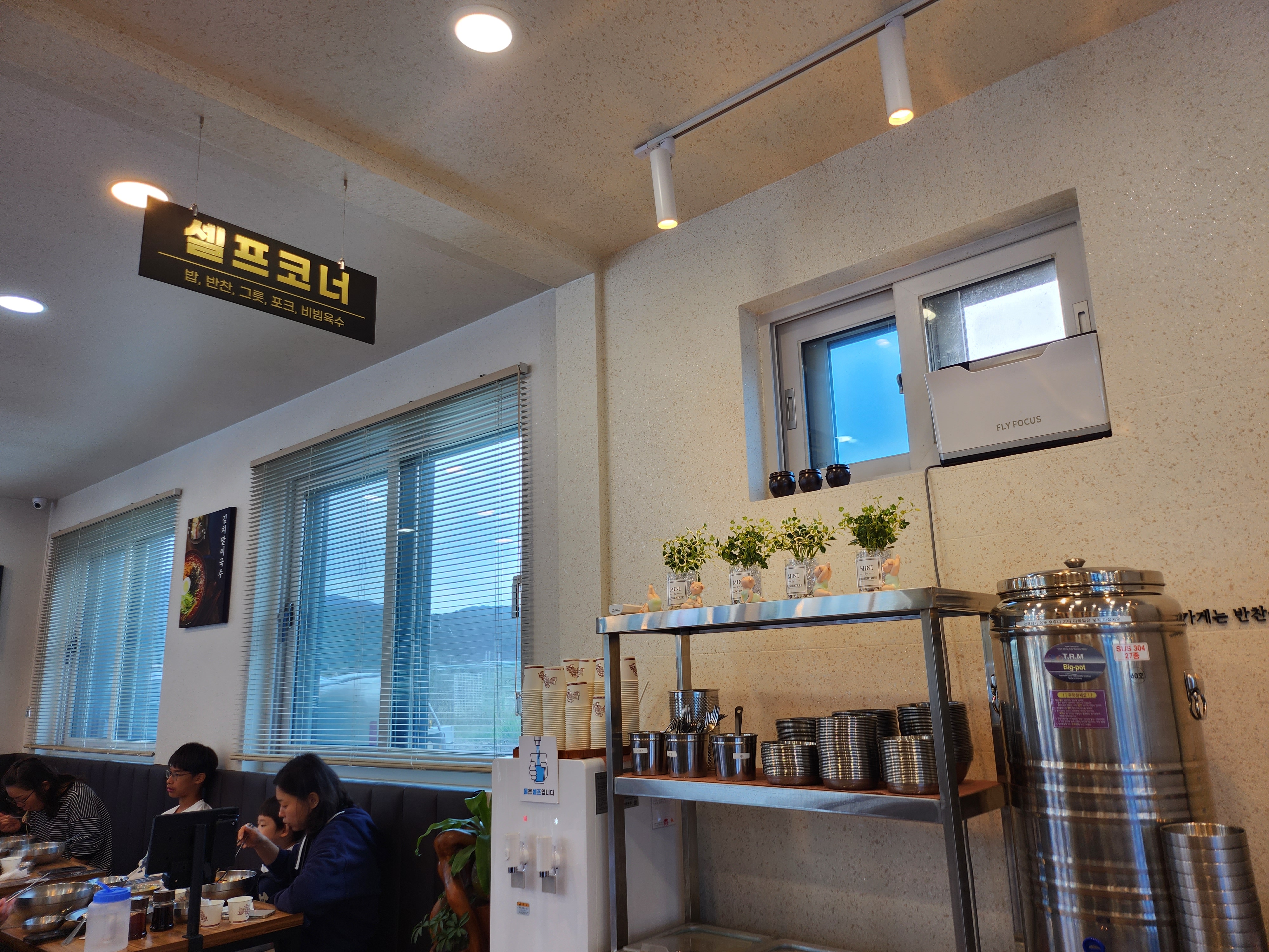시설이 새로 지은 건지 깔끔했어요. 대기가 평소에도 있는지 앉아서 기다릴 수 있는 자리도 있었습니다. 내부에는 육수 및 앞접시, 아이 포크, 김치 등을 가져올 수 있는 셀프 코너도 운영하고 있었어요.