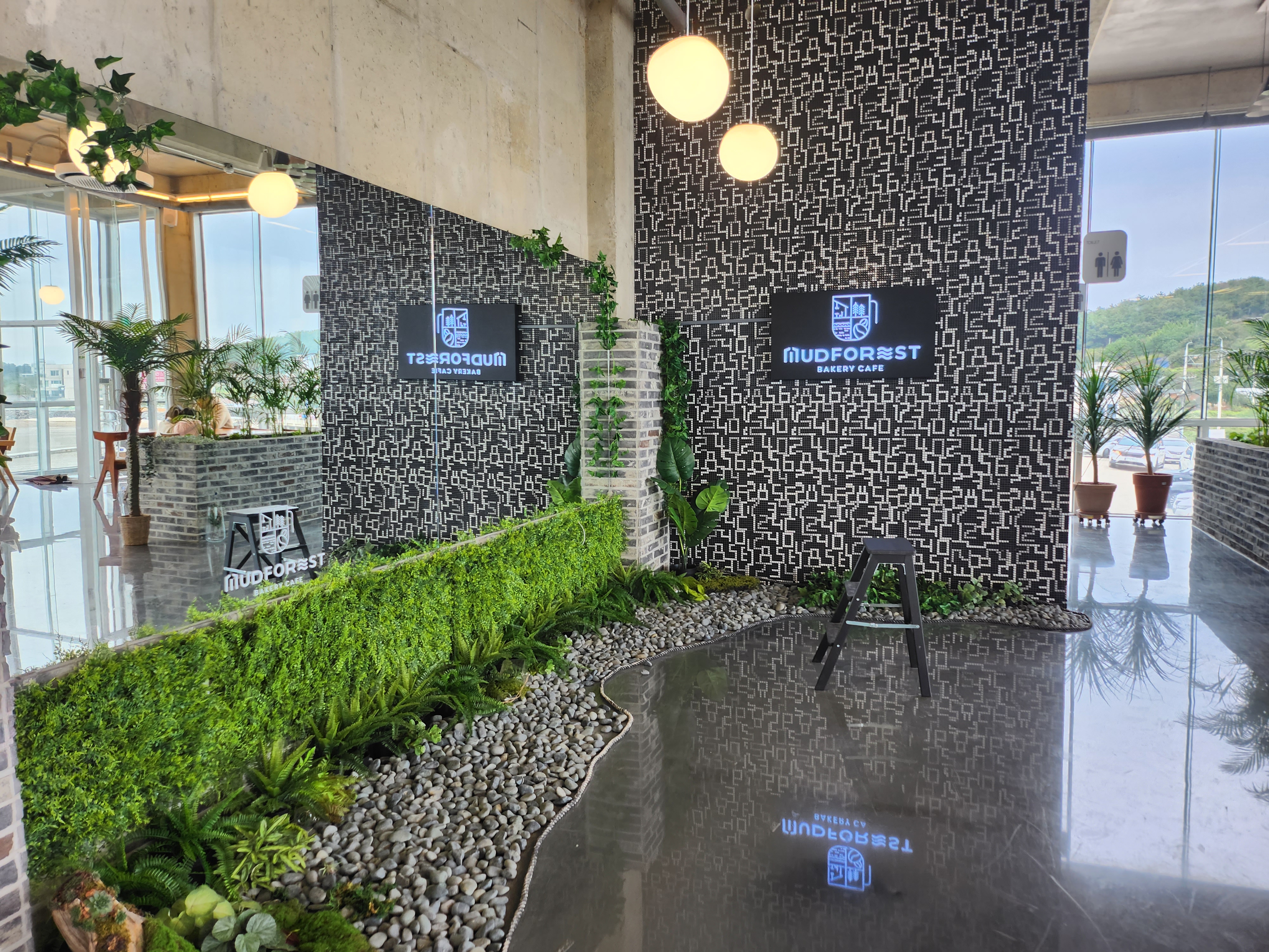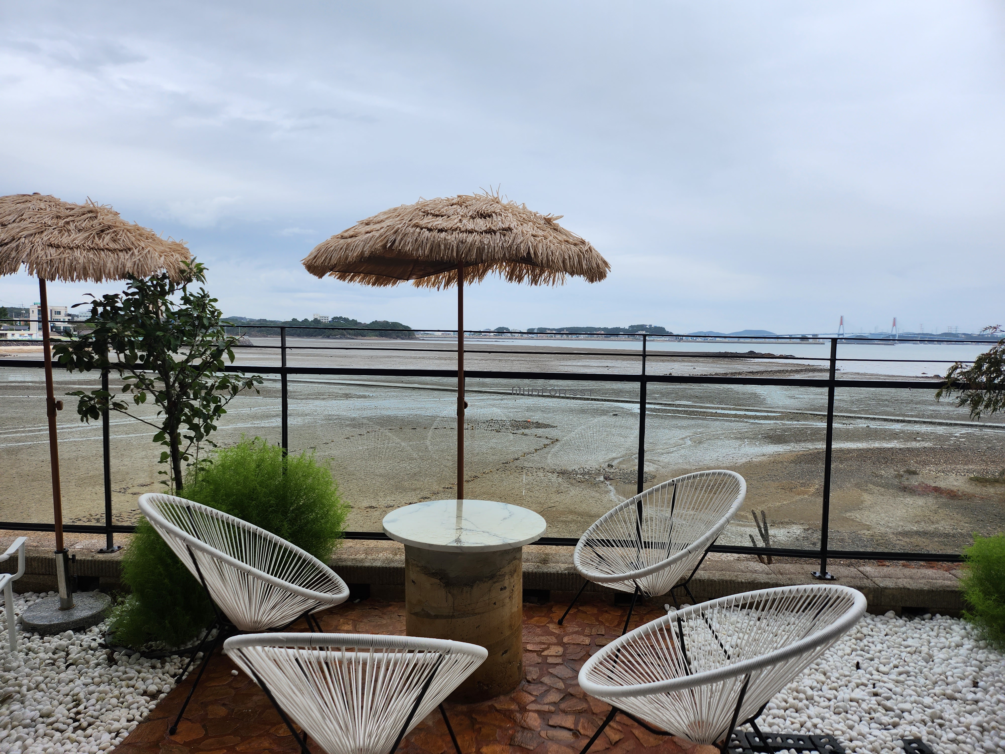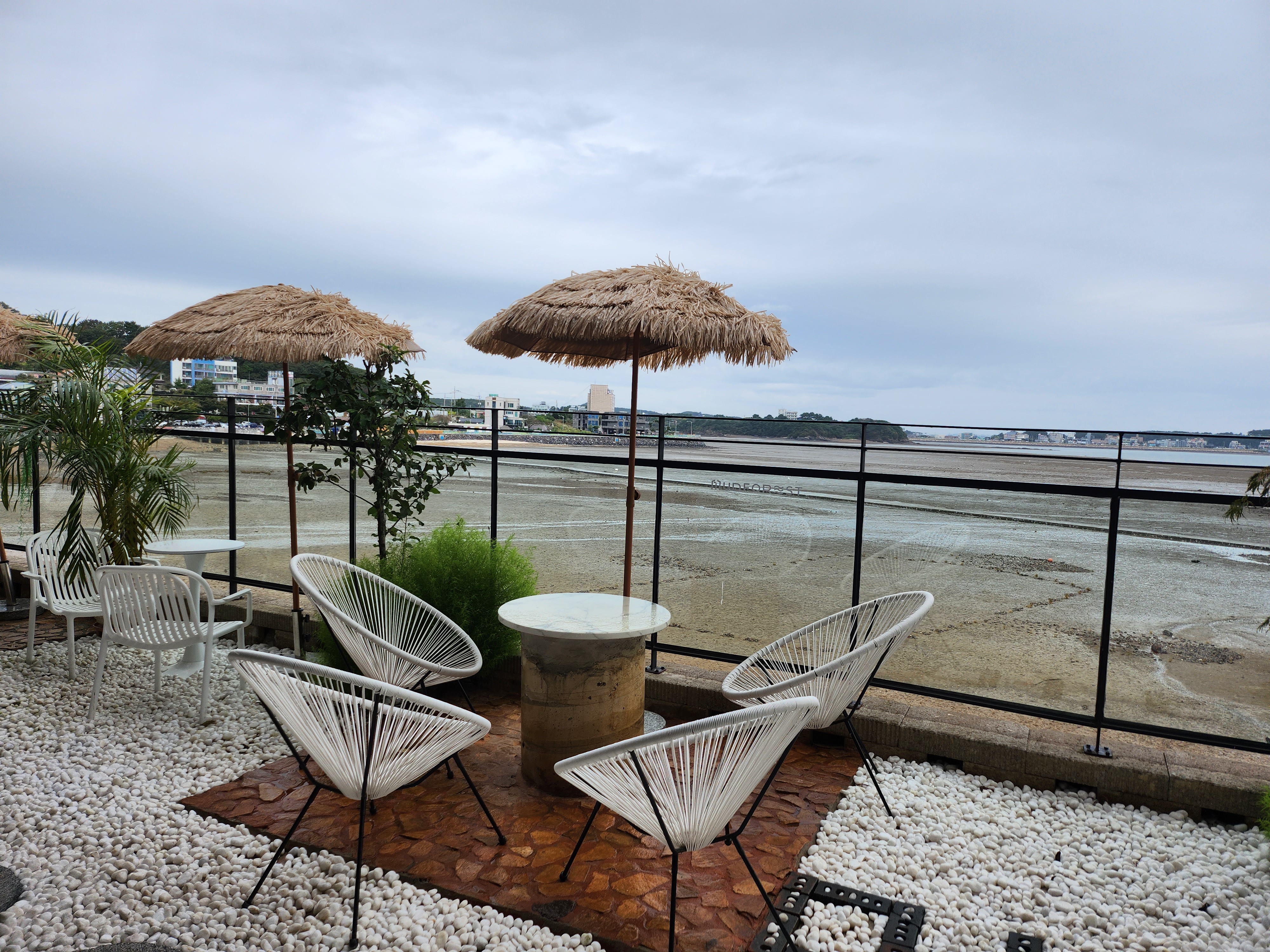 머드포레스트의 가장 큰 장점은 선재도 갯벌이 한눈에 보이는 가슴이 뻥 뚫리는 시원한 뷰인 것 같아요. 갯벌에 돌과 소라로 쓴 머드포레스트 글씨도 너무 멋지네요. 내부도 바다 콘셉트로 예쁘게 꾸며져 있어요. 자리도 널찍널찍해서 좋아요:)