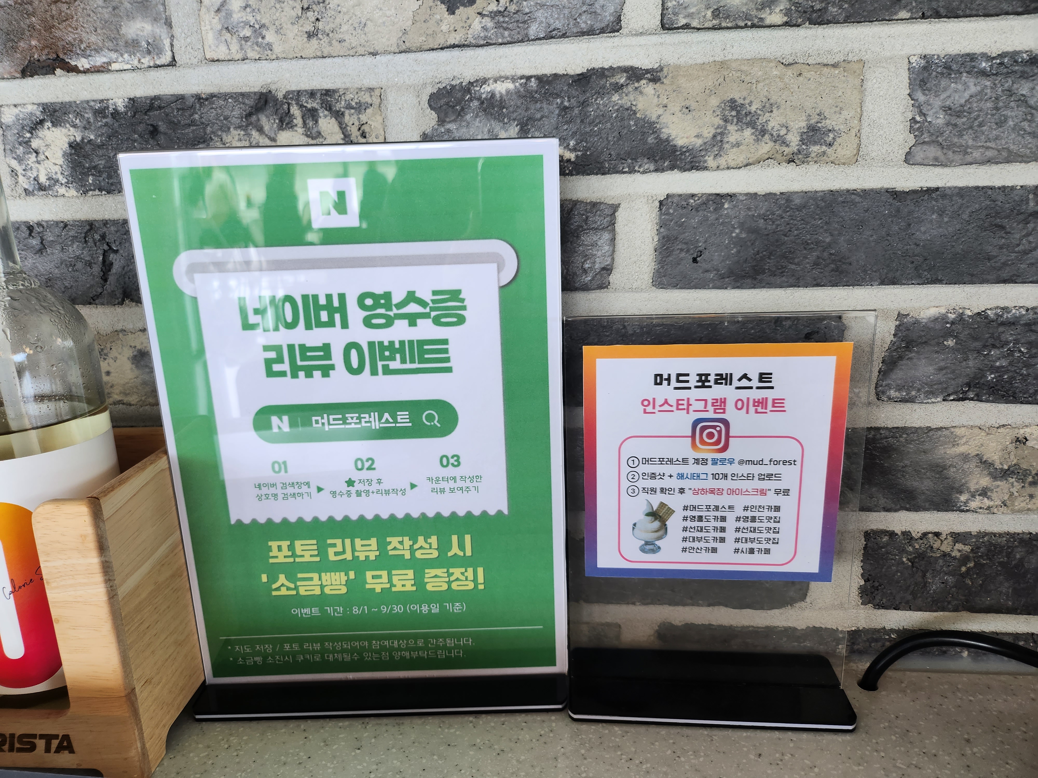 네이버 영수증 리뷰 및 인스타그램 업로드 시 각각 소금빵과 아이스크림 제공 이벤트도 진행하니 참고해 주세요:) 저는 둘 다 참여했는데 소금빵은 떨어져서 단팥빵과 아이스크림 받았습니다. 아이스크림은 진한 우유맛이고, 단팥빵도 너무 달지 않아 먹기 좋았어요. 음료는 포레스트라테와 아이스아메리카노를 먹었어요.