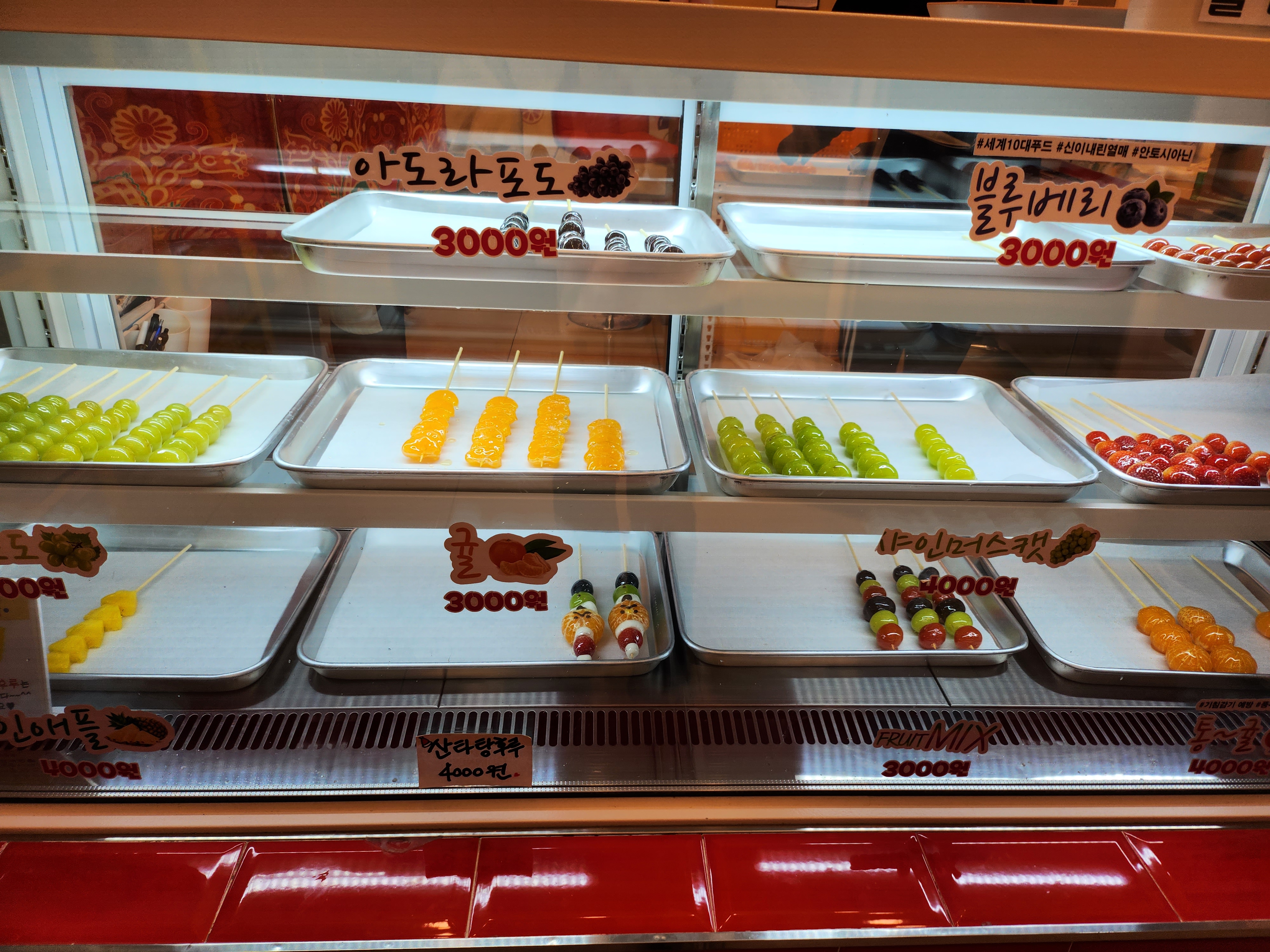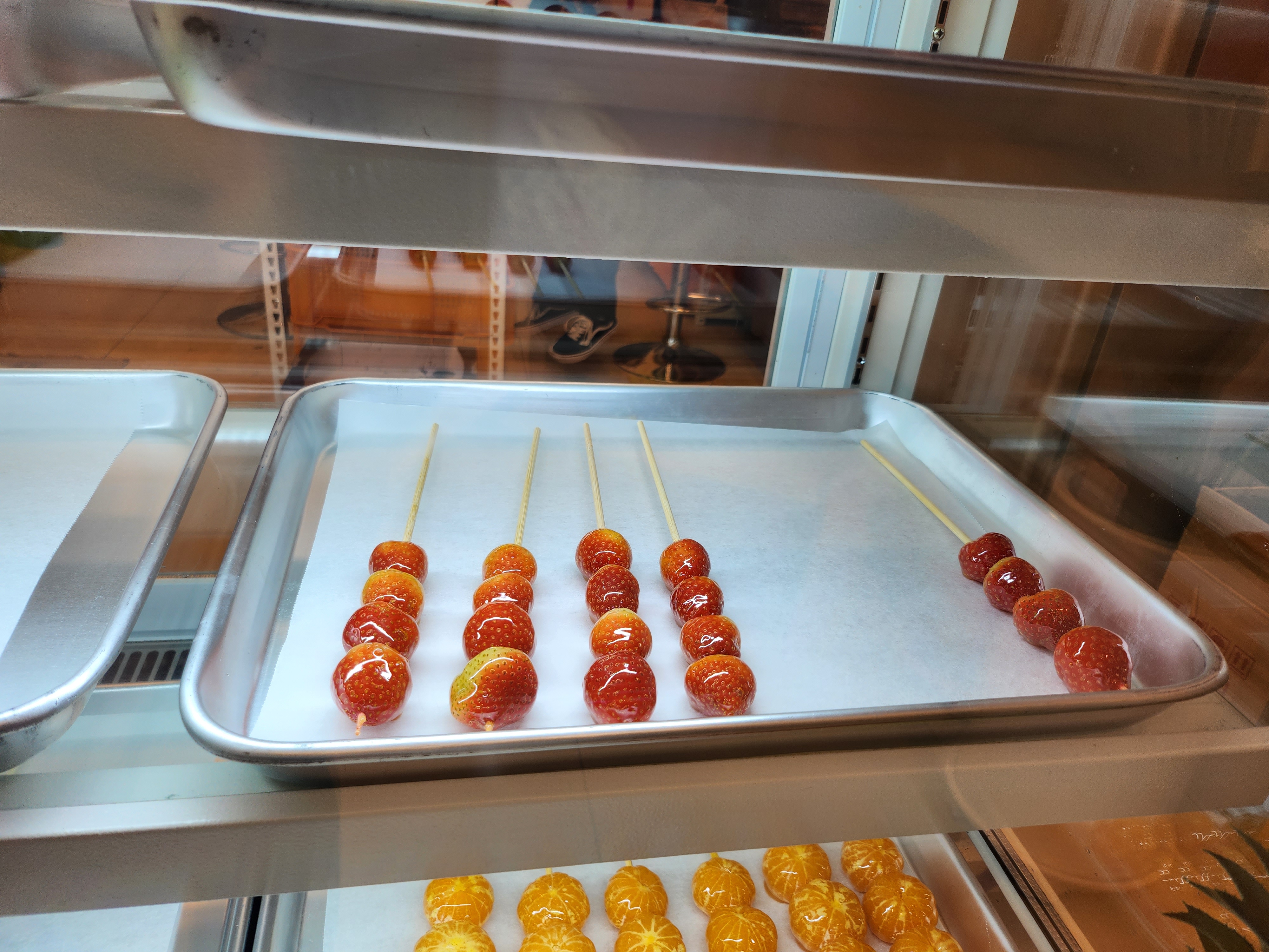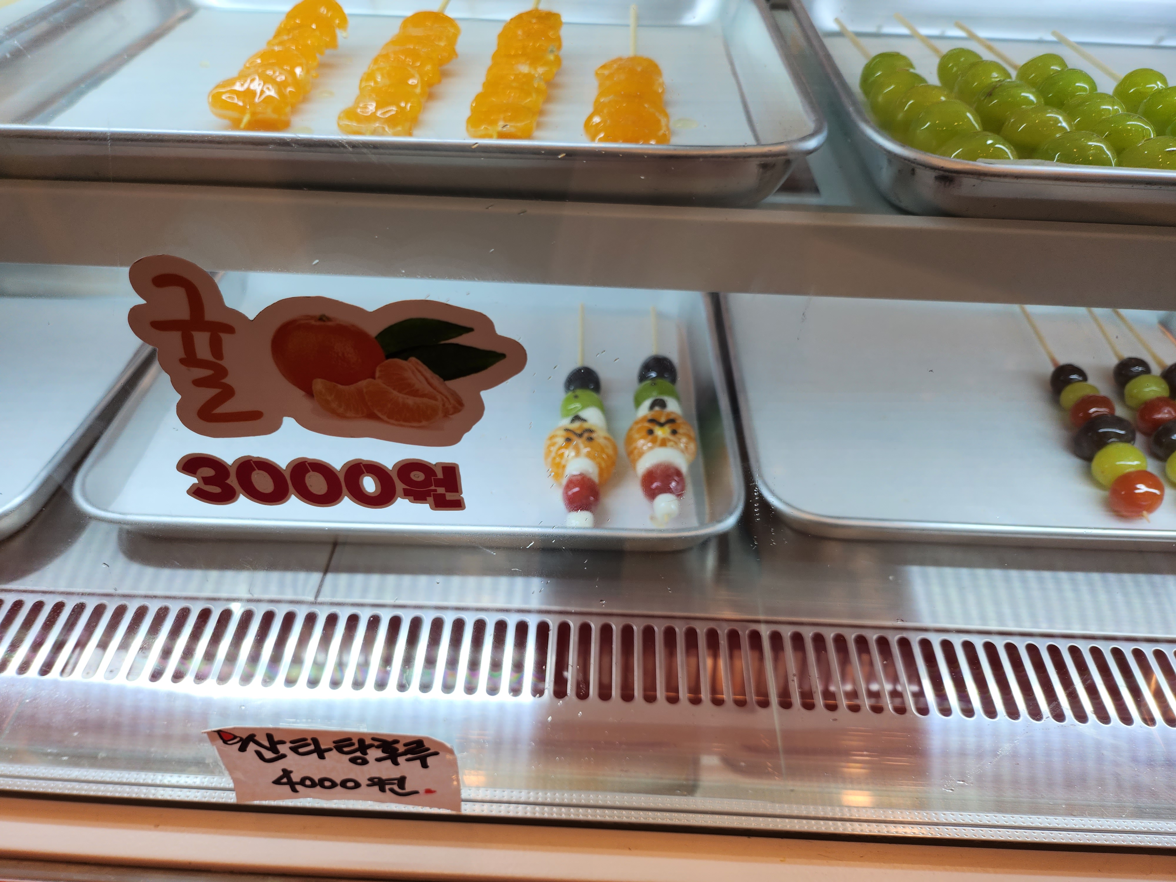 딸기, 샤인머스켓, 귤, 포도 등 다양한 과일의 탕후루가 있는데요. 개인적으로는 귤이 의외로 젤 맛있었어요! 이미 너무 달콤한 포도나 샤인머스켓은 너무 달게 느껴져서 부담스러웠고 상큼한 맛이 강한 귤이 탕후루에 잘 어울리는 것 같습니다.