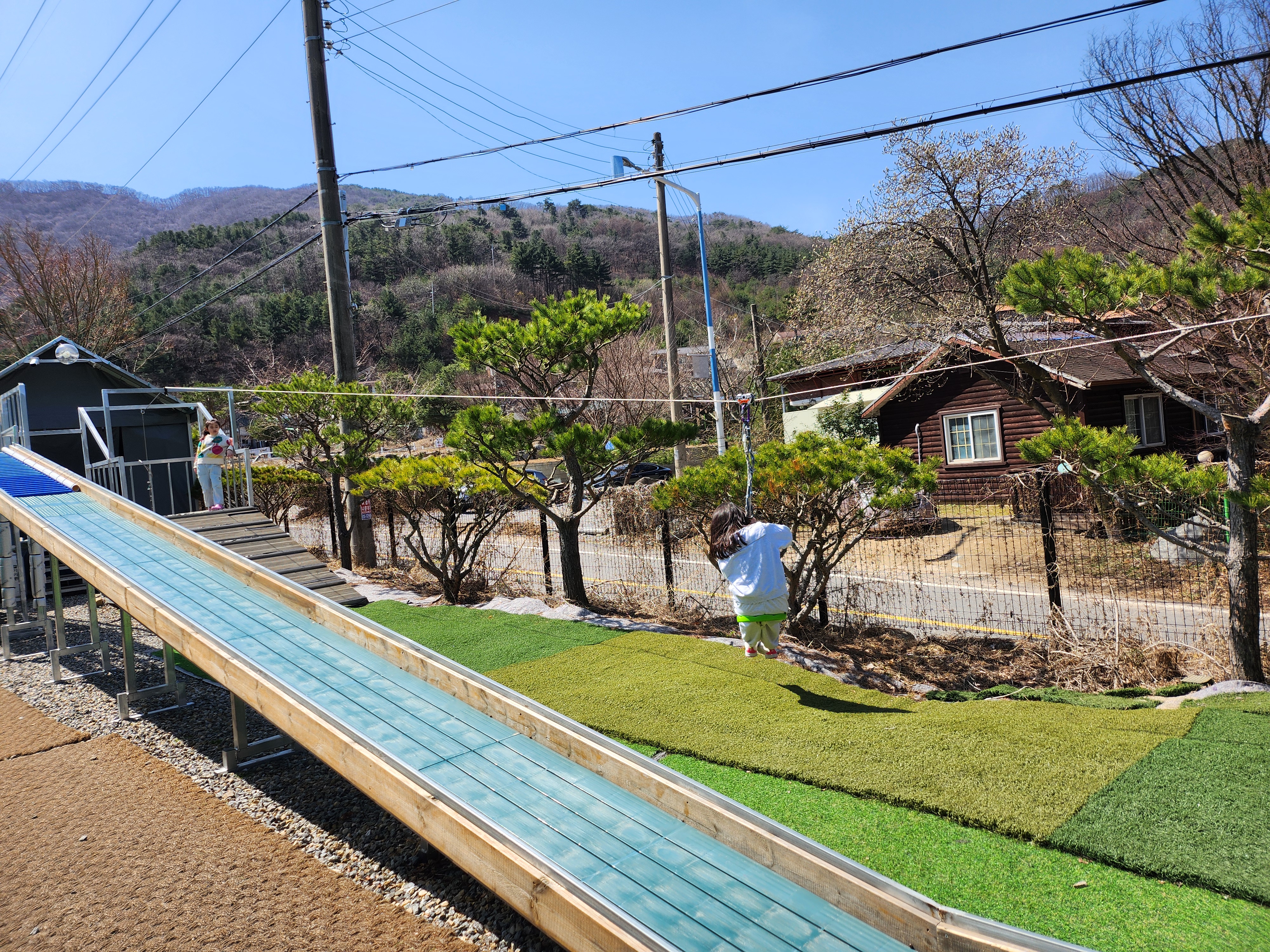 놀이시설인 레일썰매와 짚라인, 방방입니다. 짚라인은 마지막에 꽤 높이까지 올라가서 처음에 6살 둘째 아이는 좀 무서워했는데요. 익숙해지니 재밌다고 엄청 탔습니다. 레일썰매도 빨라서 큰애들도 좋아했어요!