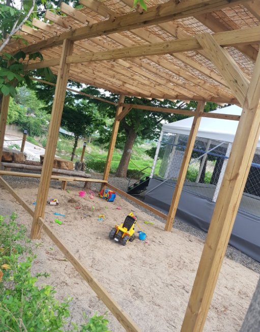 소규모 캠핑장이어서 놀이시설 한데 모여있어서 어린 친구들 놀기 좋아 보여요. 키즈시설로 짚라인, 트램폴린이 있어요.