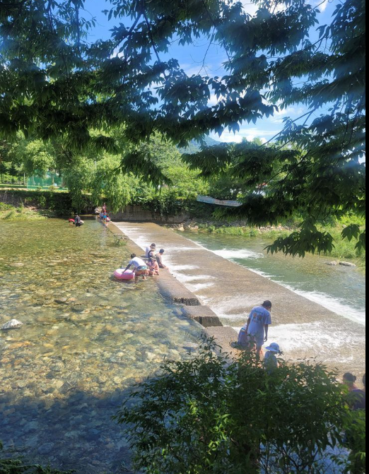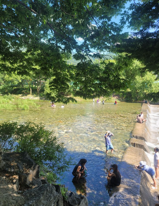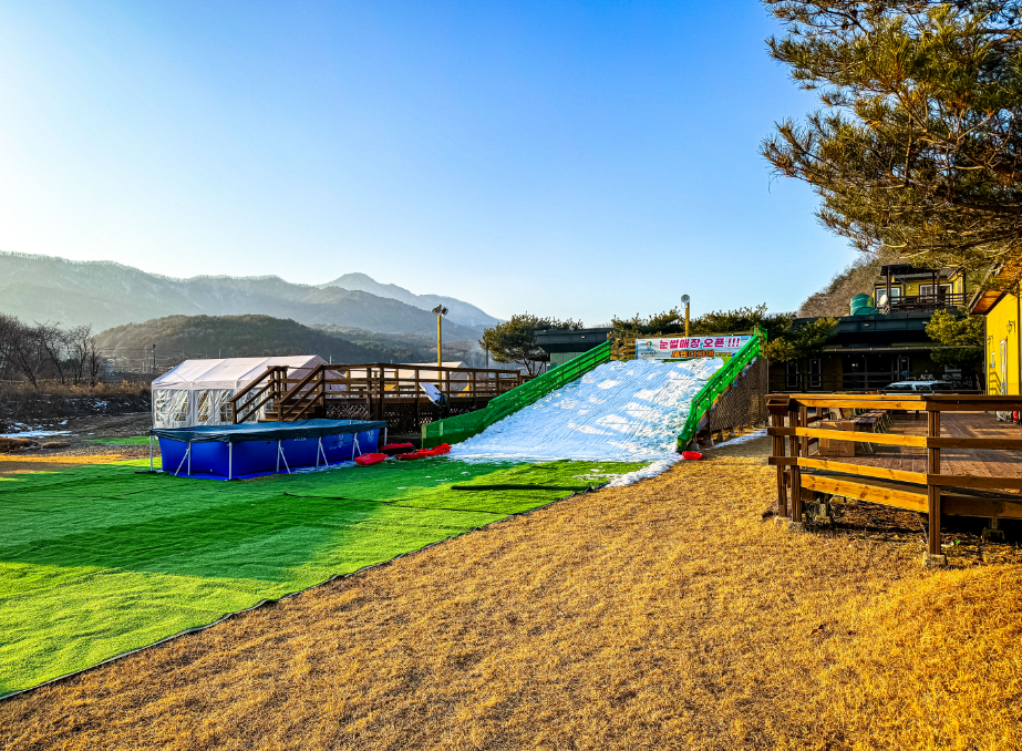 대형트램폴린, 수영장, 배드민턴장이 있고 계곡에서 낚시, 다슬기 잡기 가능하다고 해요.