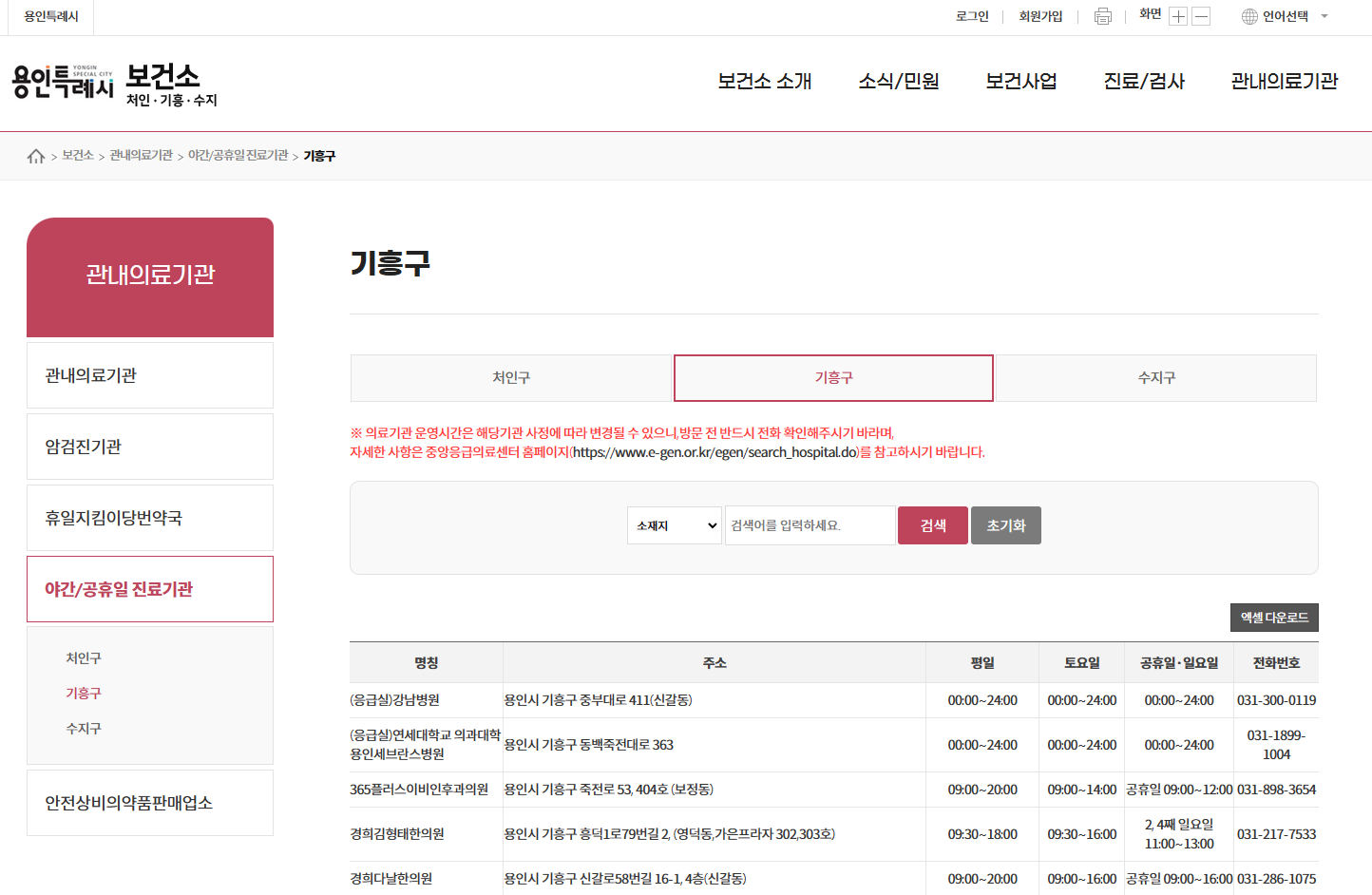 용인시 보건소 홈페이지 내에서 야간/공휴일 진료기관을 확인할 수 있어요.